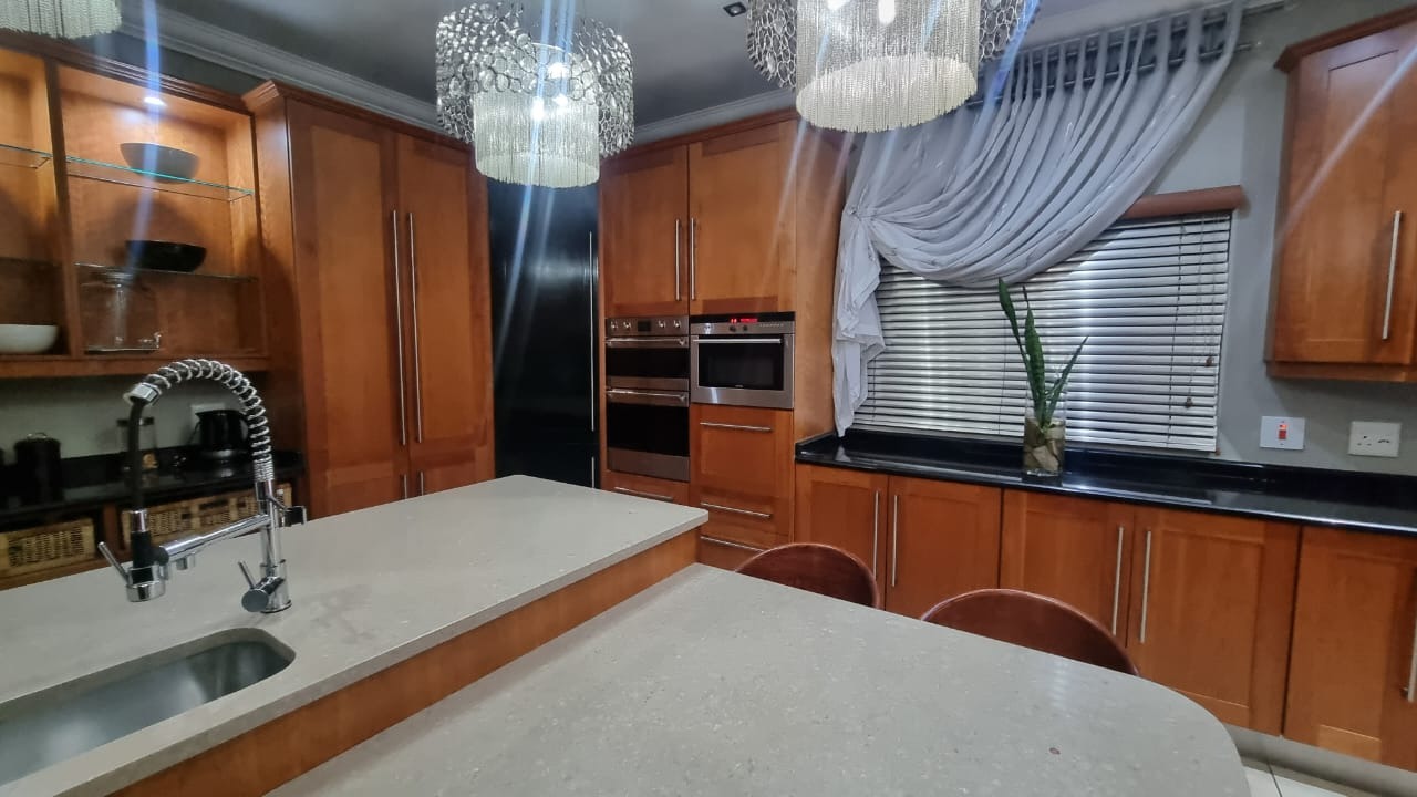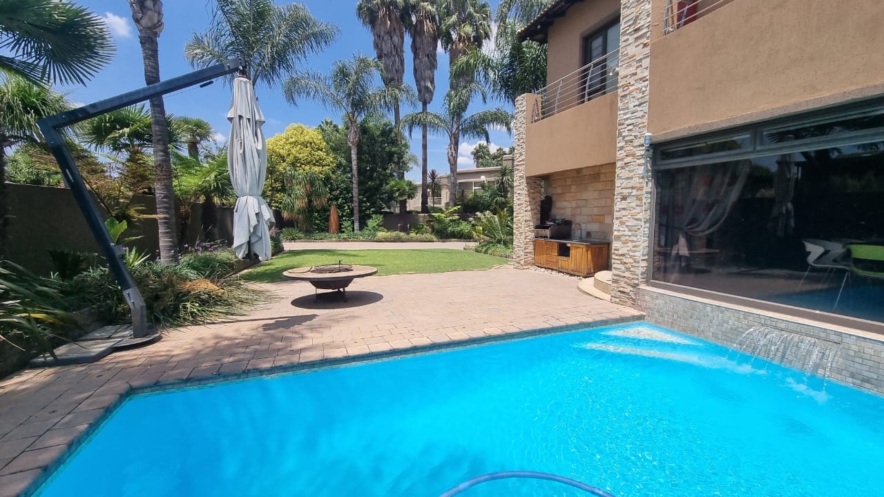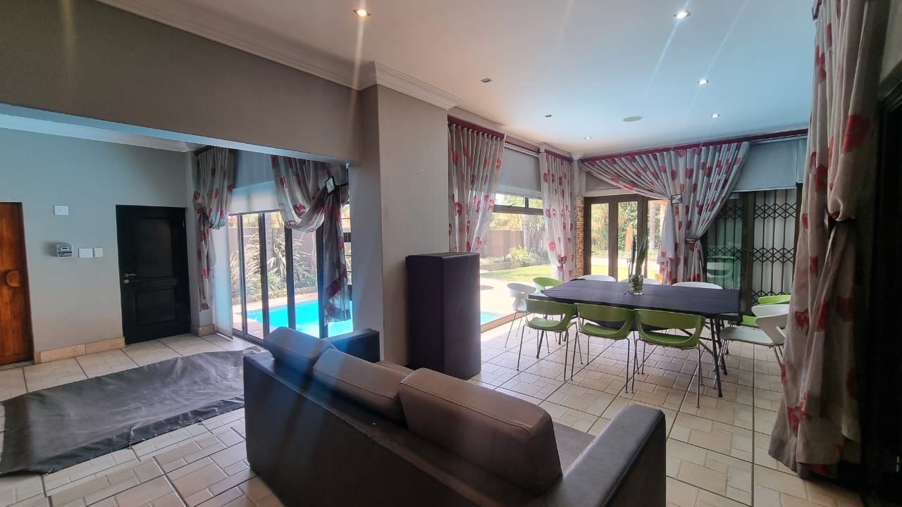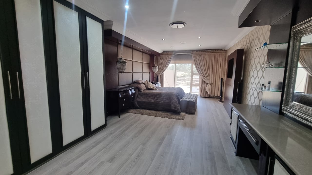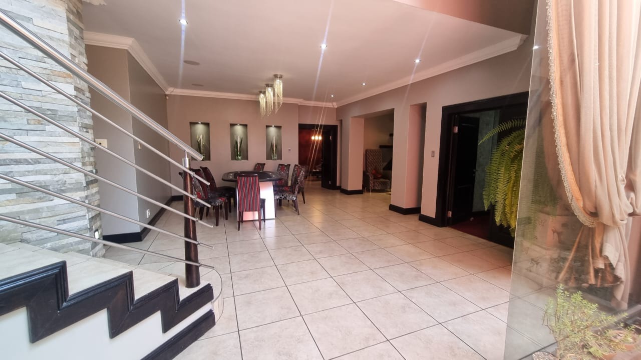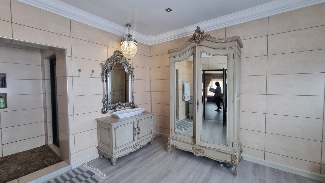 The residence offers six garages and a brand-new solar system that powers the geysers and the entire home, ensuring both luxury and sustainability. For relaxation and entertainment, you'll find a lovely jacuzzi that opens onto the pool, complemented by a sauna and a built-in kitchen area for convenience.