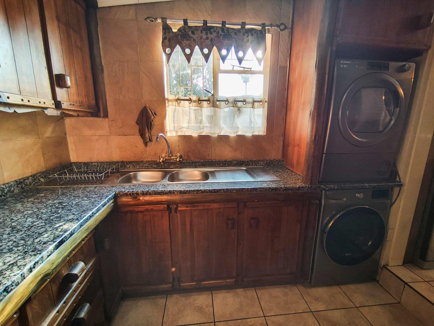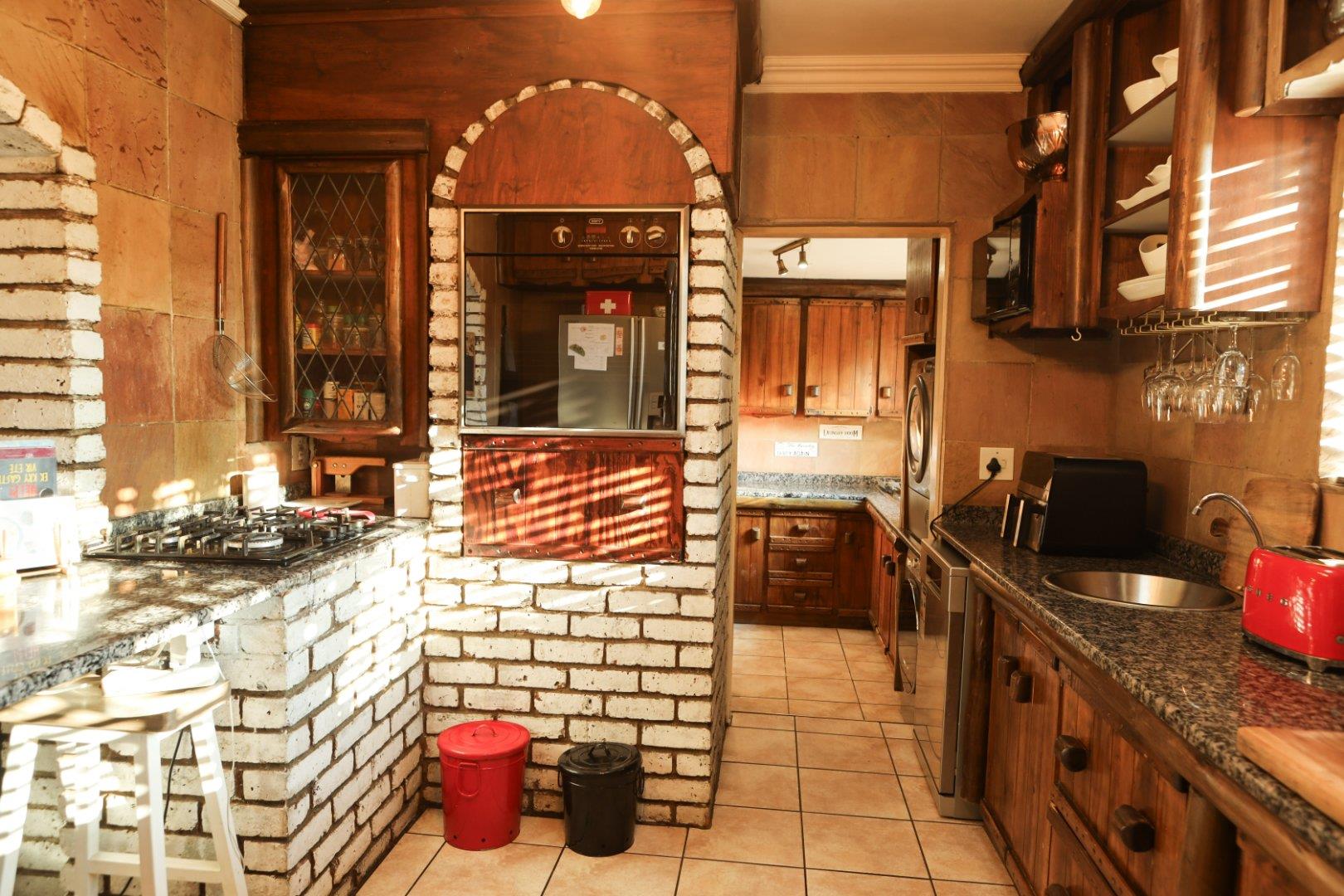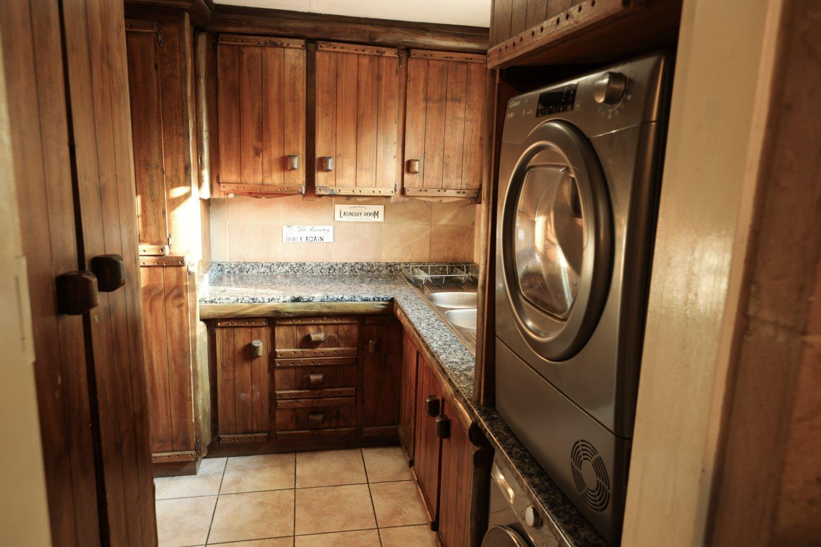 The kitchen is a solid wood kitchen with granite tops. There is space for a large double door fridge freezer. A seperate large laundry/scullery area with ample cupboard space will keep all the clutter out of the kitchen. The stove is a five burner gas stove.