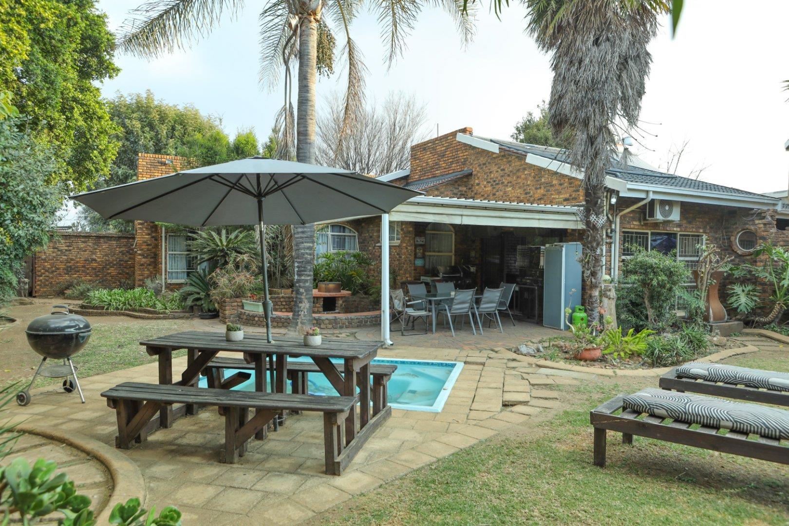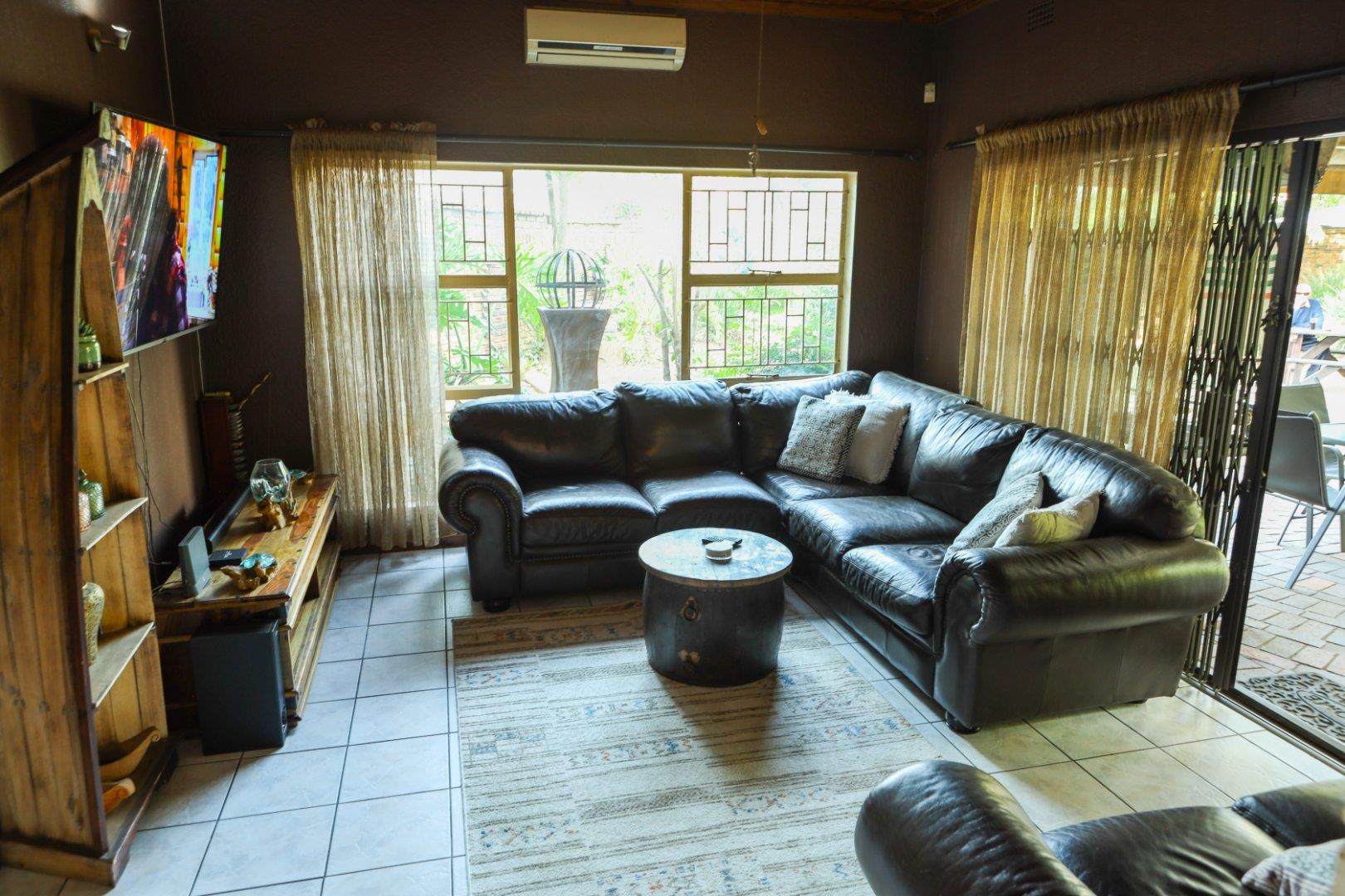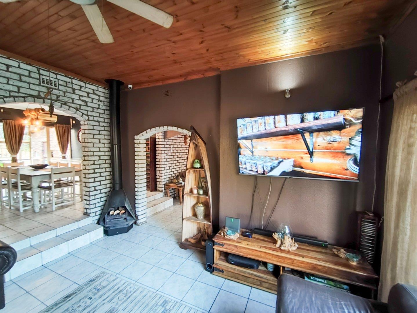 The TV room leads out to the covered patio with a boma firepit and splash pool all situated in a well manicured garden.