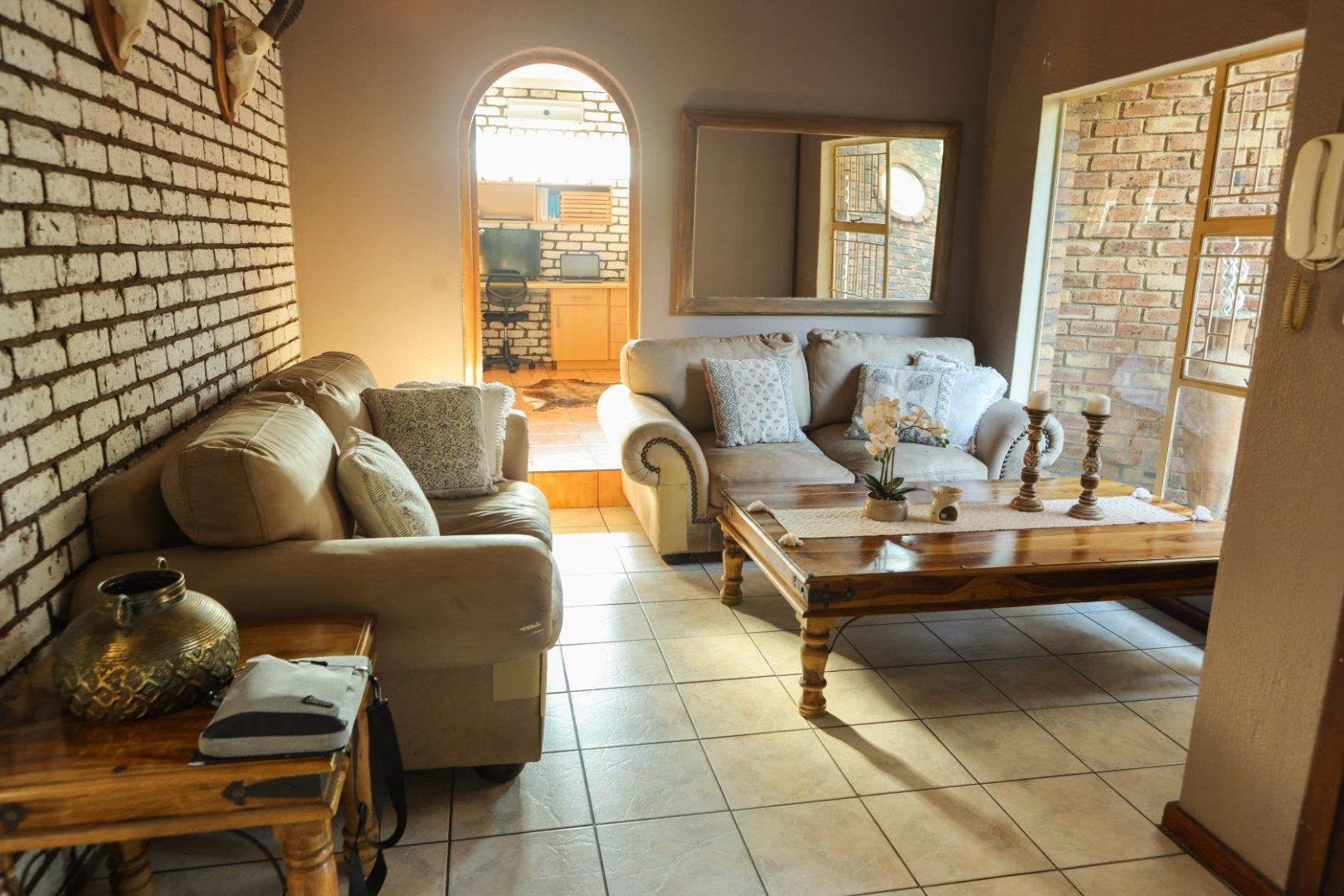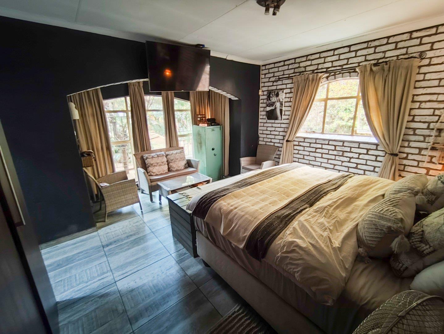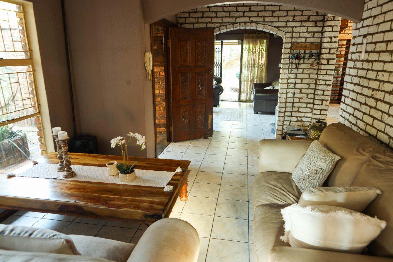 The TV room leads out to the covered patio with a boma firepit and splash pool all situated in a well manicured garden.