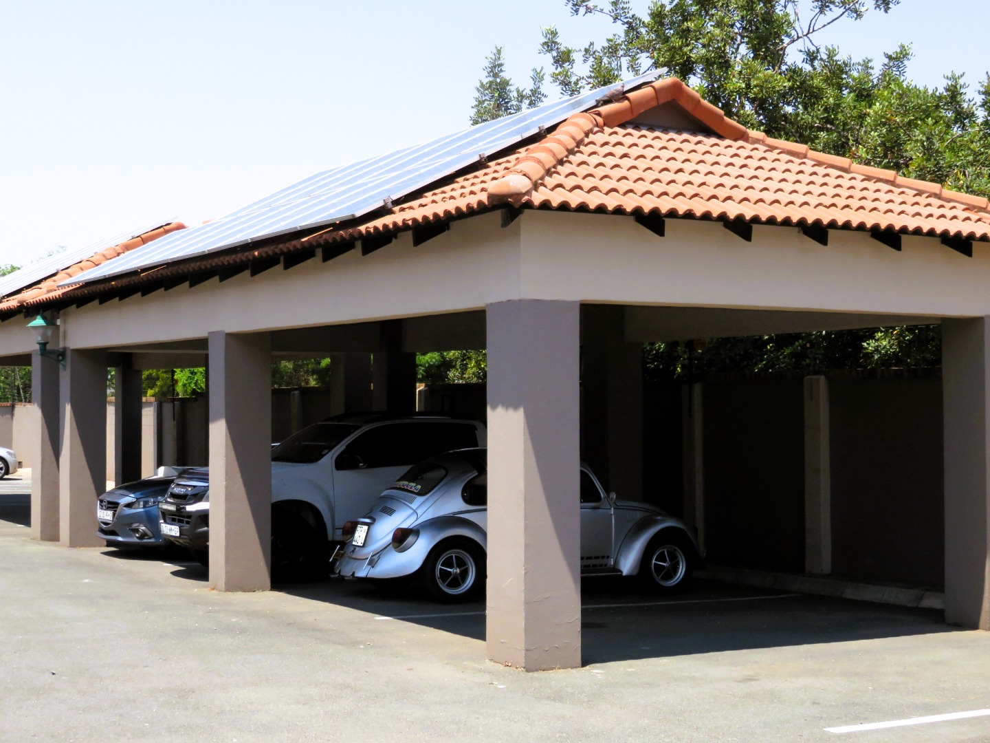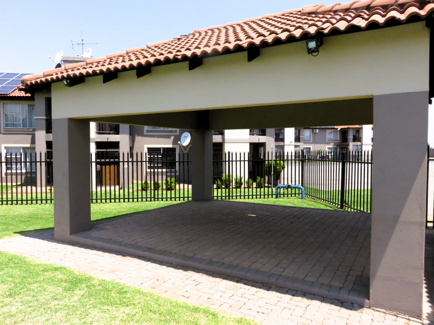 Outdoor amenities enhance the lifestyle, including a private garden and a communal pool for leisure. The property offers two covered parking bays under a tiled roof, complete with integrated solar panels for energy efficiency. Residents also benefit from a communal braai area, perfect for social gatherings. Security is paramount with 24-hour security, an access gate, security post, fencing, burglar bars, and security gates, ensuring peace of mind. Fibre connectivity is also available.