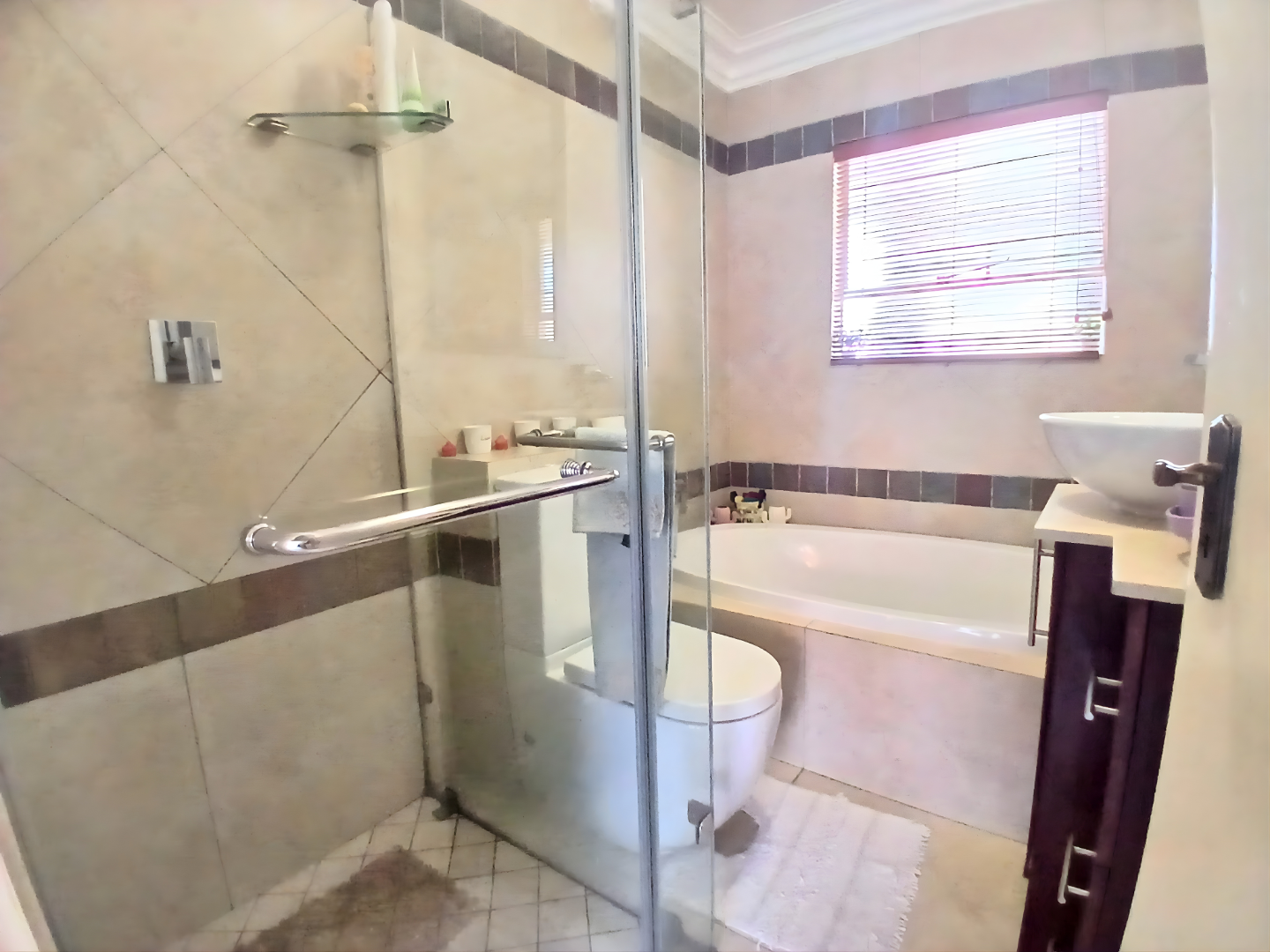 The two well-appointed bedrooms offer comfortable retreats, each featuring modern designs and built-in wardrobes for organized storage. Large windows, fitted with blinds and curtains, invite natural light while ensuring privacy. The contemporary bathroom is equipped with both a separate walk-in glass-enclosed shower and a bathtub, alongside a chic vessel sink and tiled finishes.