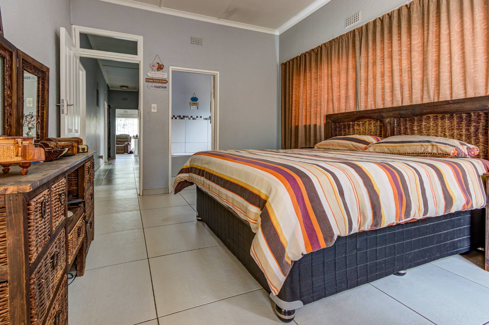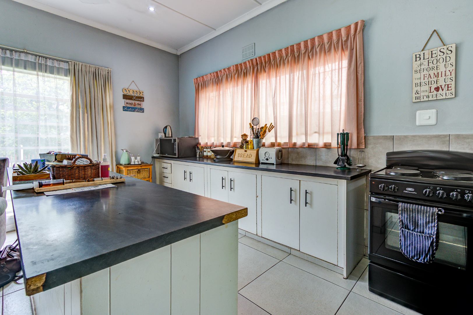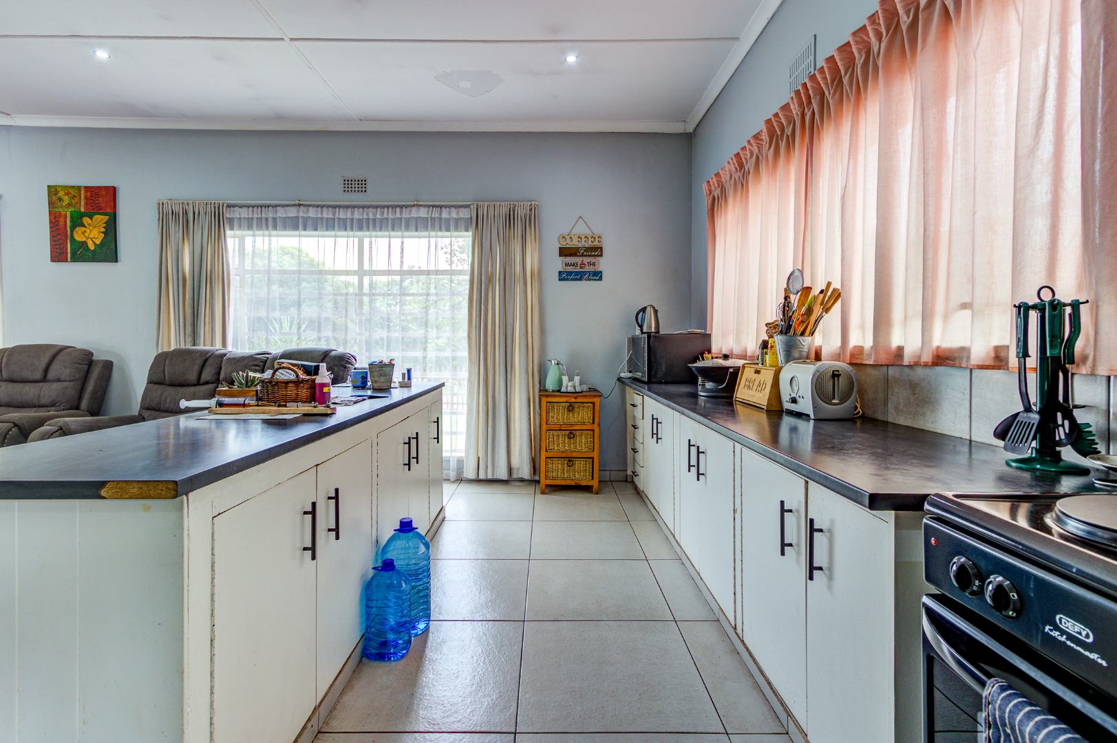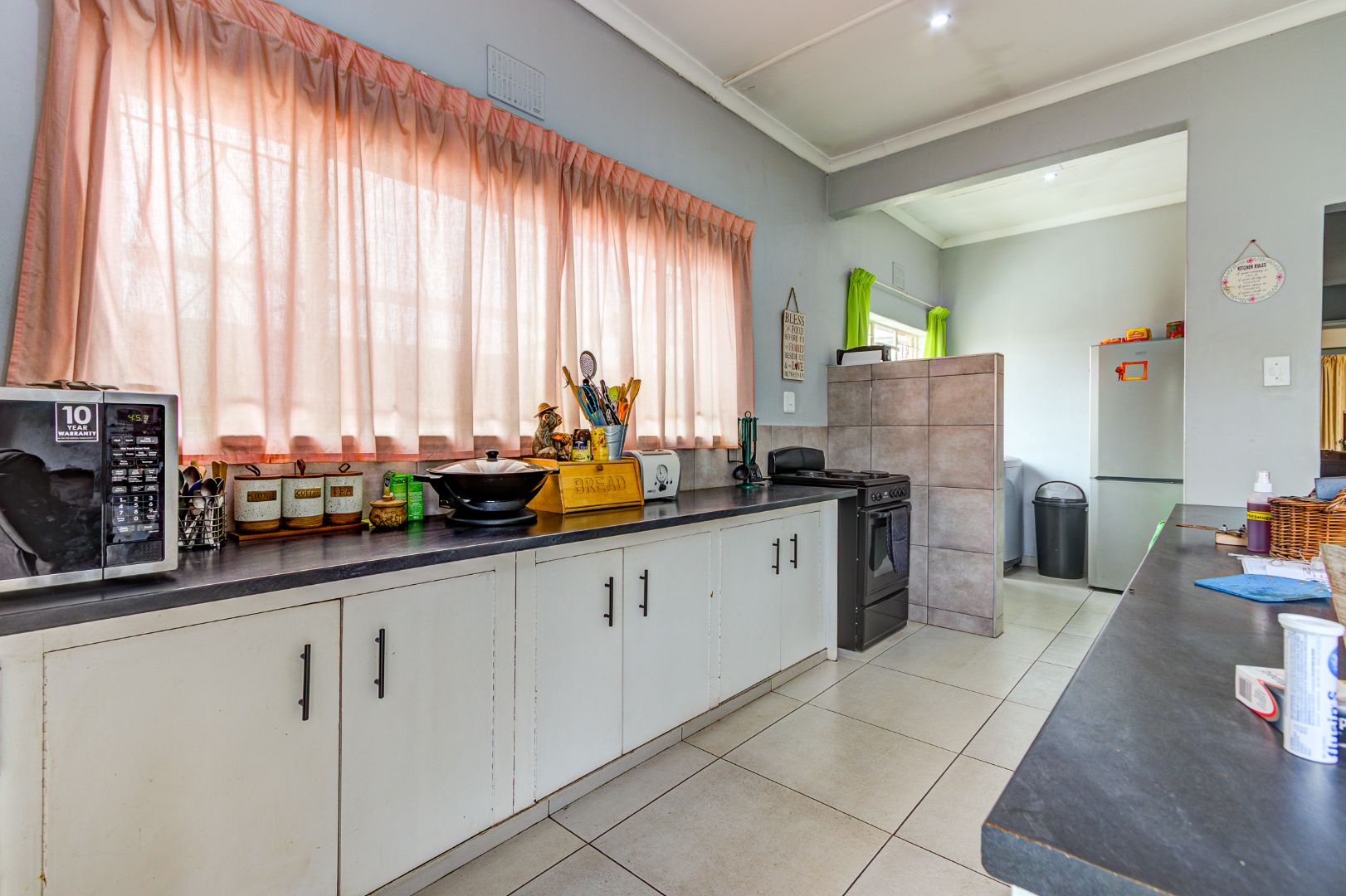 The open-plan lounge flows seamlessly into the kitchen, creating a warm and welcoming atmosphere. The kitchen offers ample built-in cupboards and is fitted with a 4-plate electric stove, making everyday cooking both practical and convenient.
