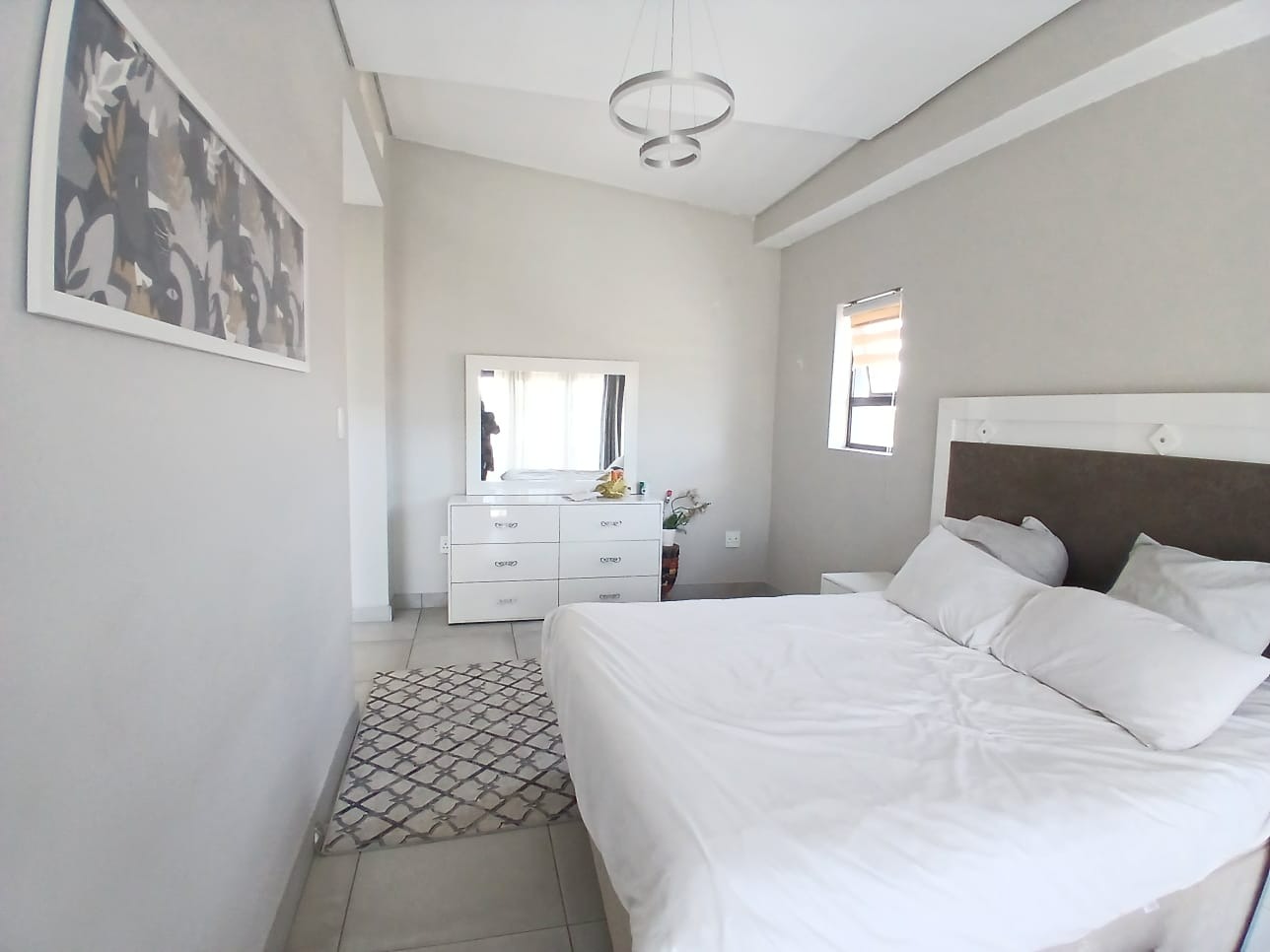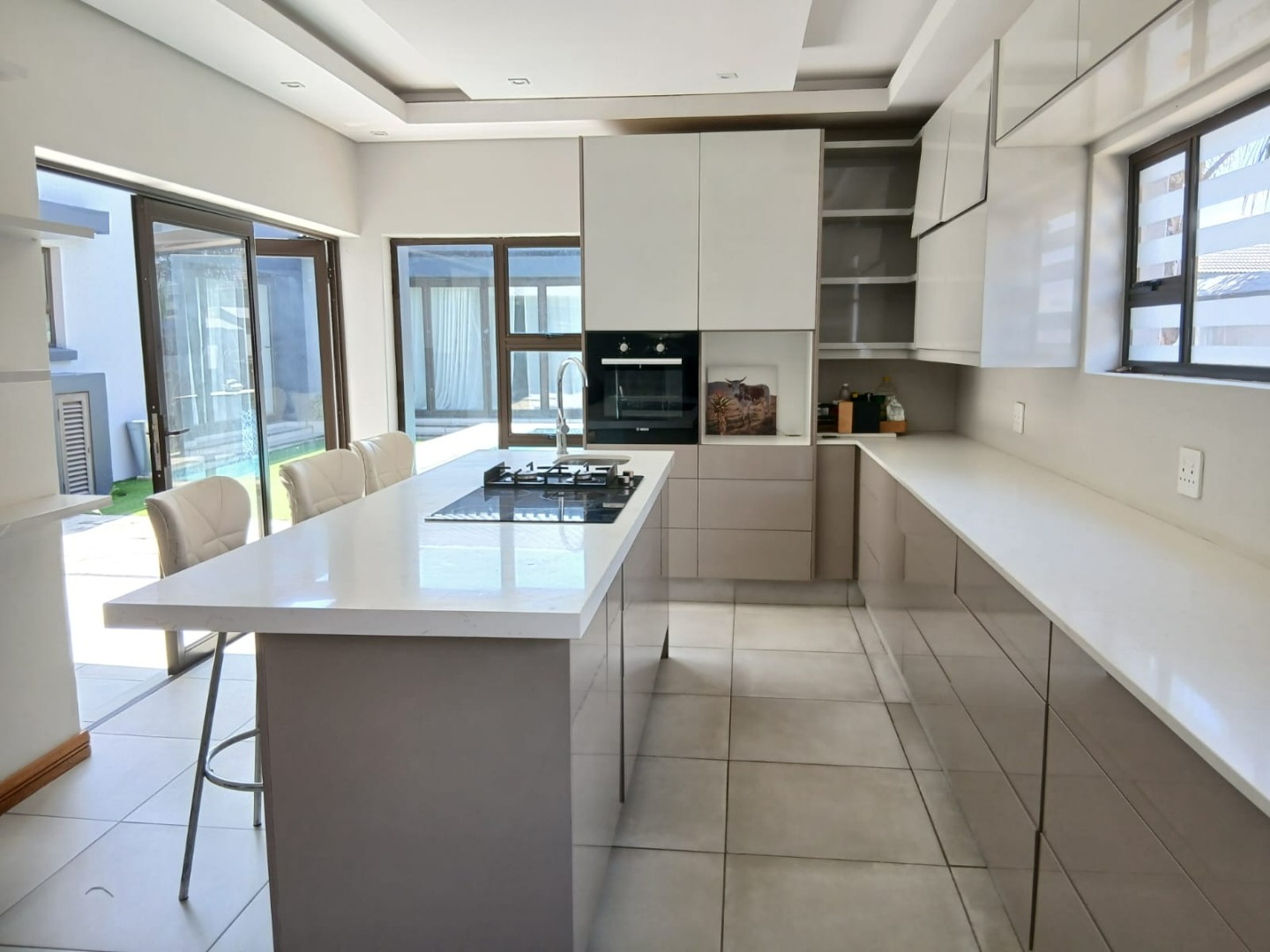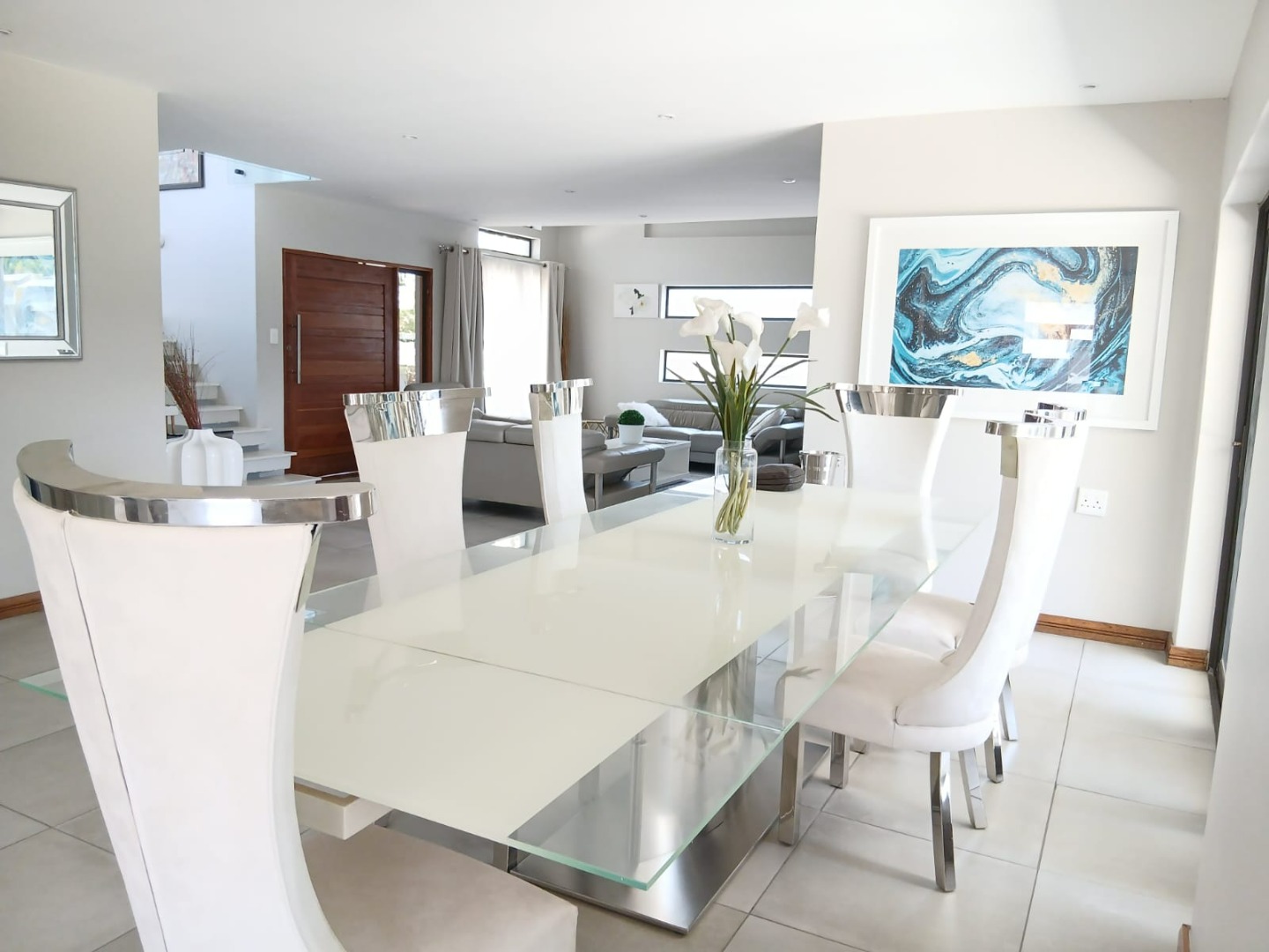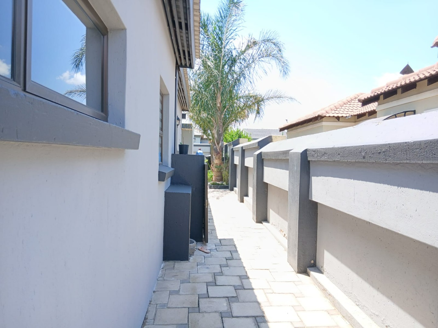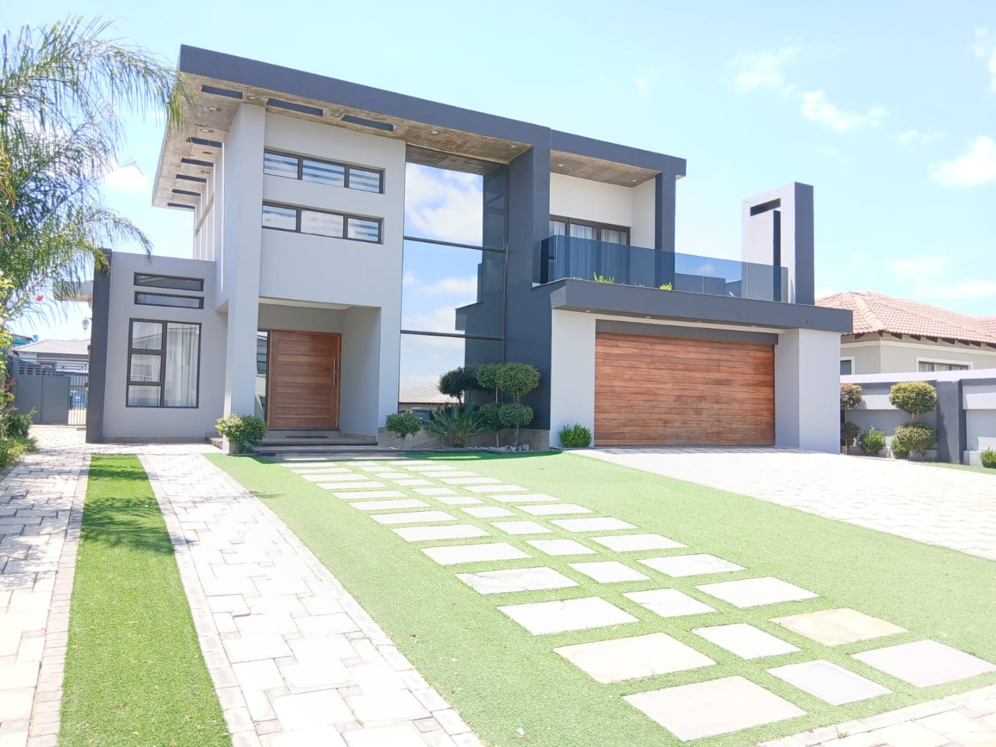 This distinguished residential offering presents a contemporary architectural masterpiece situated within the esteemed Helderwyk security estate in Brakpan, South Africa. The property's striking facade features a sophisticated palette of grey and white, complemented by warm natural wood accents. Expansive glass panels and a glass-railed balcony enhance the modern aesthetic, while the low-maintenance front yard, with artificial turf and elegant pavers, ensures minimal upkeep.