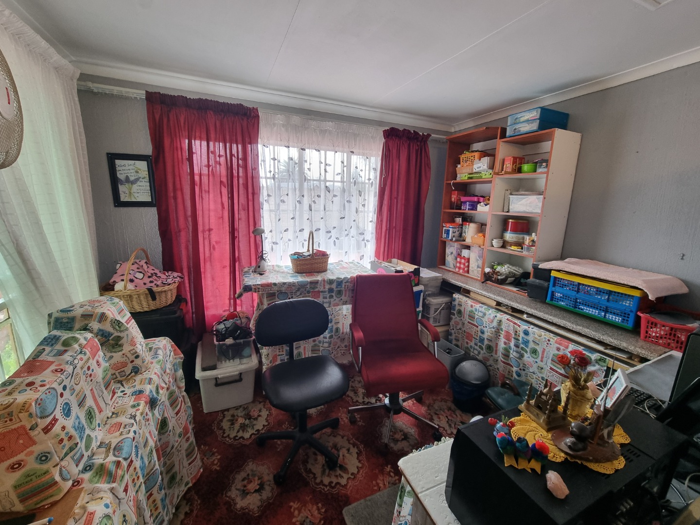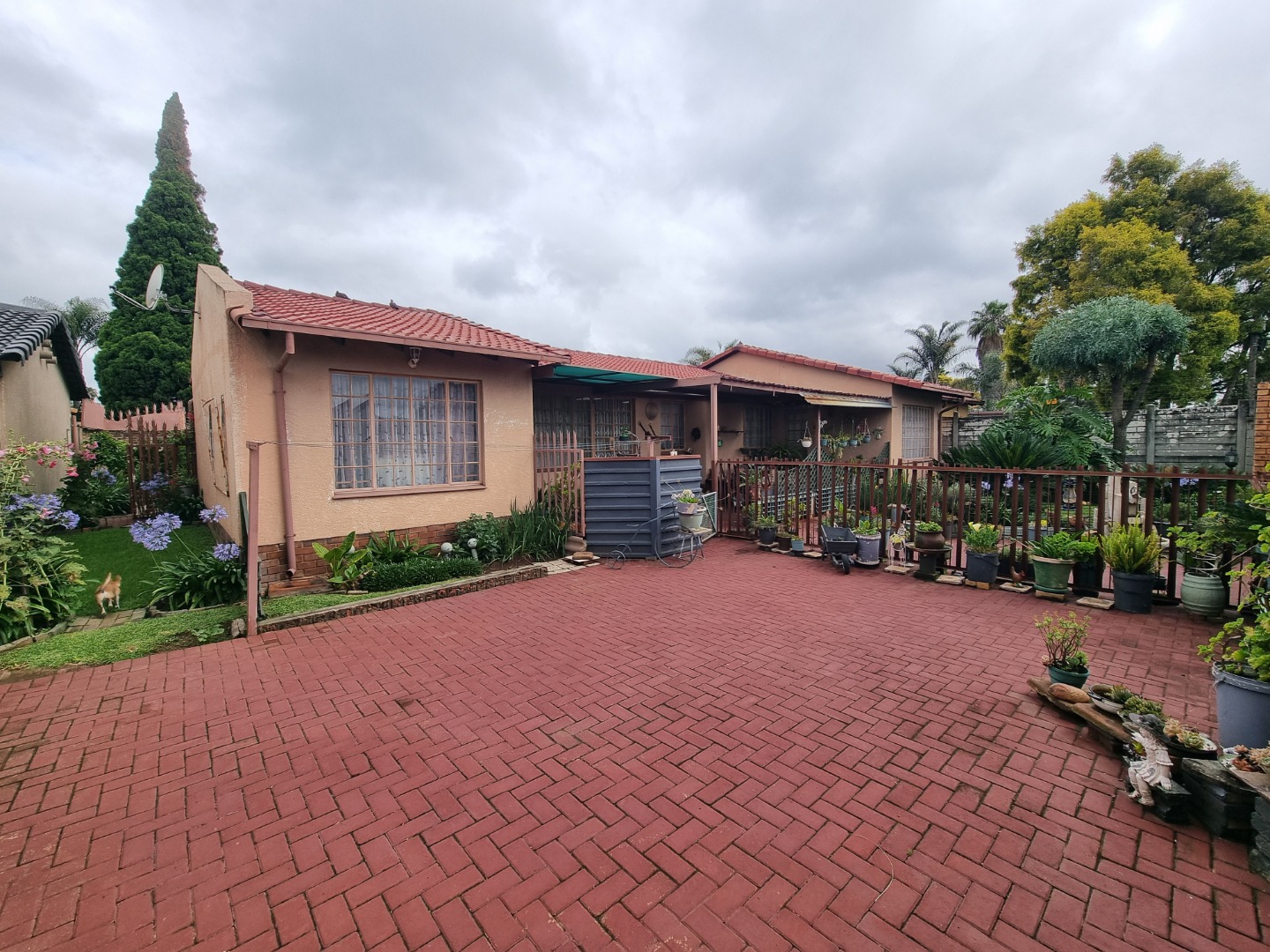 Discover this charming 3-bedroom, 2-bathroom family home nestled in a peaceful cul-de-sac within the suburban area of Huntingdon, Brakpan, South Africa. The property immediately impresses with its well-maintained front yard, featuring lush landscaping, a decorative fountain, and a red brick paved driveway leading to a secure front entrance. The exterior boasts a classic tiled roof and character-filled arched windows, creating a welcoming first impression on its 376 sqm erf.