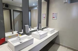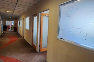 The interior layout is highly adaptable, with a large floor area that can be configured to suit diverse business needs. The property includes well-appointed kitchens, catering to the demands of a large workforce or multiple tenants. A long, carpeted office hallway provides access to numerous private offices.  Modern and clean public restrooms, equipped with multiple sinks, ensure comfort and convenience for all occupants.