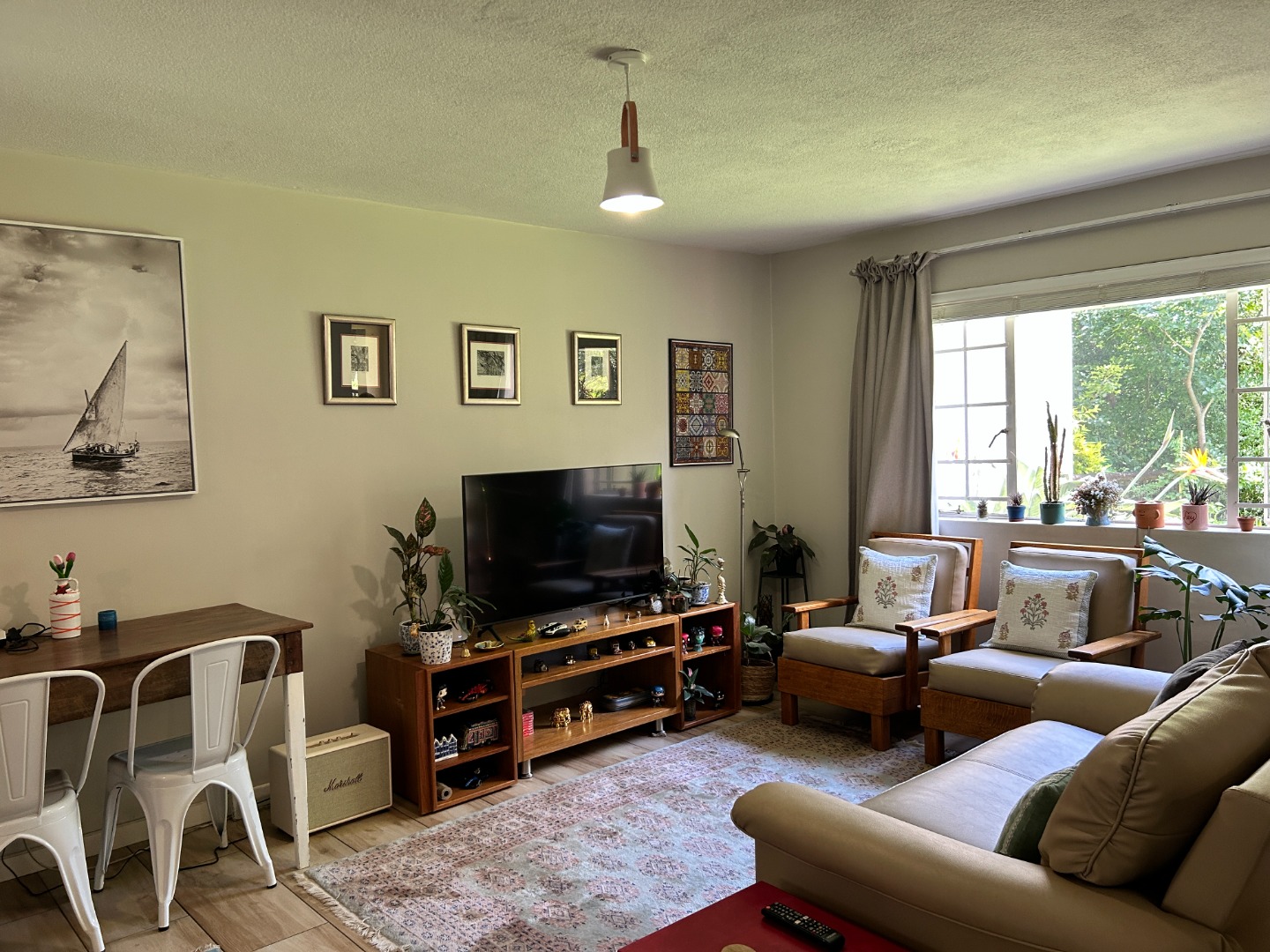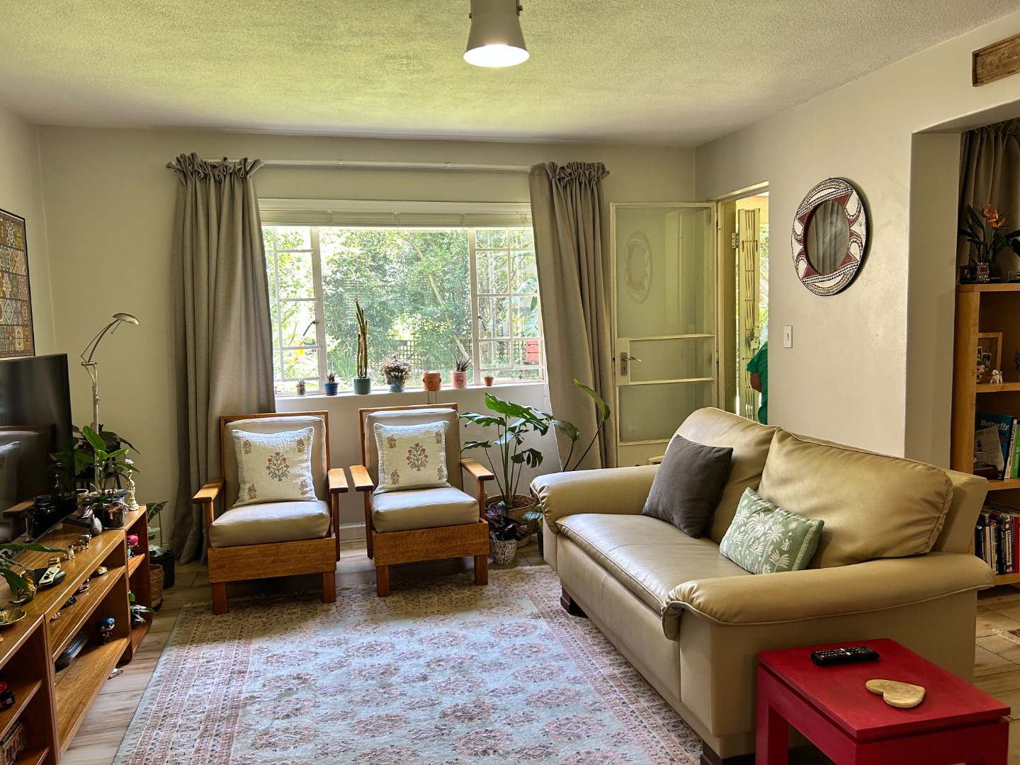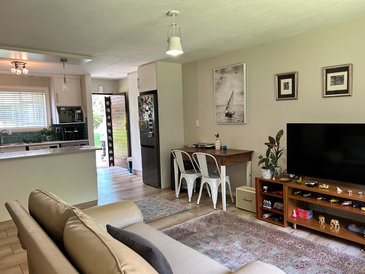 The living area flows directly onto a covered patio overlooking a notably large private garden—ideal for relaxed outdoor living, pets, or simply enjoying open space without the upkeep of a full-scale property.