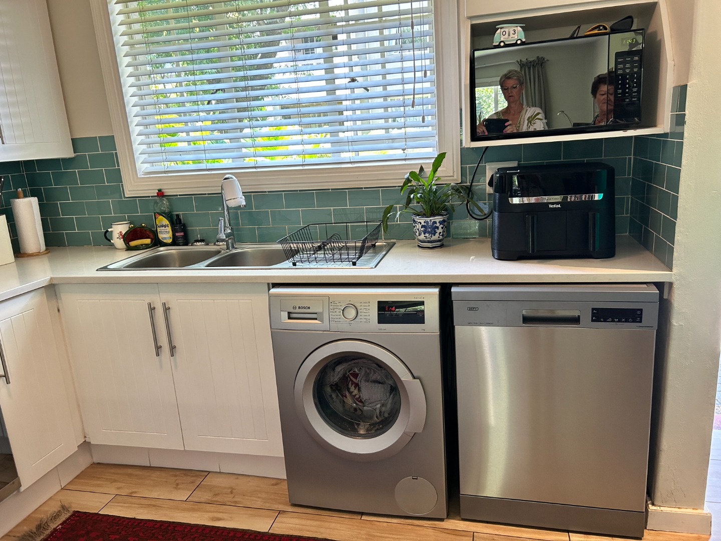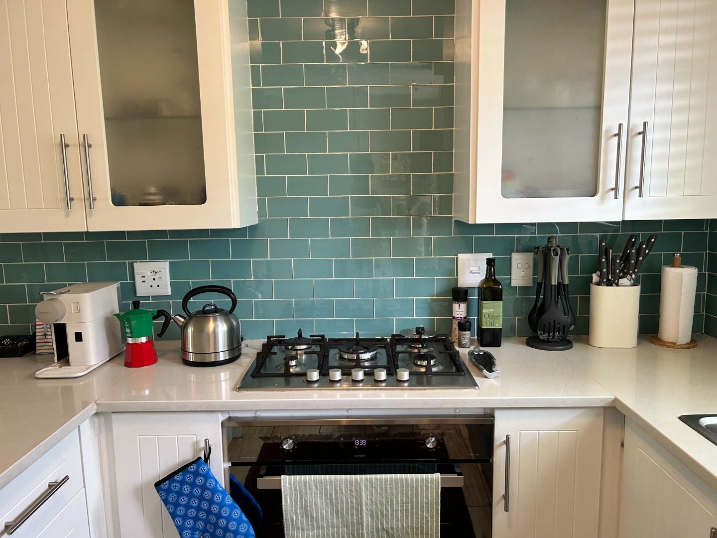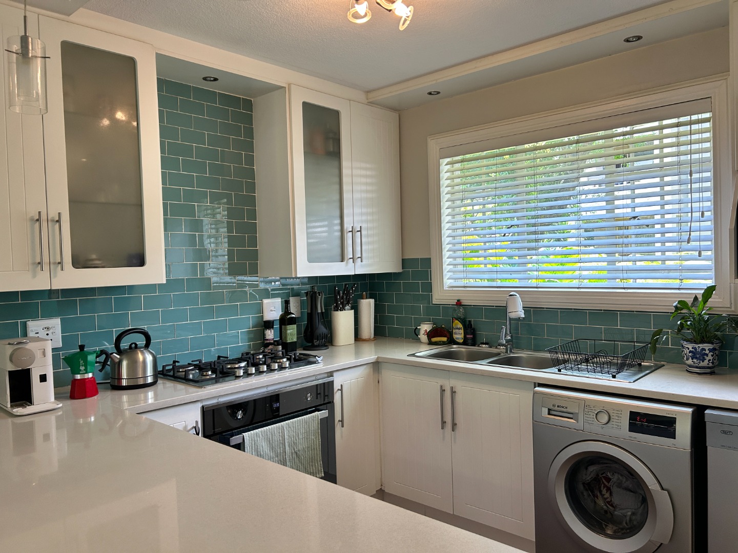 The kitchen is modern and thoughtfully appointed with granite countertops, aqua subway tile detailing, a gas hob, double sink, and space for two under-counter appliances. Ample cabinetry ensures everything has its place, supporting an organised, clutter-free environment.
