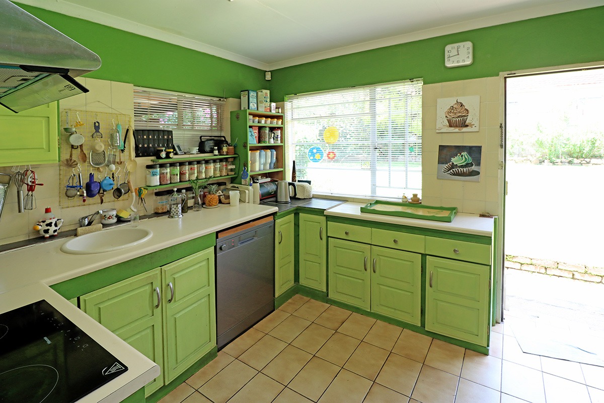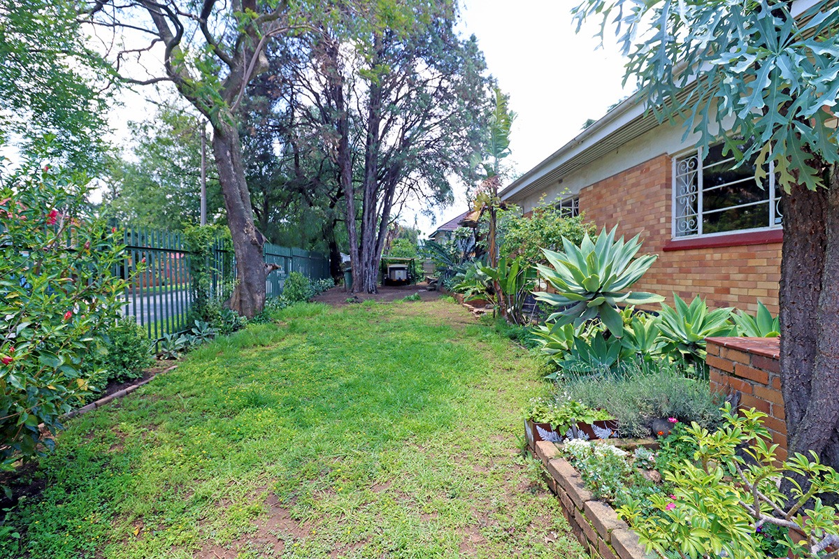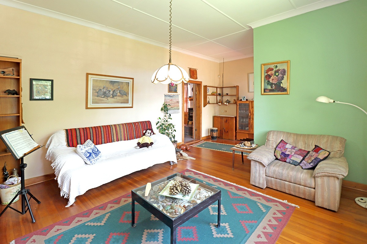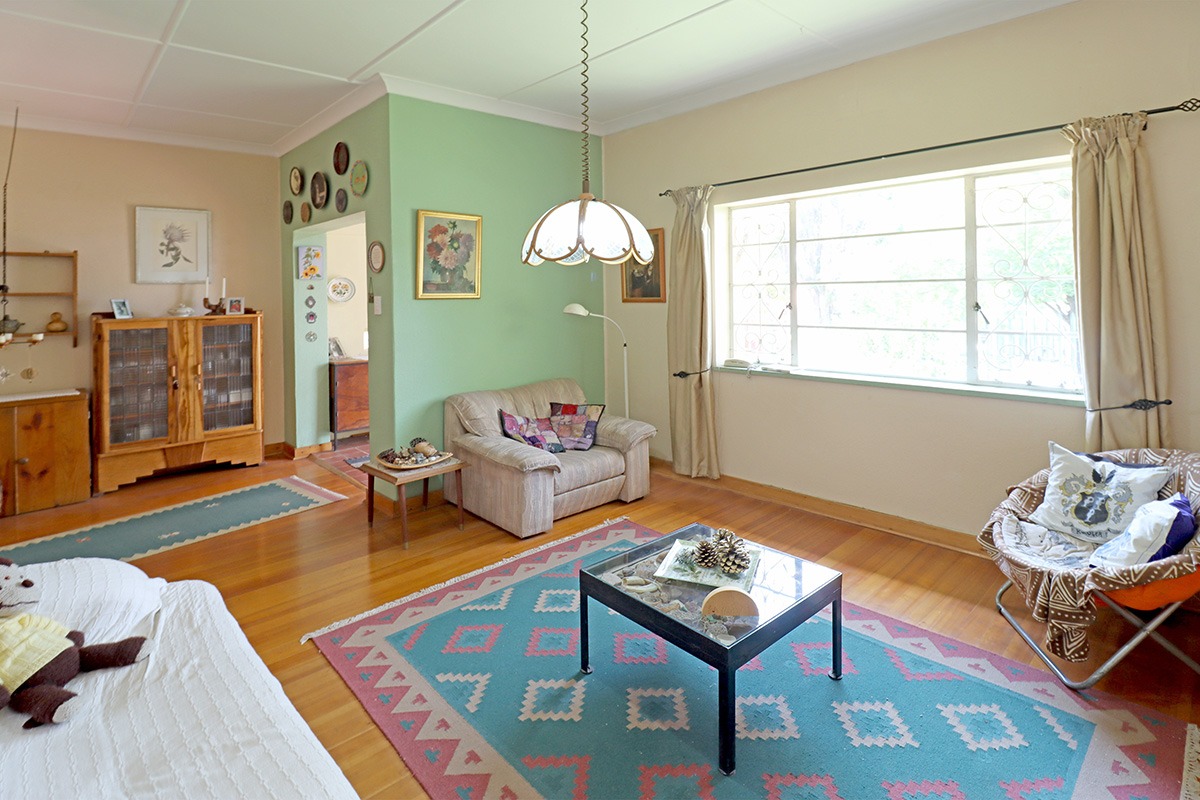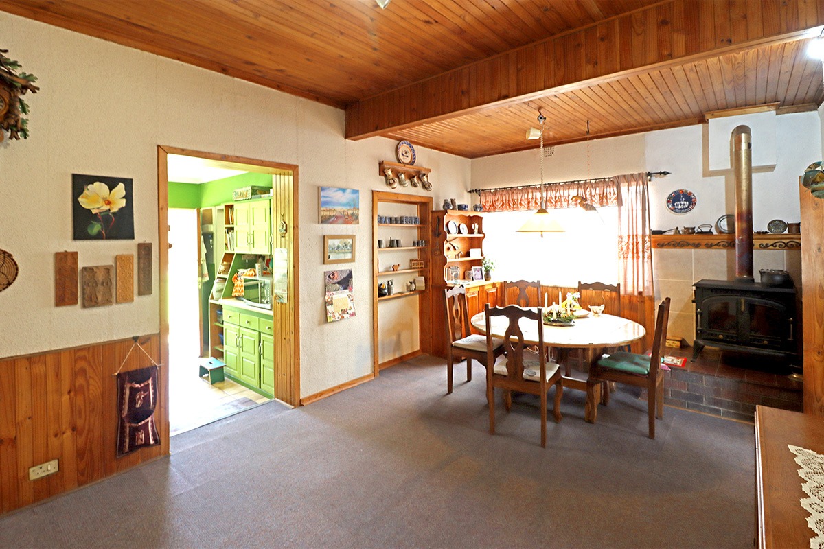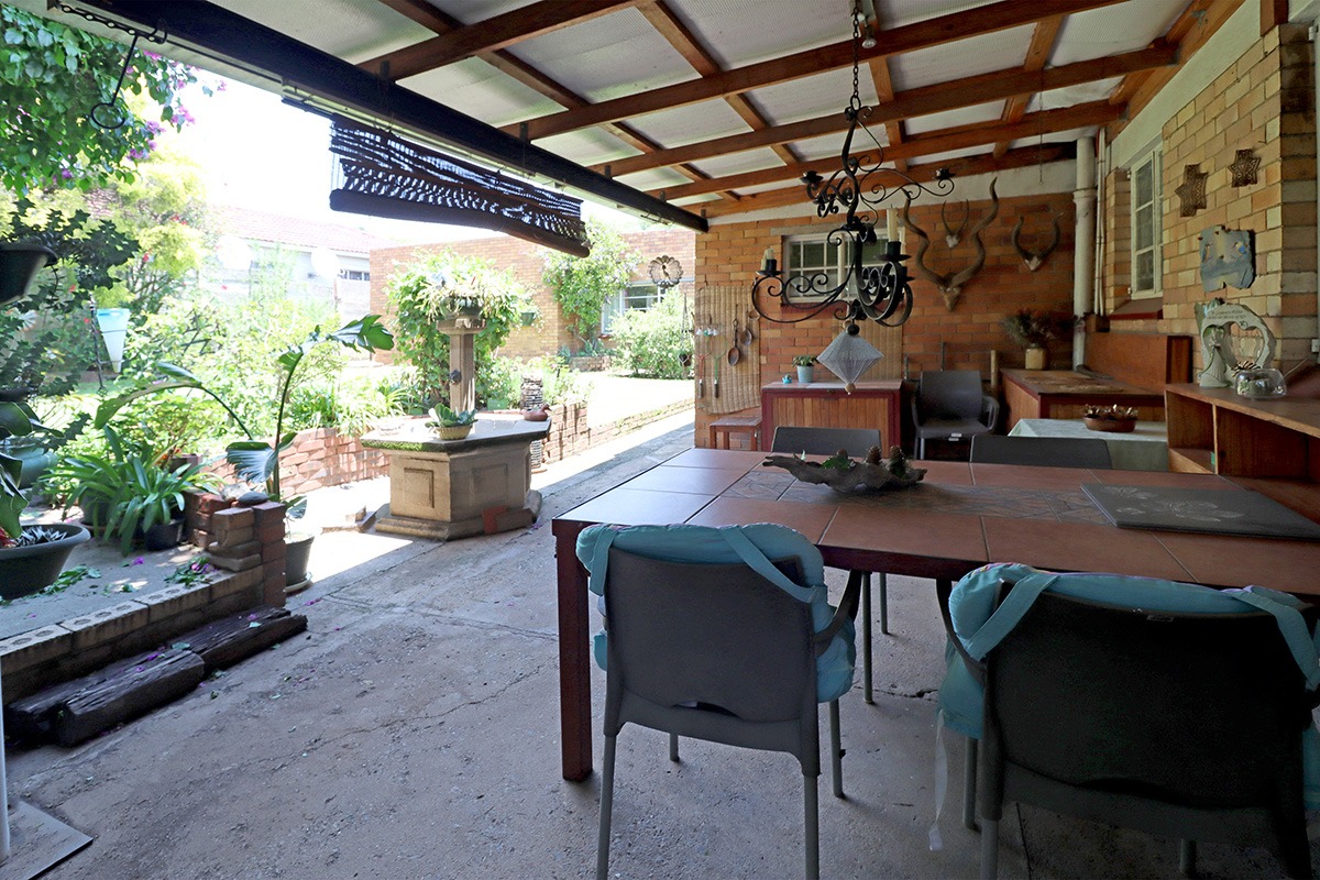 The home features a classic brick exterior complemented by a lush, mature garden with vibrant flowering plants, including bougainvillea, and expansive green lawns. Security bars on windows and doors provide peace of mind. The interior boasts a spacious living area with warm oregan pinewood flooring and ample natural light, creating an inviting atmosphere. A well-appointed kitchen with a pantry and a dedicated dining room with a classic woodburner fireplace, all cater to daily living and entertaining needs.