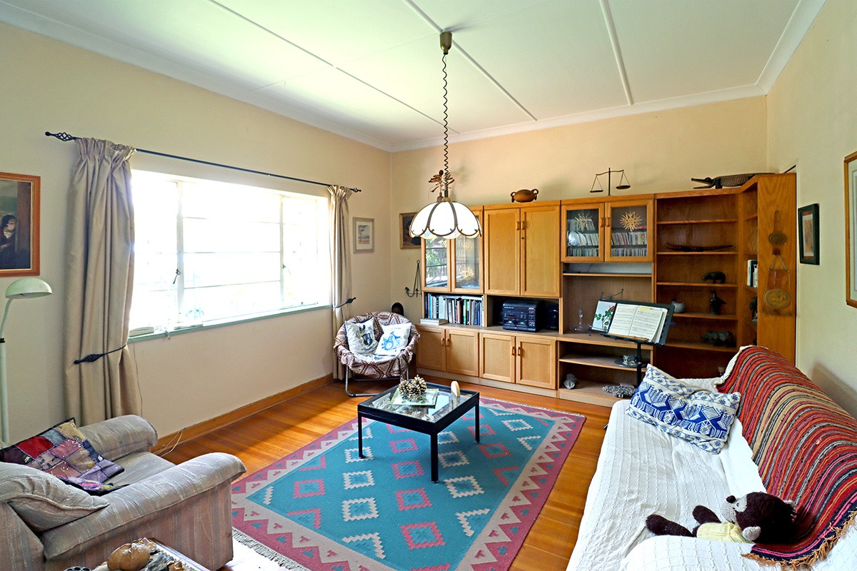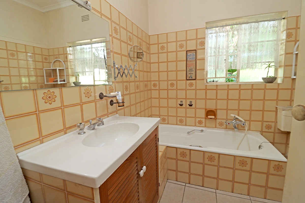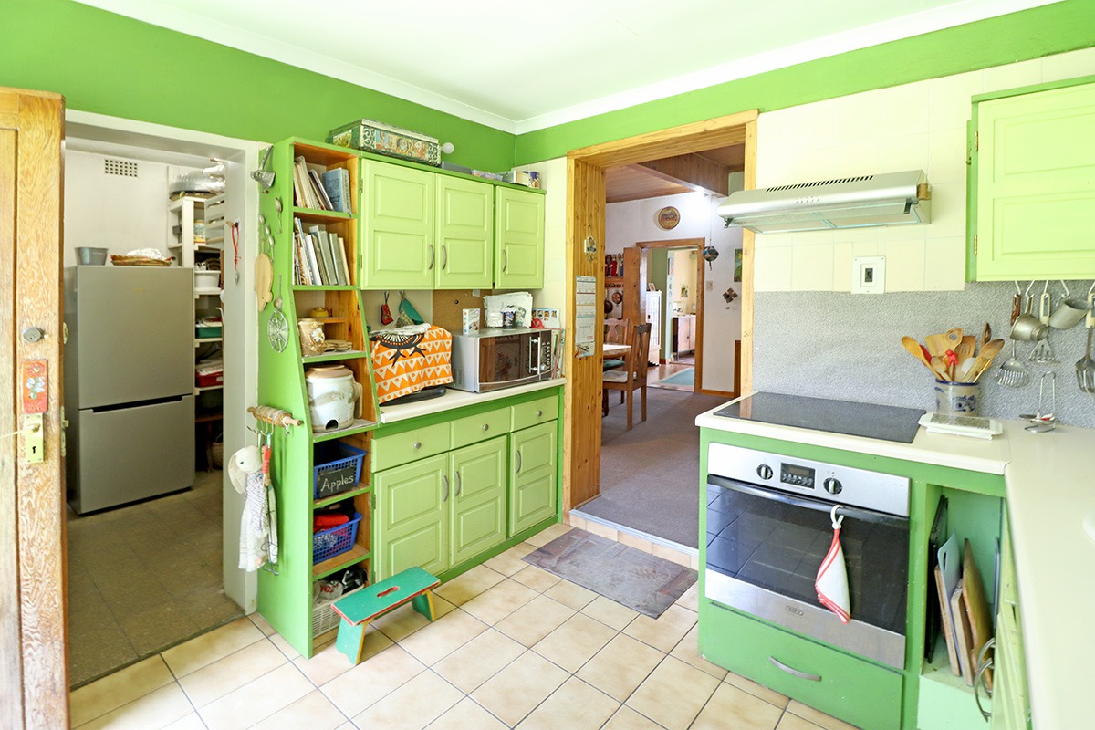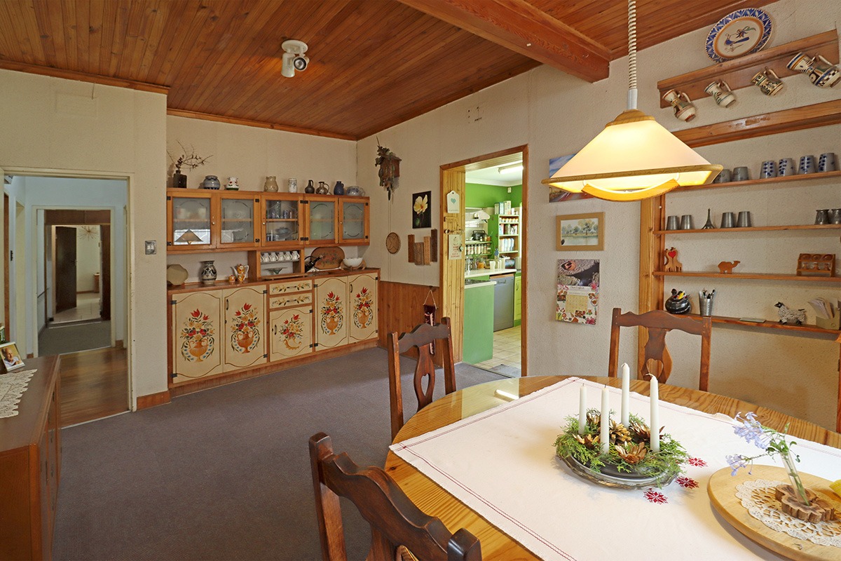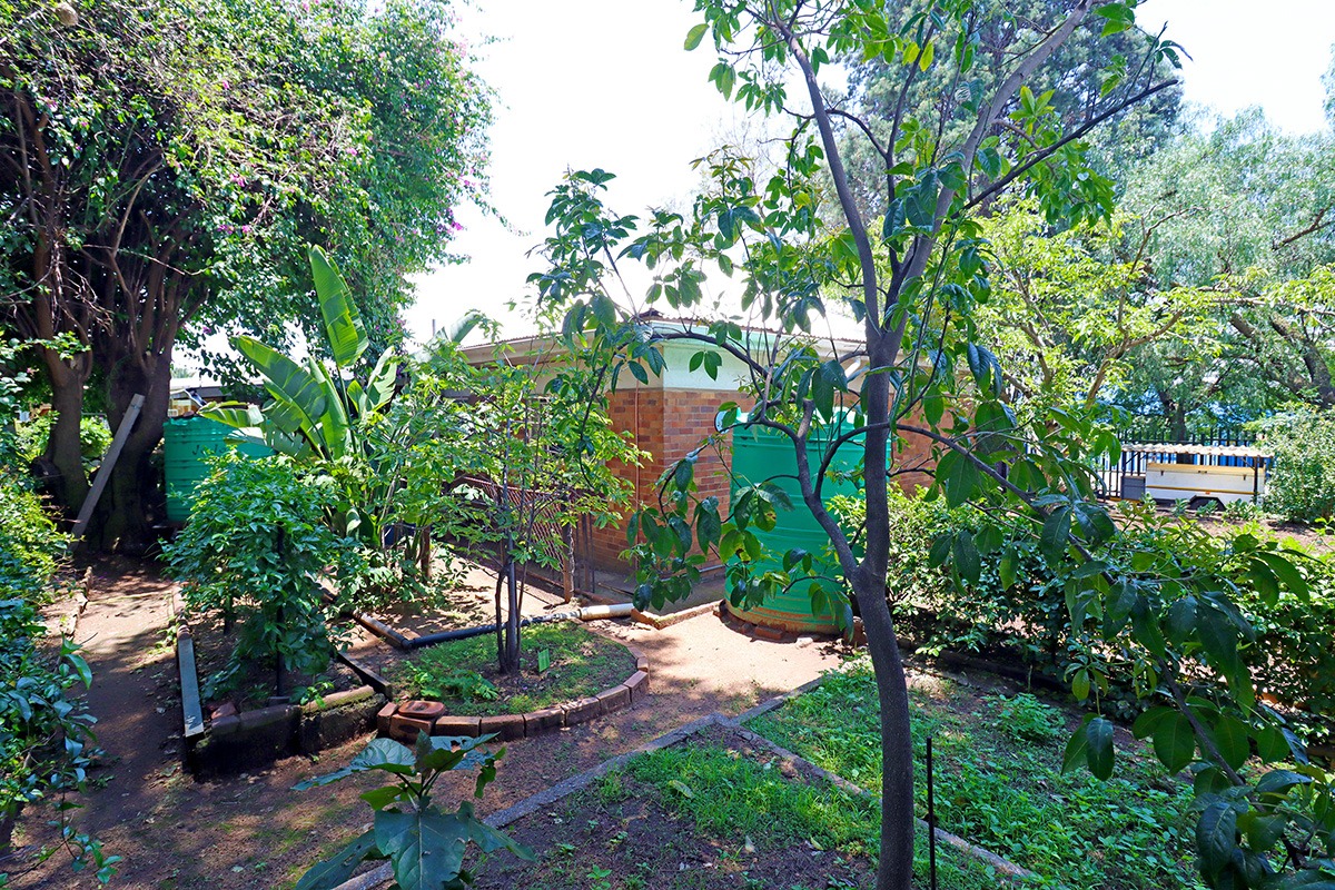 The home features a classic brick exterior complemented by a lush, mature garden with vibrant flowering plants, including bougainvillea, and expansive green lawns. Security bars on windows and doors provide peace of mind. The interior boasts a spacious living area with warm oregan pinewood flooring and ample natural light, creating an inviting atmosphere. A well-appointed kitchen with a pantry and a dedicated dining room with a classic woodburner fireplace, all cater to daily living and entertaining needs.