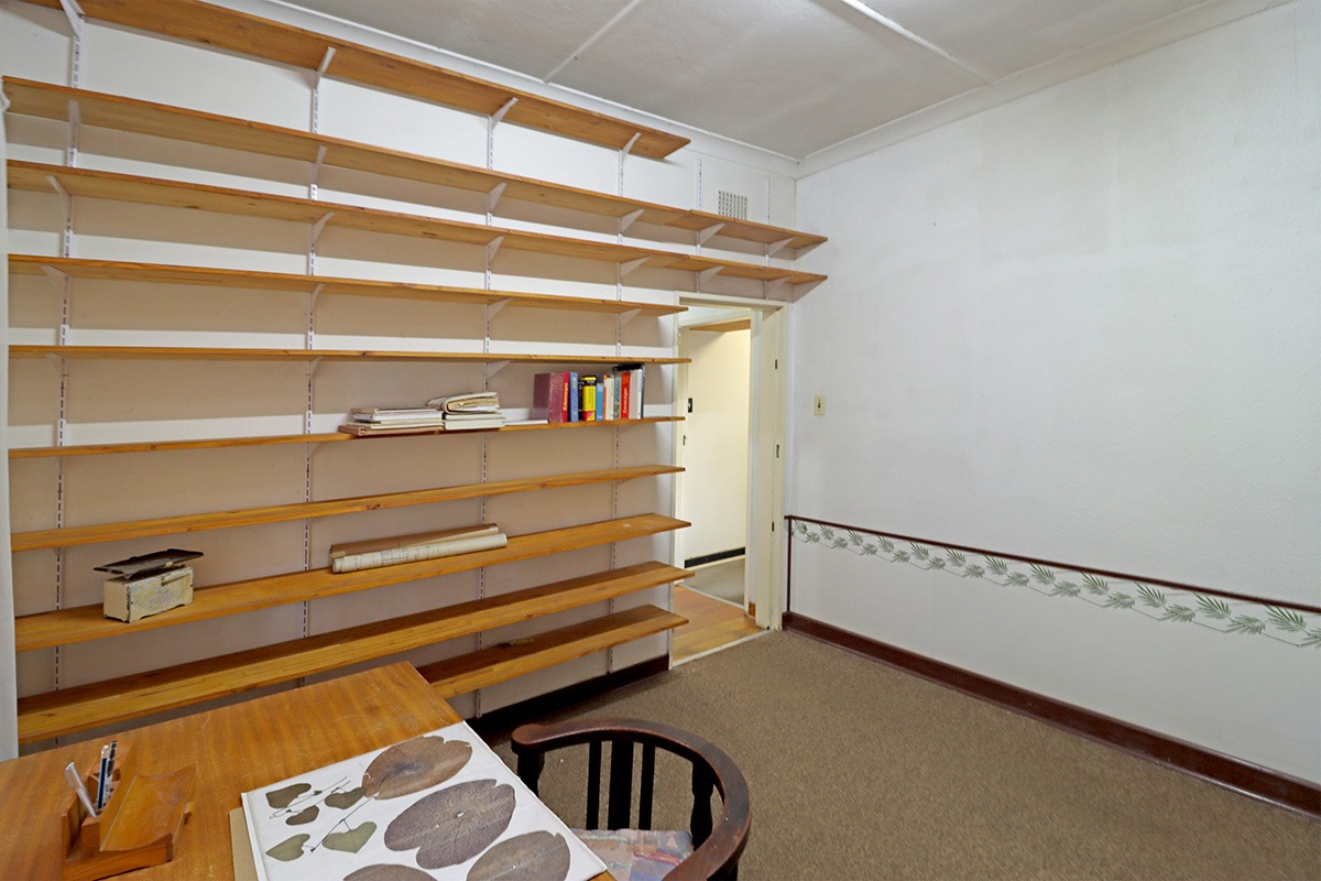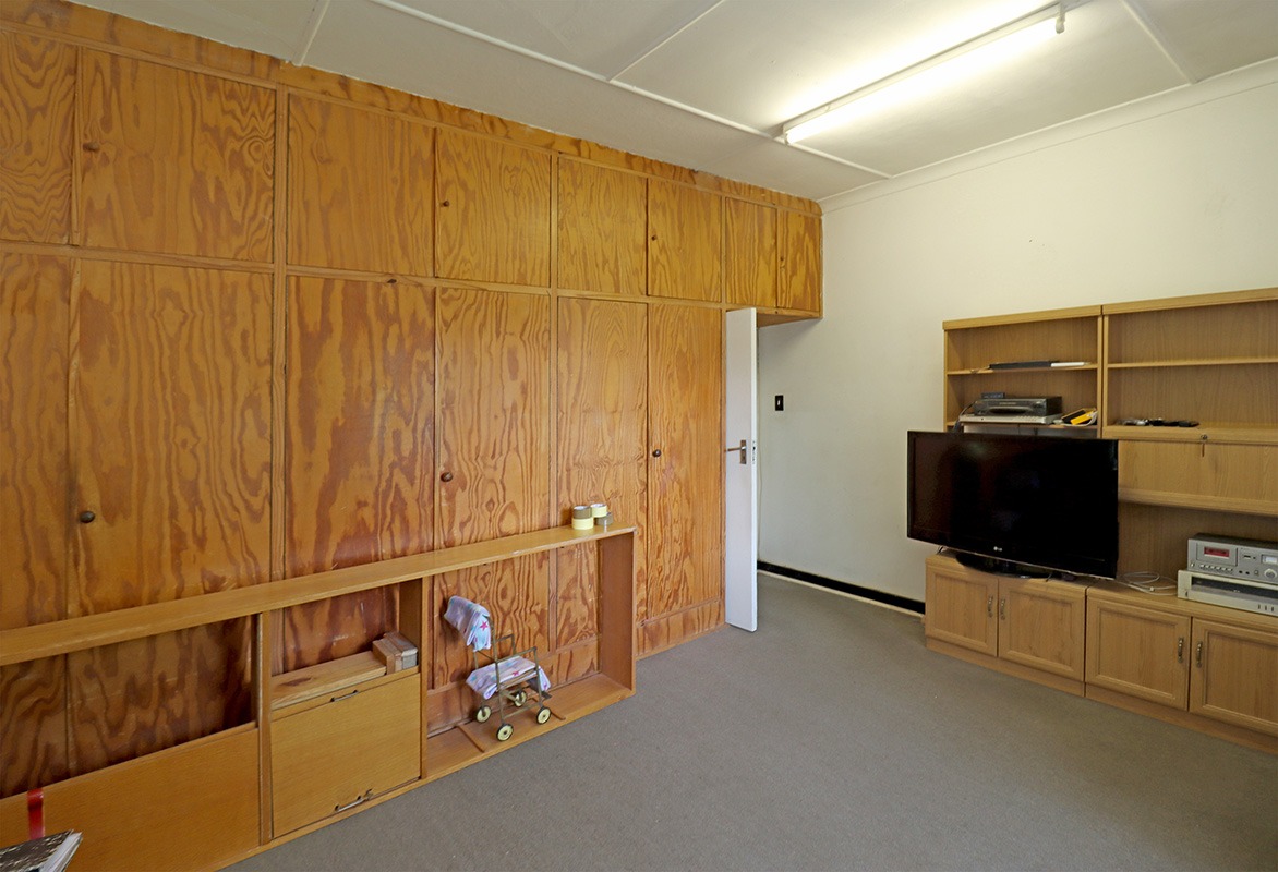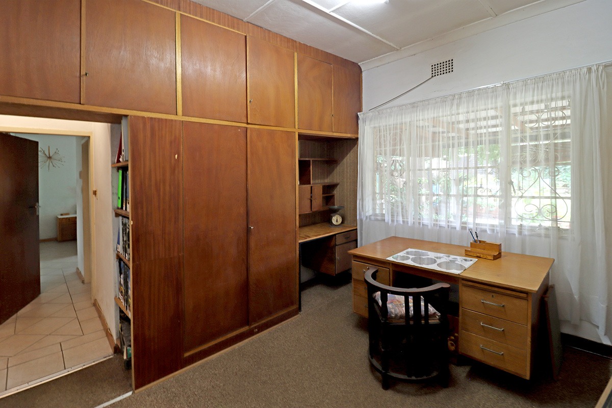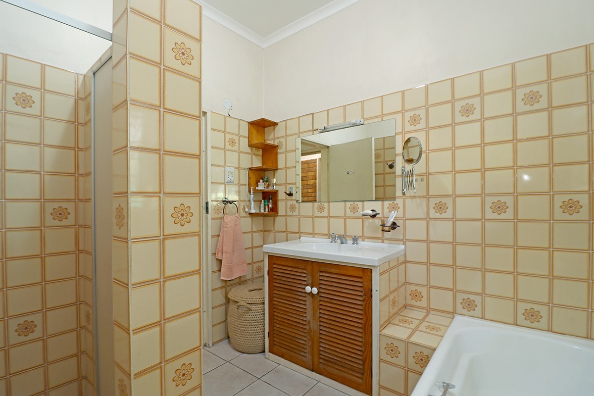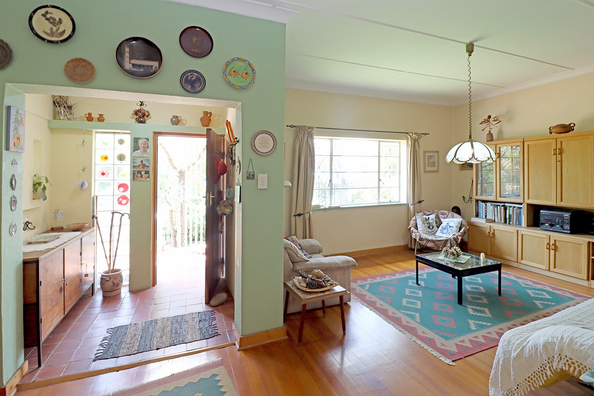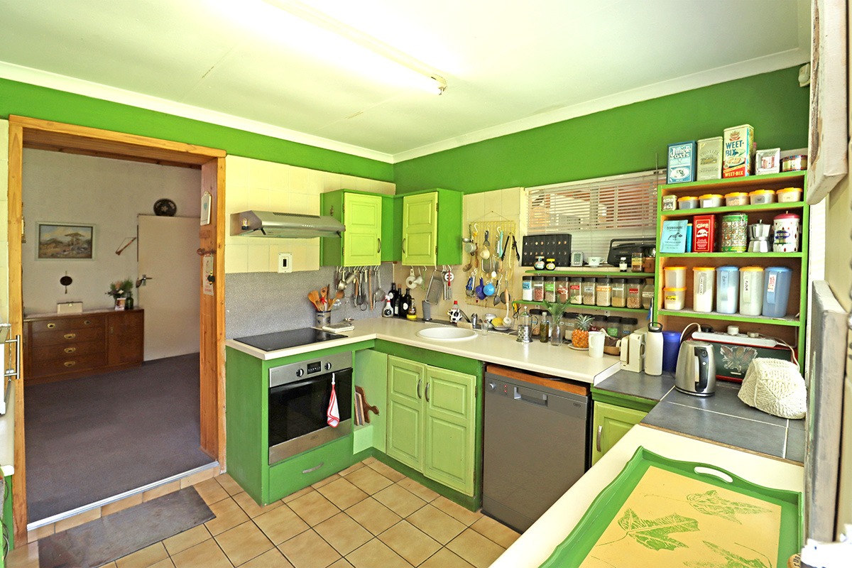 The home features a classic brick exterior complemented by a lush, mature garden with vibrant flowering plants, including bougainvillea, and expansive green lawns. Security bars on windows and doors provide peace of mind. The interior boasts a spacious living area with warm oregan pinewood flooring and ample natural light, creating an inviting atmosphere. A well-appointed kitchen with a pantry and a dedicated dining room with a classic woodburner fireplace, all cater to daily living and entertaining needs.