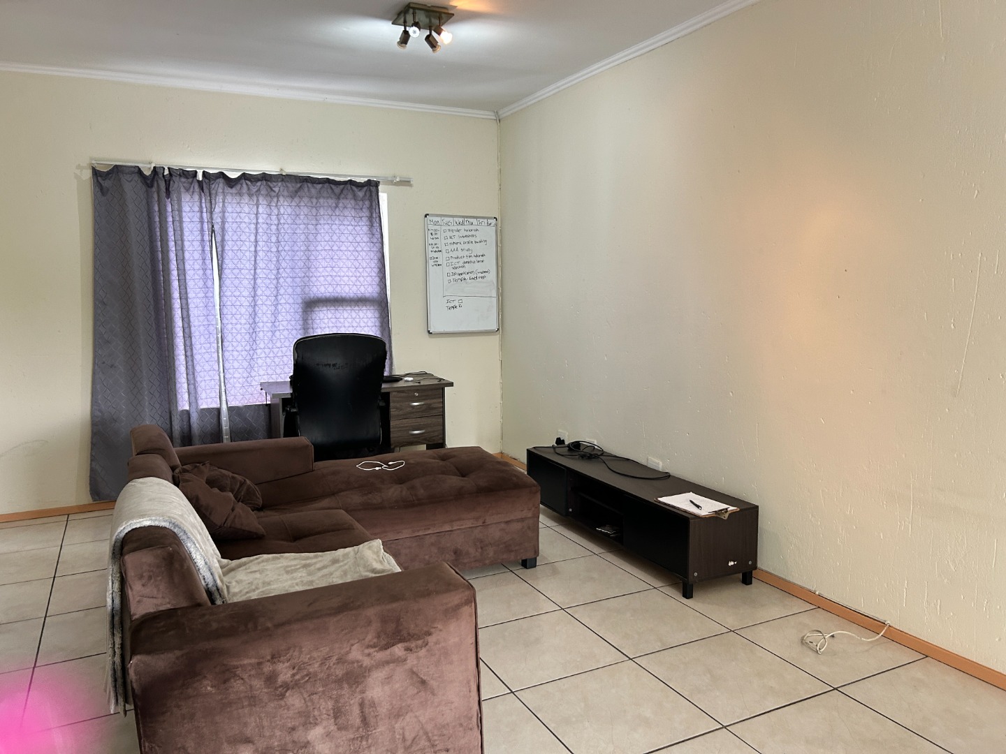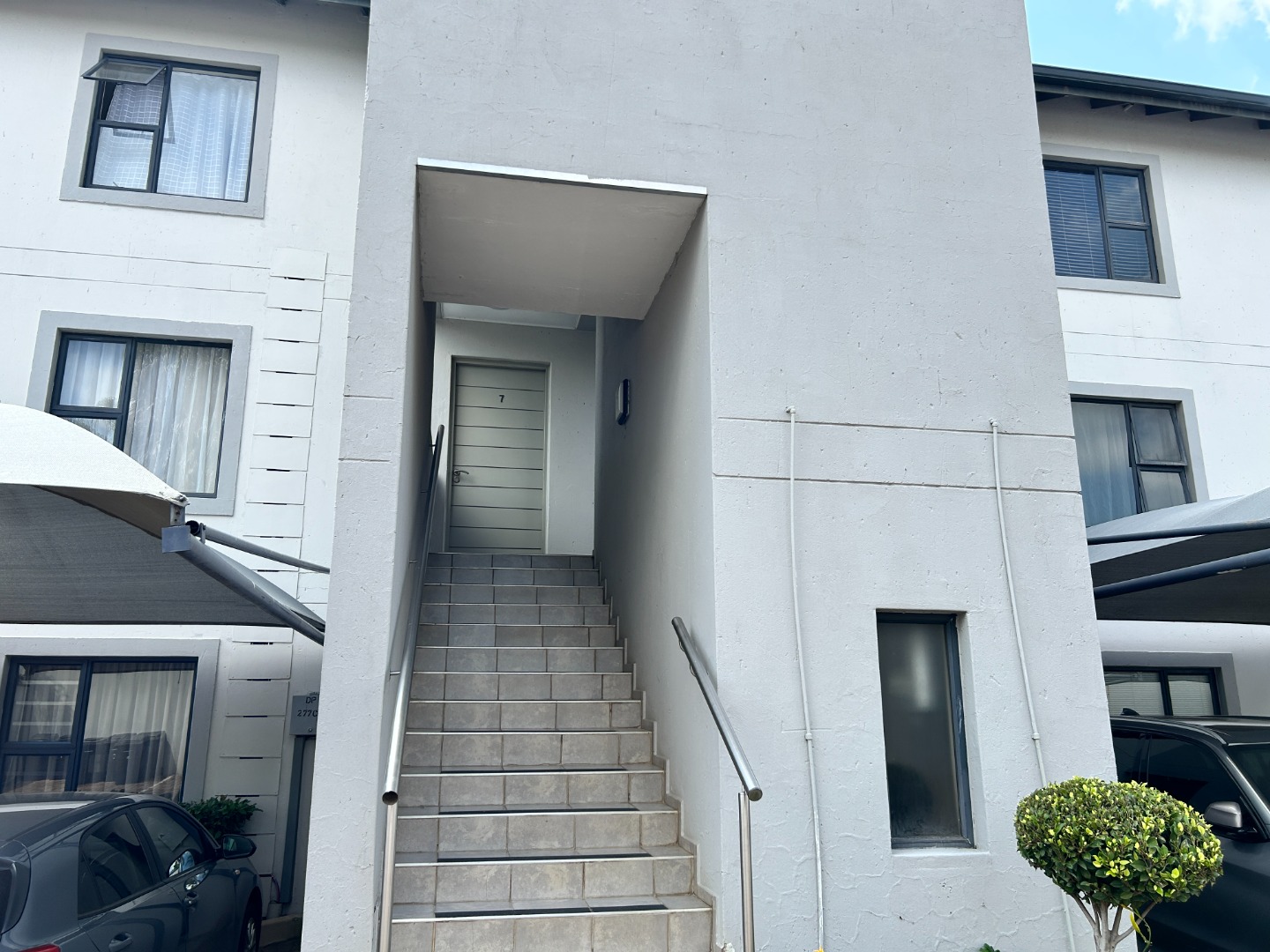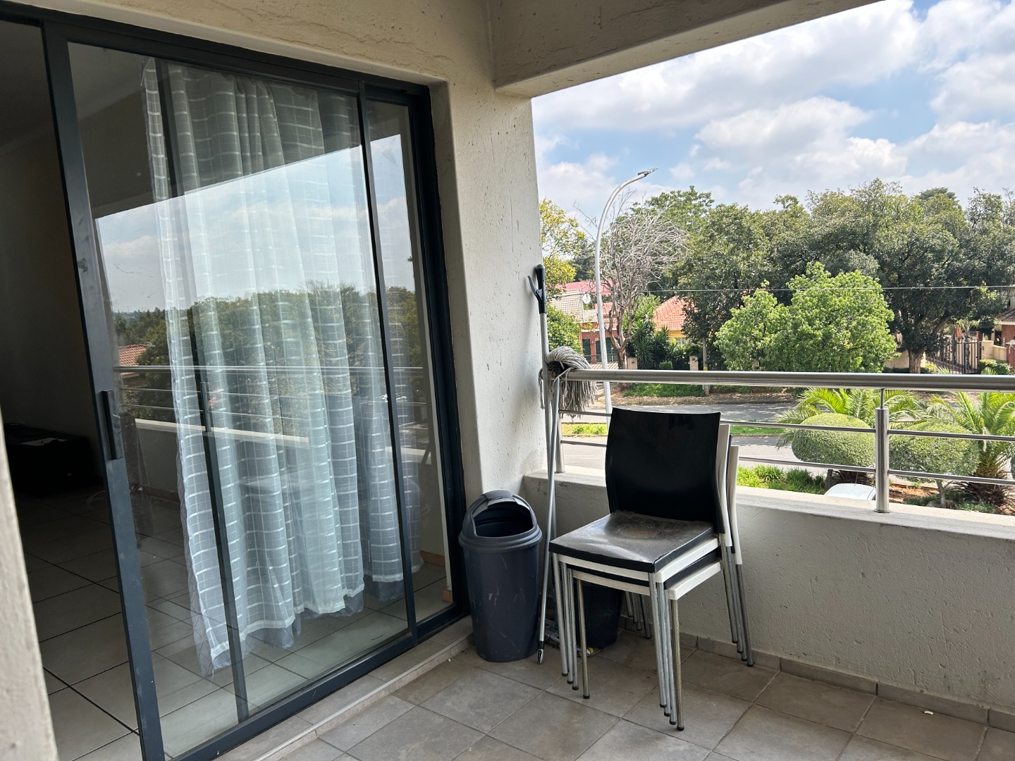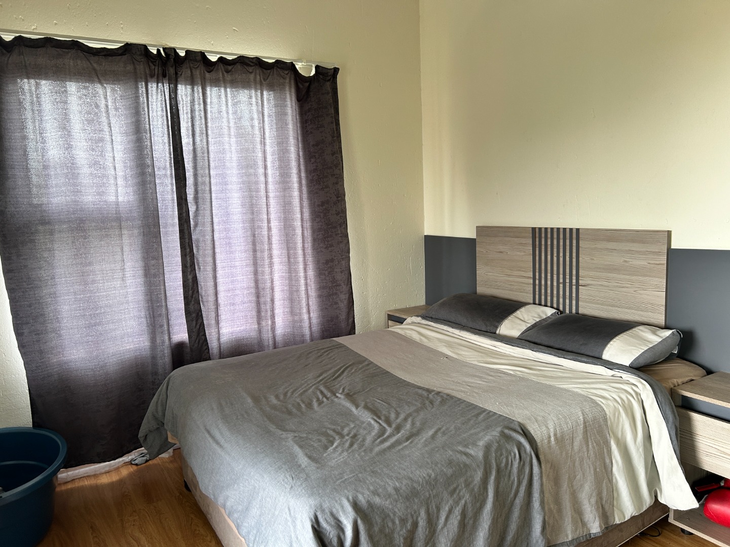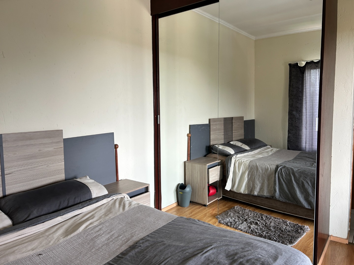 The bedroom is generously sized, finished with laminate flooring and mirrored built-in cupboards that enhance both storage and light. Sliding doors provide direct access to the patio, reinforcing the indoor-outdoor flow.