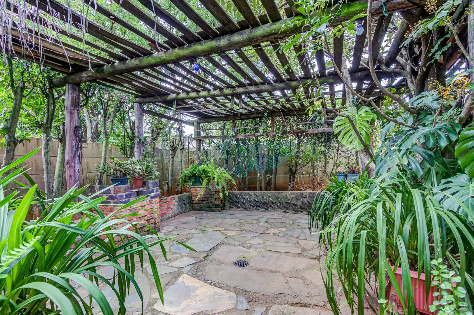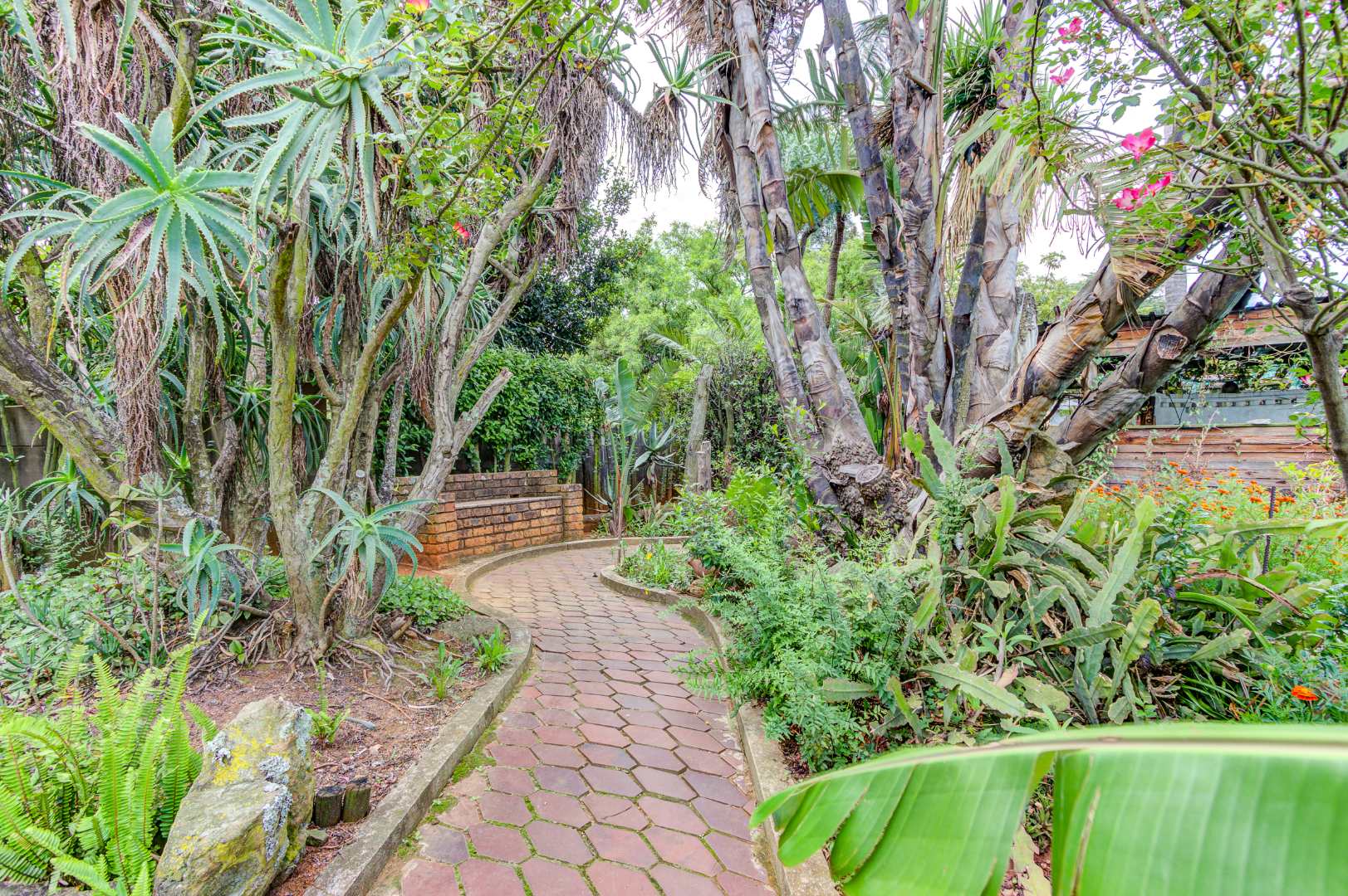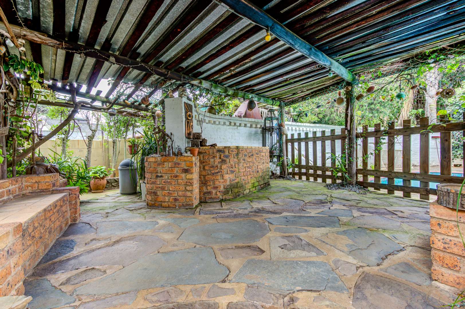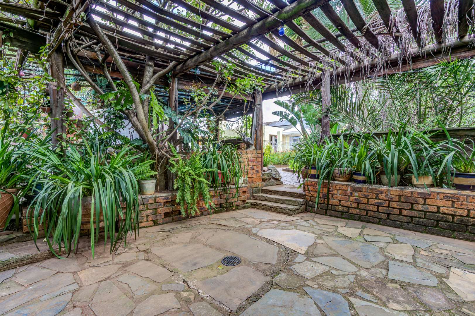 The garden is a true highlight, with winding pathways leading to multiple outdoor entertainment spaces, additional Braai facilities, seating areas, and a charming pond, all surrounded by a well-kept garden that offers privacy and