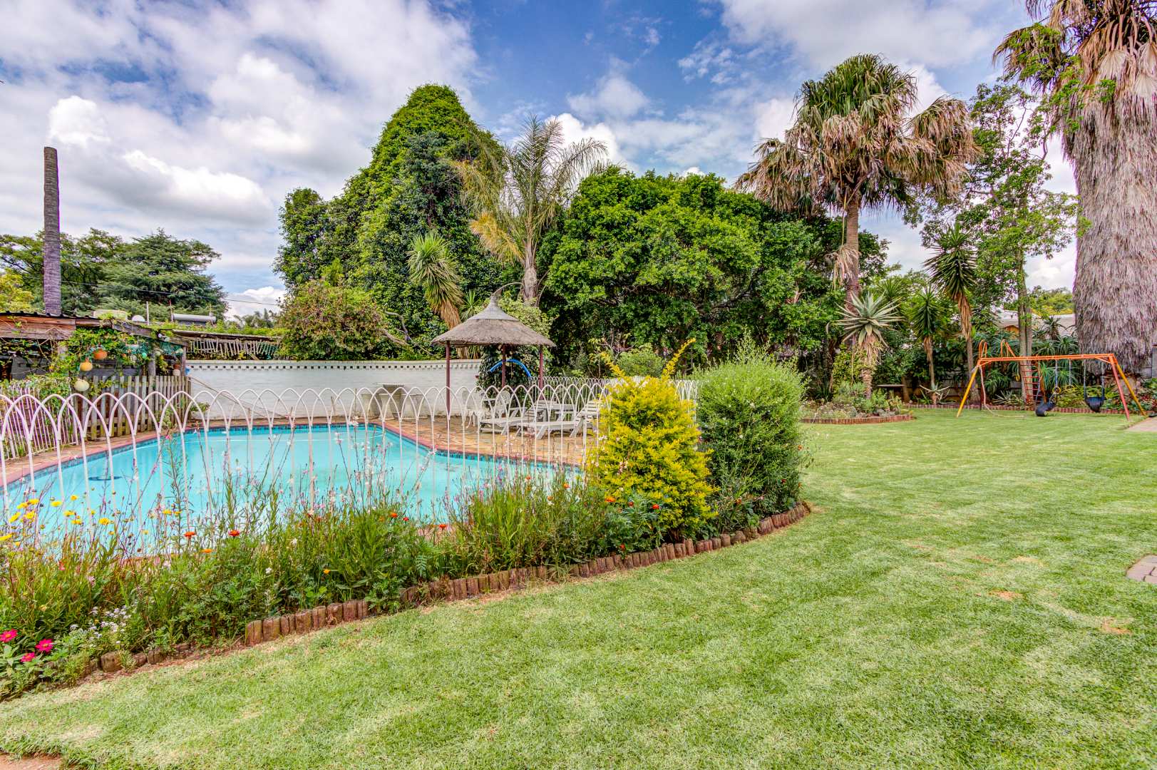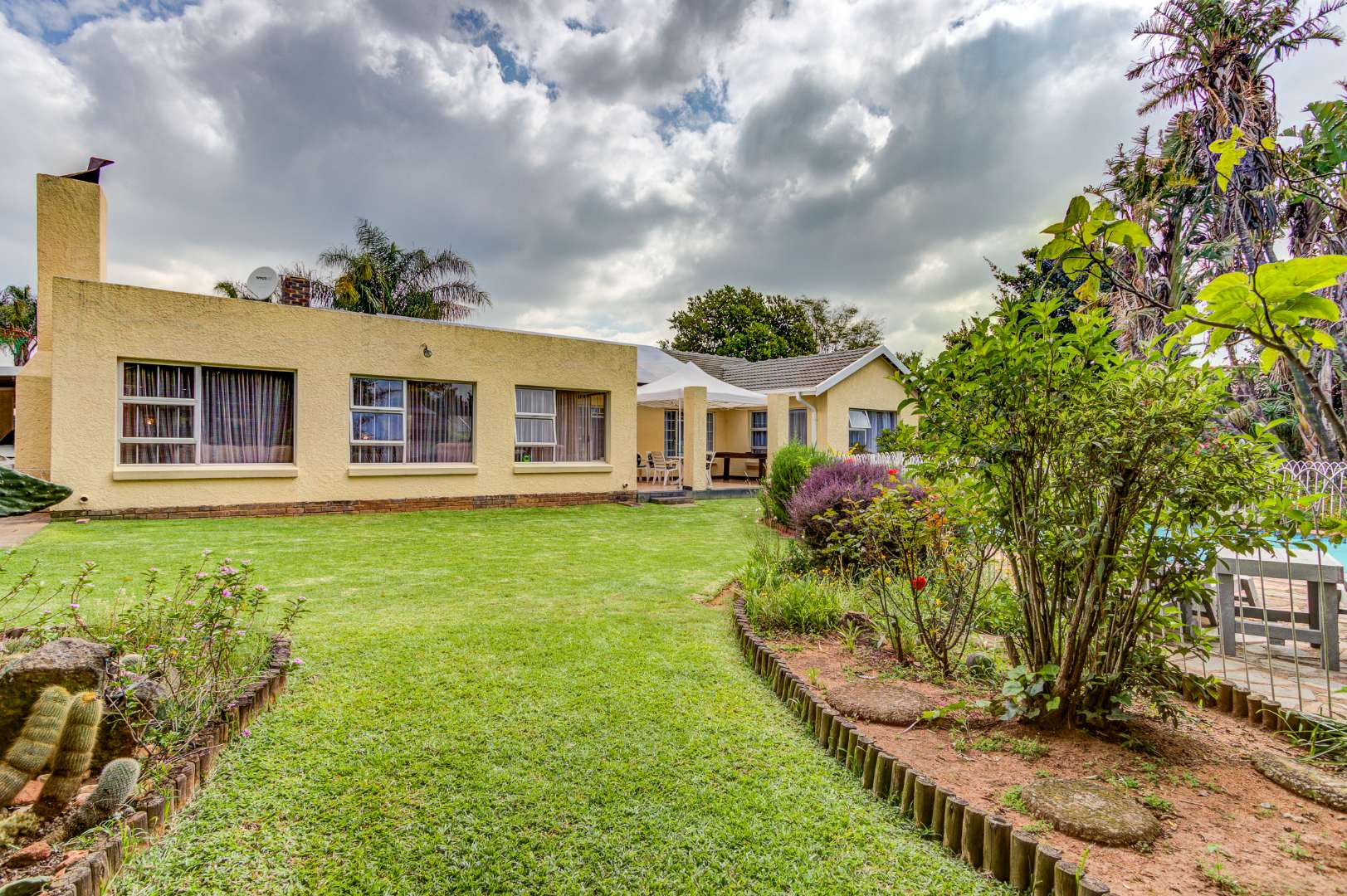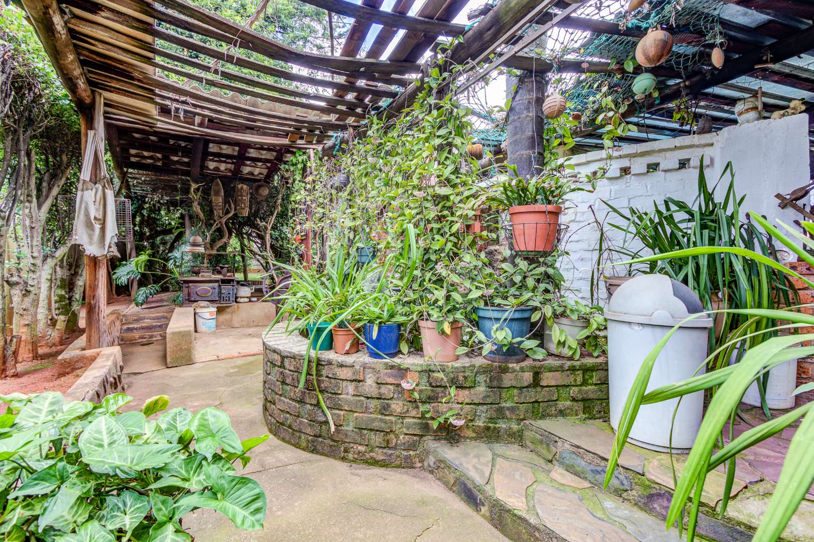 The garden is a true highlight, with winding pathways leading to multiple outdoor entertainment spaces, additional Braai facilities, seating areas, and a charming pond, all surrounded by a well-kept garden that offers privacy and