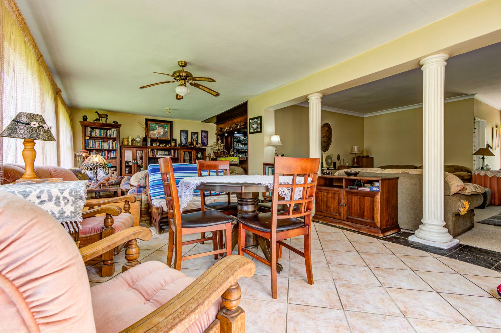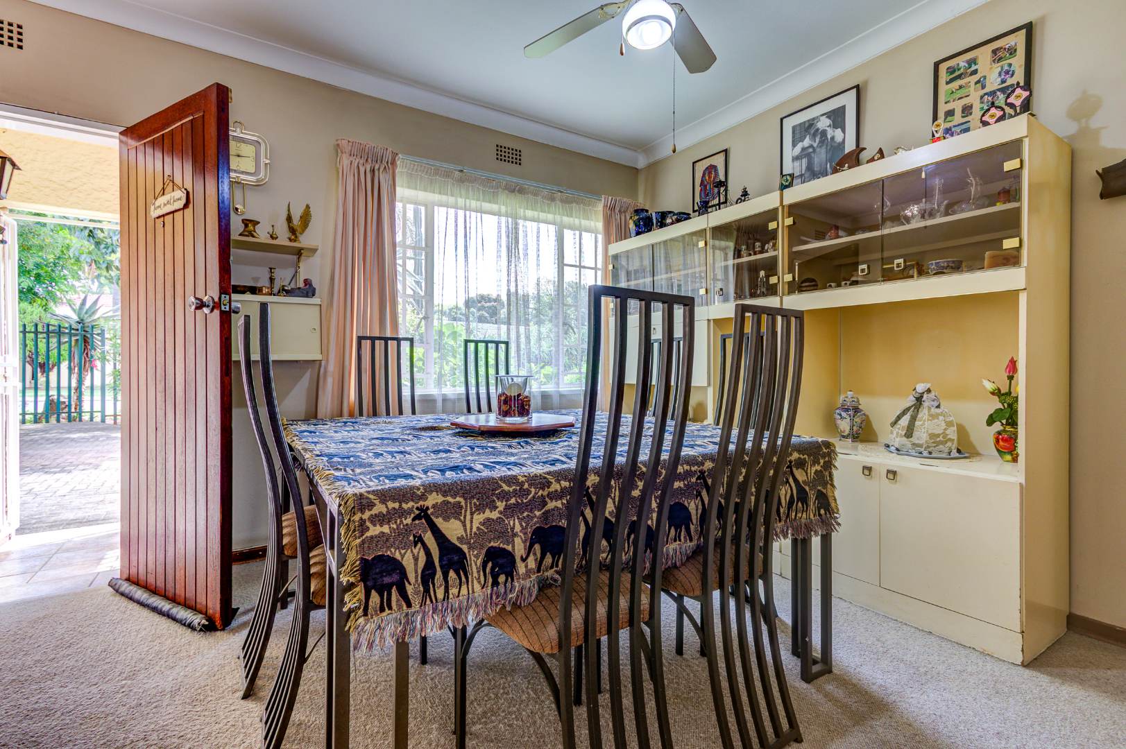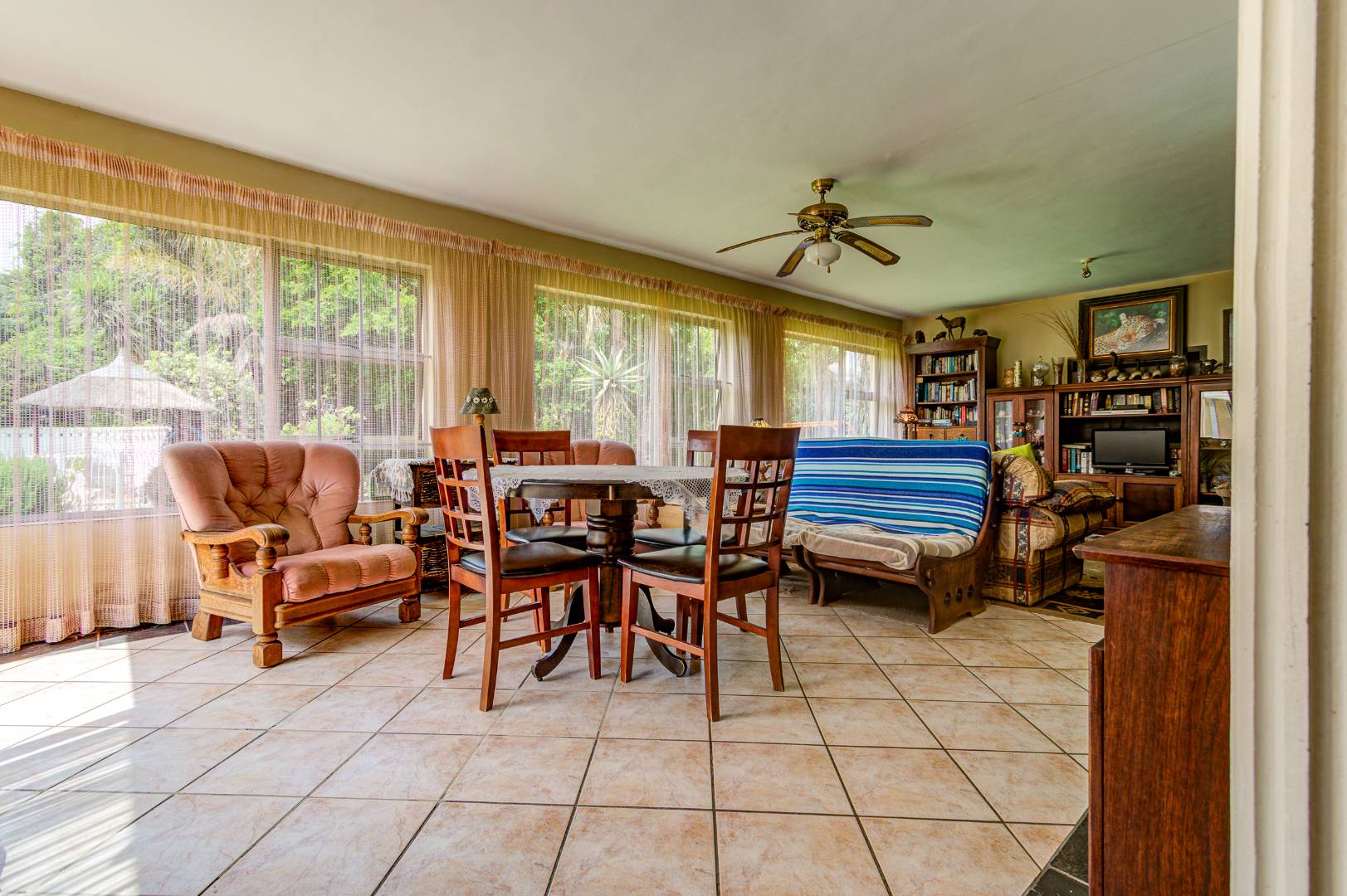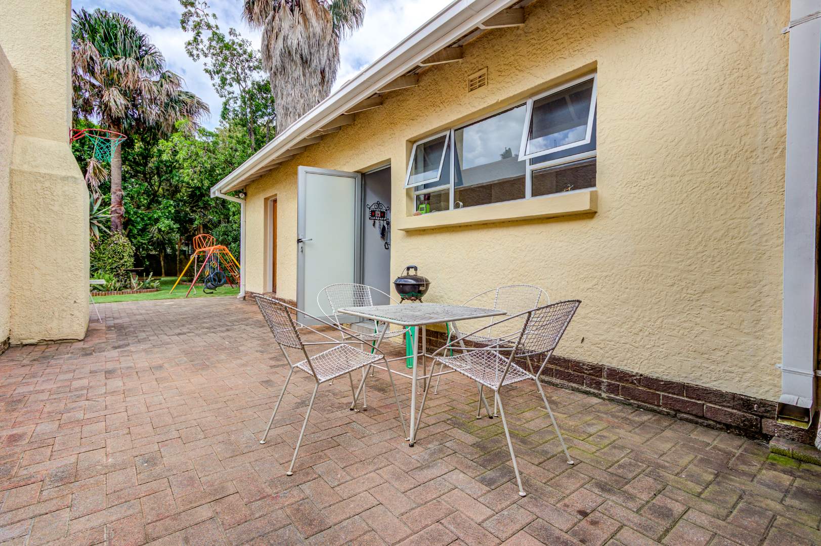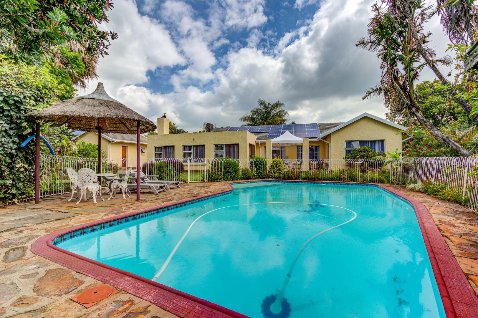 The Entrance leads into open-plan living areas where the Dining room and Lounge, complete with an anthracite heater, flow into a spacious Sunroom with a built-in Braai and Bar — perfect for family gatherings and relaxed weekends. Sliding doors open onto a Patio overlooking a lush garden and sparkling swimming Pool, ideal for children to play while parents entertain.