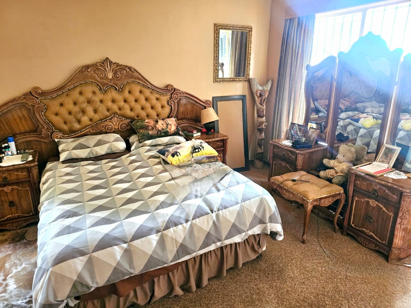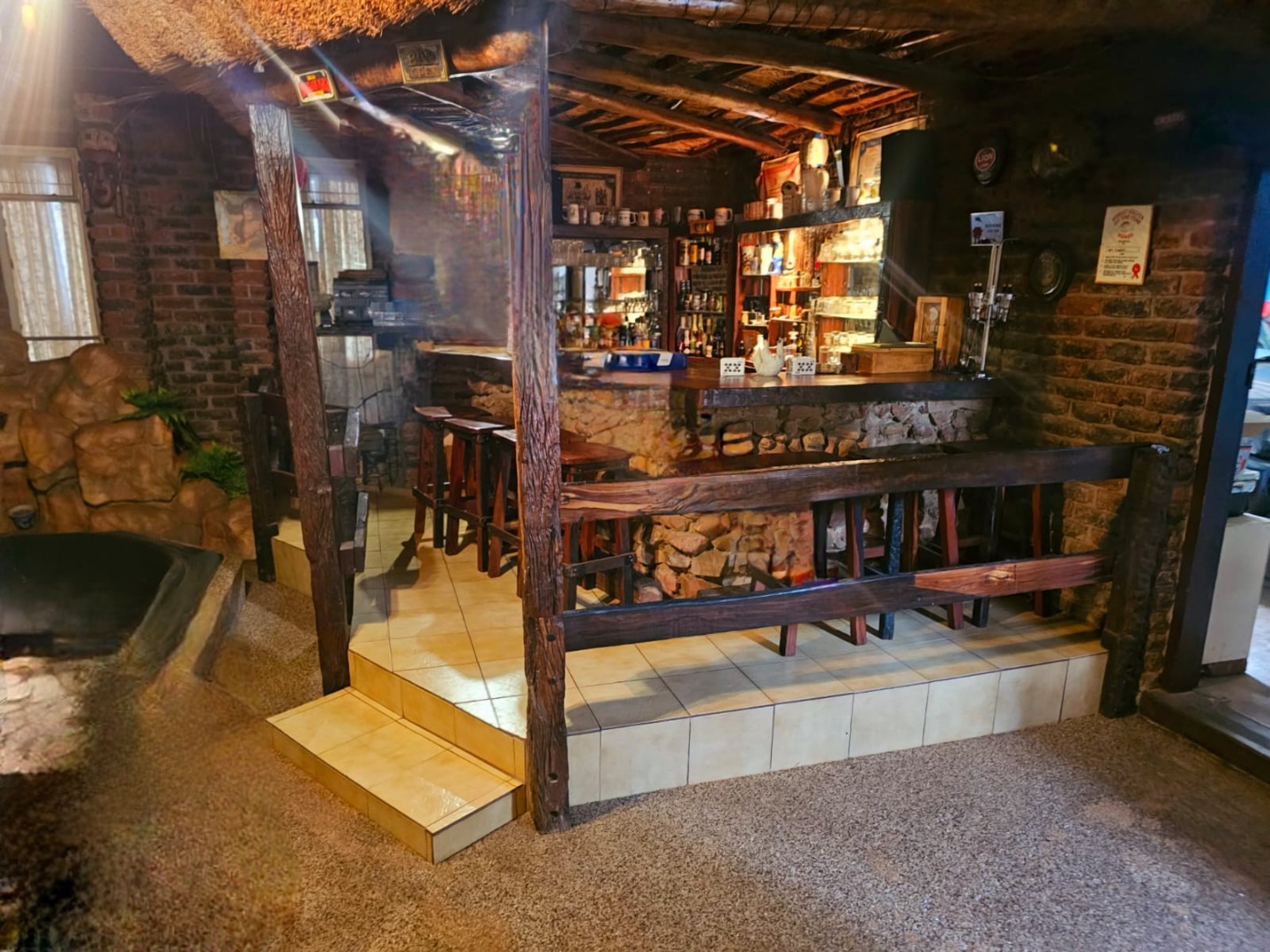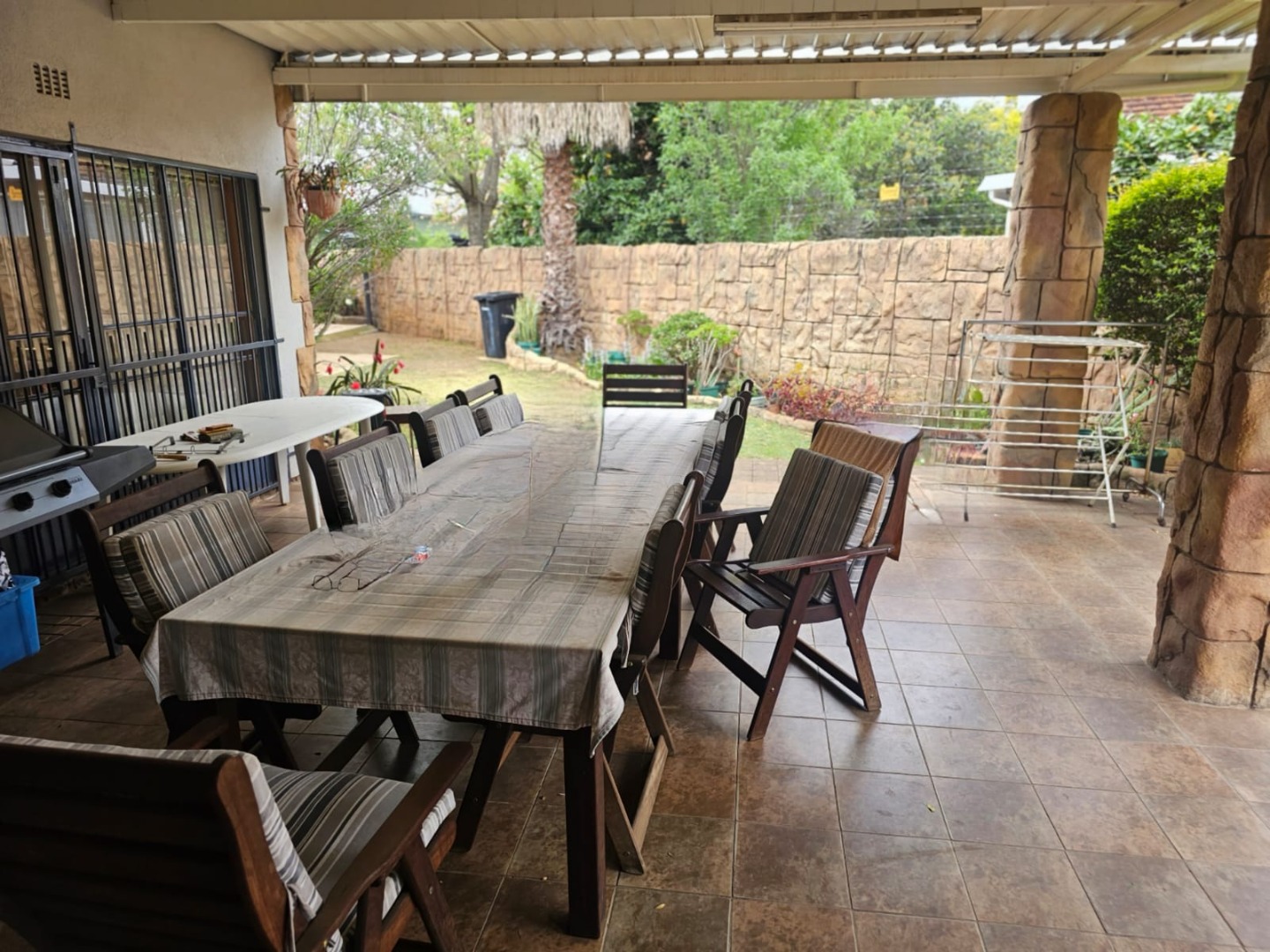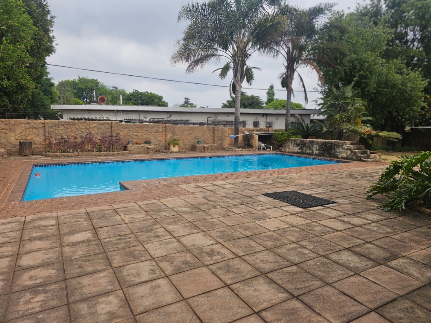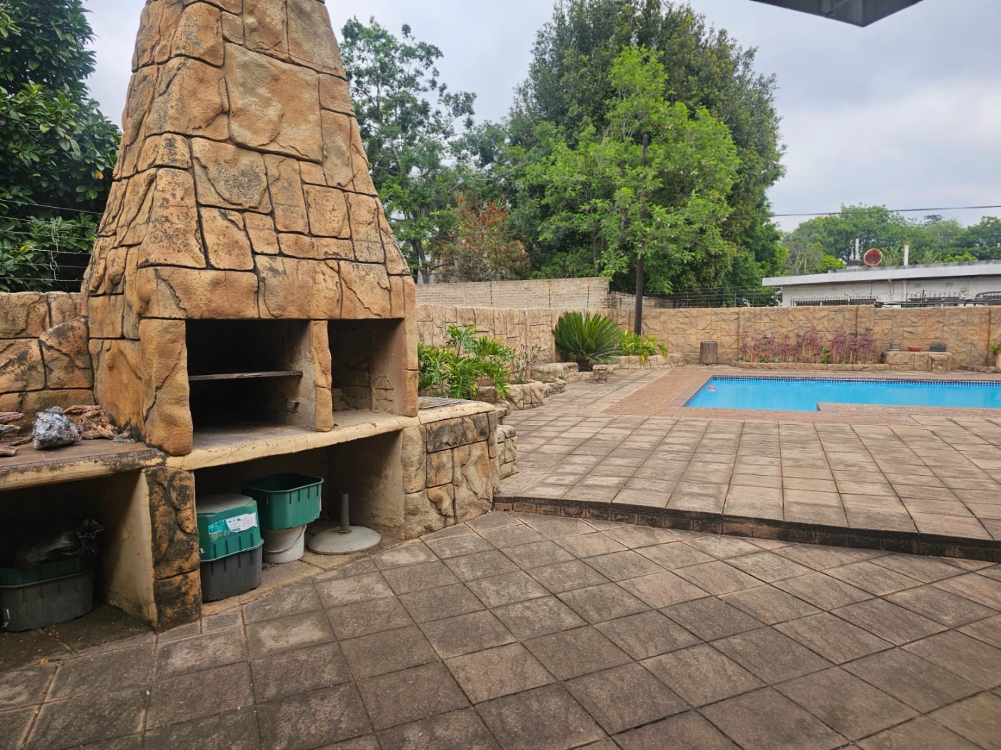This distinguished residence, situated within the desirable Aston Manor in Kempton Park, South Africa, offers a suburban lifestyle within a secure, gated community. The established area provides convenient access to local amenities and essential transport routes. The property presents a robust brick-built exterior with a flat roof, complemented by a neatly paved driveway in a herringbone pattern leading to a double garage and an additional carport. Mature trees and well-maintained landscaping enhance the property's frontage, contributing to a distinguished first impression. Security is augmented by burglar bars and security gates, alongside electric fencing and 24-hour security within the gated community. Spanning 380 sqm, this substantial home features five bedrooms and 2.5 bathrooms, including one en-suite. The interior boasts two lounges, a dedicated dining room, and a functional kitchen equipped with modern built-in appliances such as a double oven, microwave, and induction cooktop. The kitchen offers ample storage and a pantry, catering to culinary needs. An entrance hall provides a welcoming transition into the living spaces. The property excels in outdoor living and entertainment. A large swimming pool with a spacious tiled patio is ideal for relaxation, complemented by lush greenery and palm trees. The expansive covered patio, complete with a built-in braai, offers an excellent venue for al fresco dining. A unique, rustic pub-style bar area, featuring exposed wooden beams and brick walls, provides an intimate setting for social gatherings. Further amenities include a jacuzzi, a garden, and outside toilets. Beyond the gated community's security, the property benefits from an alarm system, access gate, and security post. Fibre connectivity is available, ensuring modern communication capabilities. The presence of a borehole indicates a potential for water resilience, while paving and a totally walled perimeter enhance privacy and security. Key Features: * Five bedrooms, 2.5 bathrooms (one en-suite) * Double garage and additional carport * Expansive outdoor entertainment area with swimming pool and jacuzzi * Rustic pub-style built-in bar * Covered patio with built-in braai * Two lounges, one dining room, and a functional kitchen with pantry * Gated community with 24-hour security, alarm, and electric fencing * Fibre connectivity and borehole * Erf Size: 1487 sqm, Floor Size: 380 sqm