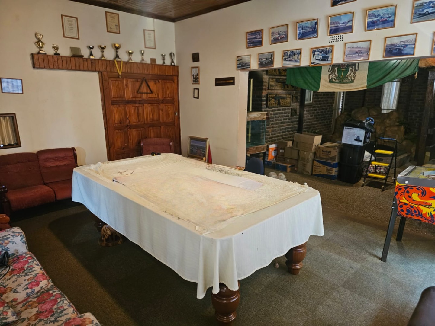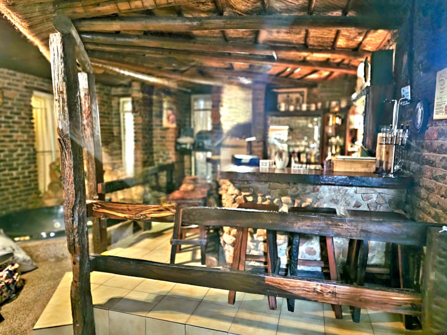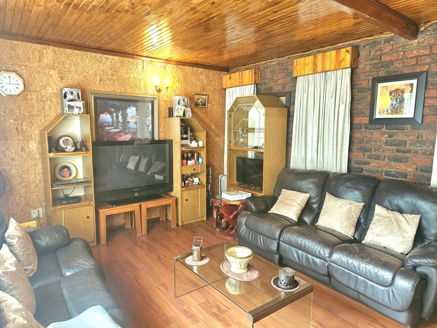 This distinguished residence, situated within the desirable Aston Manor in Kempton Park, South Africa, offers a suburban lifestyle within a secure, gated community. The established area provides convenient access to local amenities and essential transport routes. The property presents a robust brick-built exterior with a flat roof, complemented by a neatly paved driveway in a herringbone pattern leading to a double garage and an additional carport. Mature trees and well-maintained landscaping enhance the property's frontage, contributing to a distinguished first impression. Security is augmented by burglar bars and security gates, alongside electric fencing and 24-hour security within the gated community. Spanning 380 sqm, this substantial home features five bedrooms and 2.5 bathrooms, including one en-suite. The interior boasts two lounges, a dedicated dining room, and a functional kitchen equipped with modern built-in appliances such as a double oven, microwave, and induction cooktop. The kitchen offers ample storage and a pantry, catering to culinary needs. An entrance hall provides a welcoming transition into the living spaces. The property excels in outdoor living and entertainment. A large swimming pool with a spacious tiled patio is ideal for relaxation, complemented by lush greenery and palm trees. The expansive covered patio, complete with a built-in braai, offers an excellent venue for al fresco dining. A unique, rustic pub-style bar area, featuring exposed wooden beams and brick walls, provides an intimate setting for social gatherings. Further amenities include a jacuzzi, a garden, and outside toilets. Beyond the gated community's security, the property benefits from an alarm system, access gate, and security post. Fibre connectivity is available, ensuring modern communication capabilities. The presence of a borehole indicates a potential for water resilience, while paving and a totally walled perimeter enhance privacy and security. Key Features: * Five bedrooms, 2.5 bathrooms (one en-suite) * Double garage and additional carport * Expansive outdoor entertainment area with swimming pool and jacuzzi * Rustic pub-style built-in bar * Covered patio with built-in braai * Two lounges, one dining room, and a functional kitchen with pantry * Gated community with 24-hour security, alarm, and electric fencing * Fibre connectivity and borehole * Erf Size: 1487 sqm, Floor Size: 380 sqm