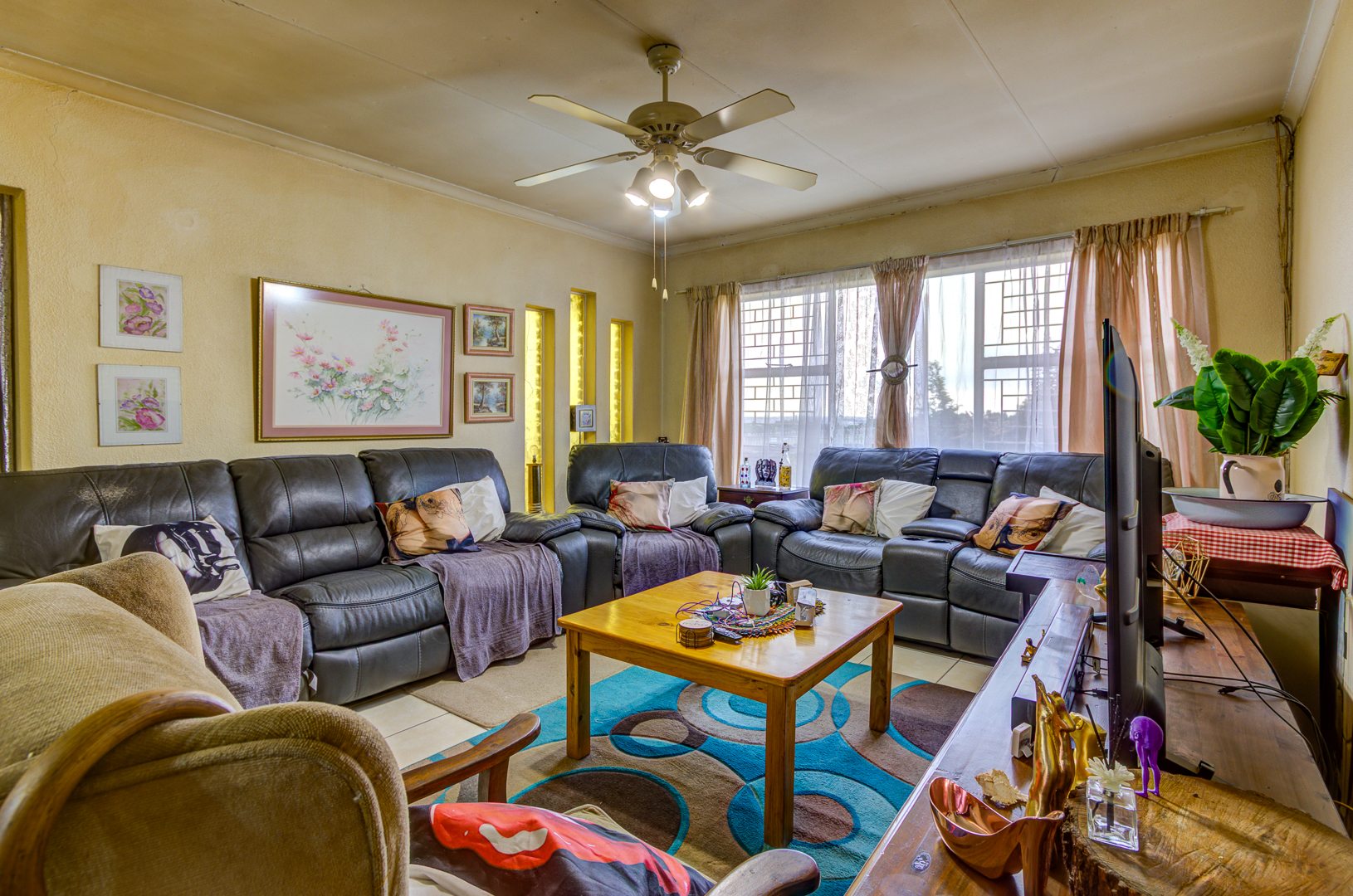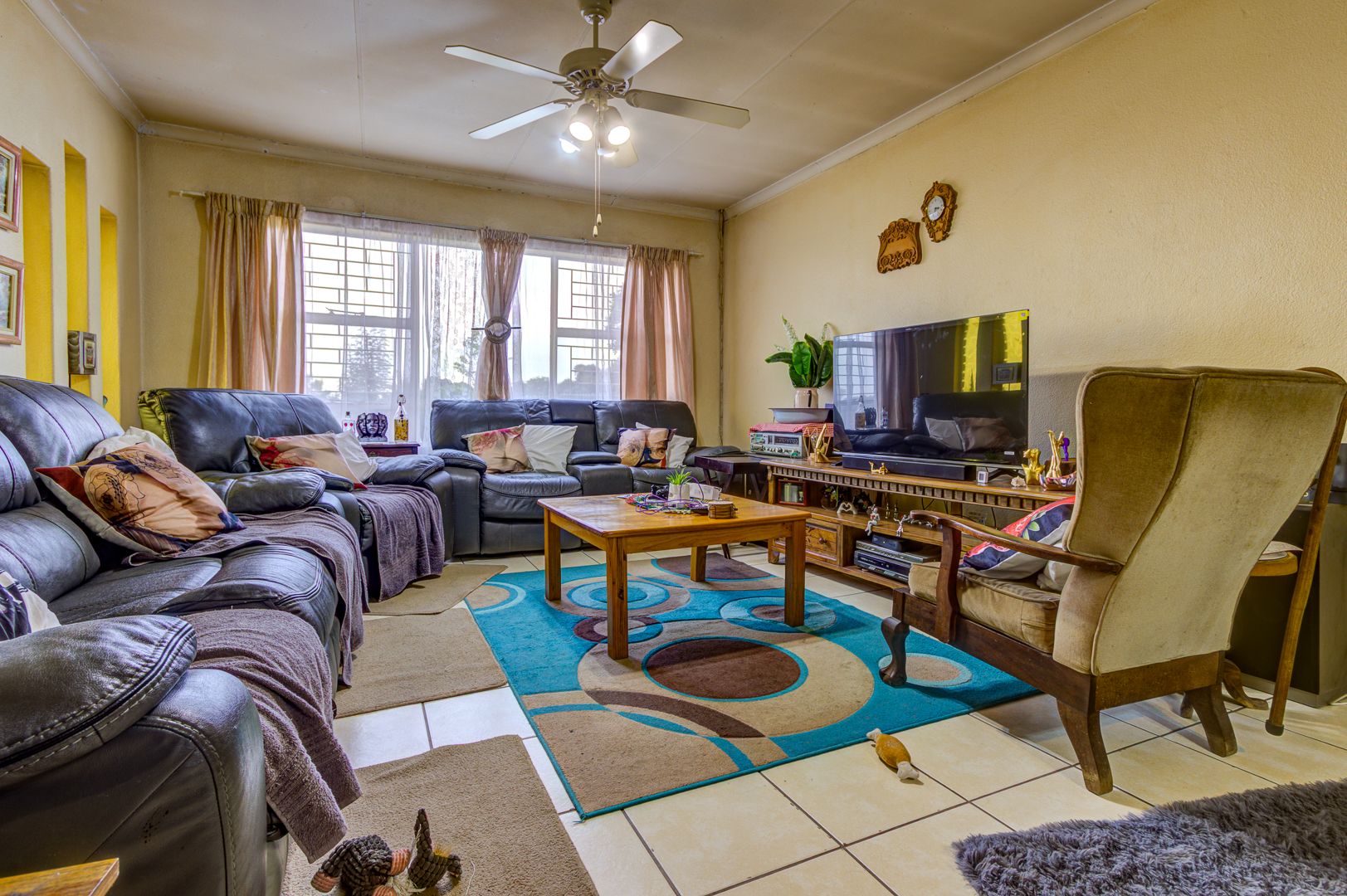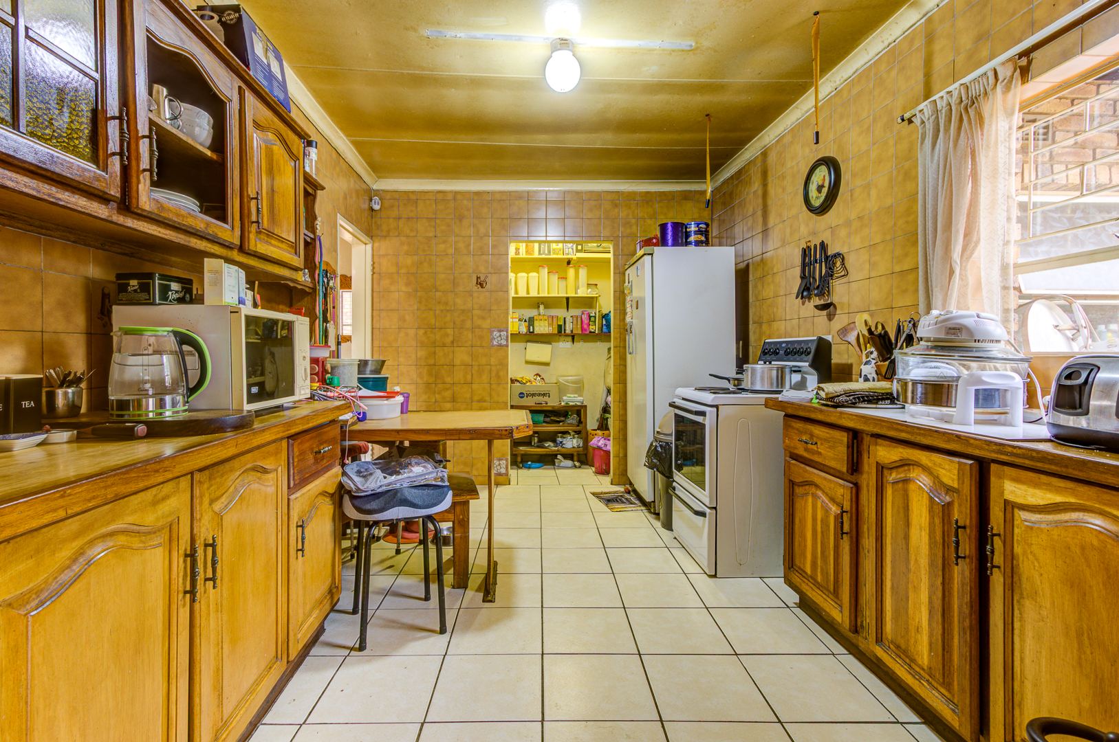 Step inside and you’ll find a welcoming lounge area, complete with tiled flooring and a ceiling fan to keep things cool. Large windows let in lots of natural light, creating a bright and airy feel. The kitchen is super functional, boasting ample wooden cabinetry, tiled walls, and plenty of counter space for all your culinary adventures. It even has a dedicated pantry and space for your washing machine, making daily chores a breeze. The dining area is conveniently located, perfect for family meals.