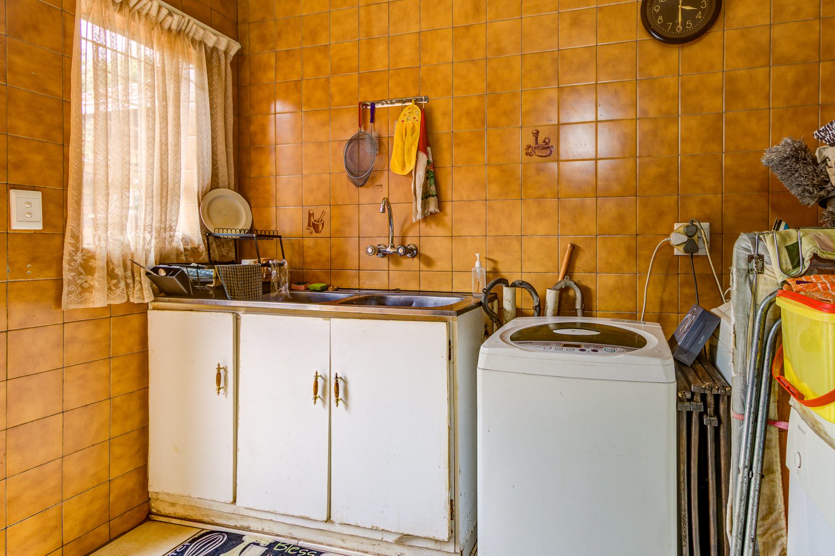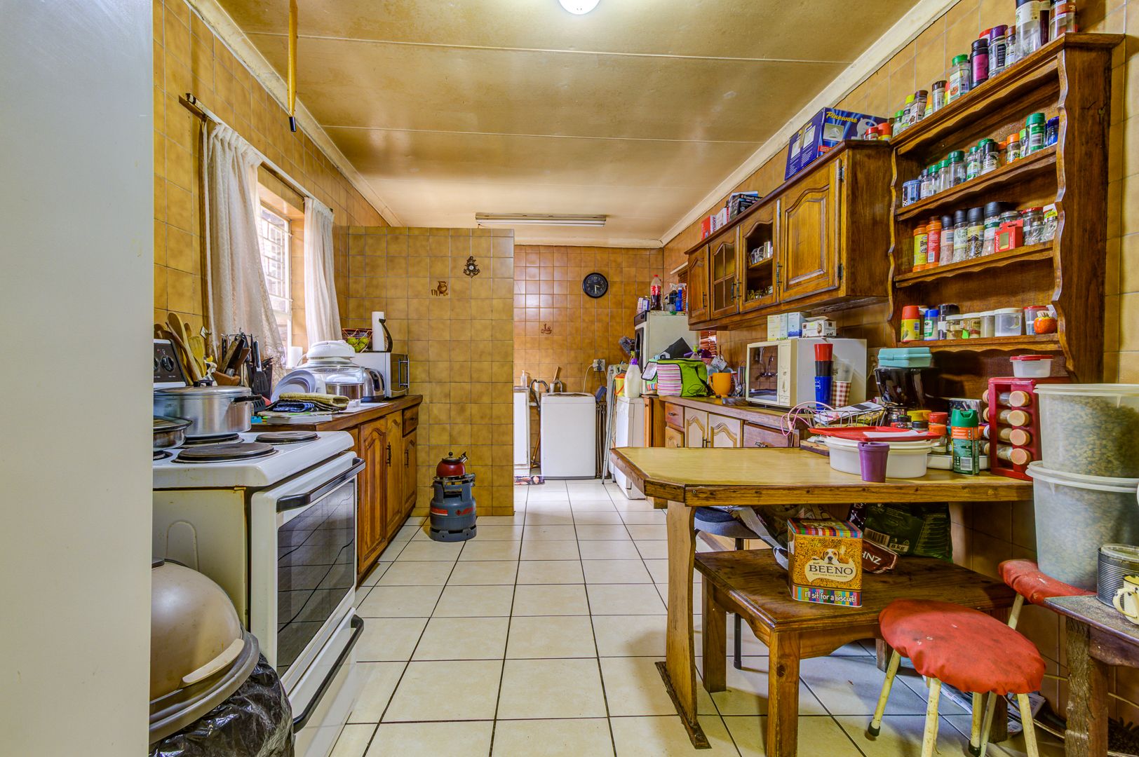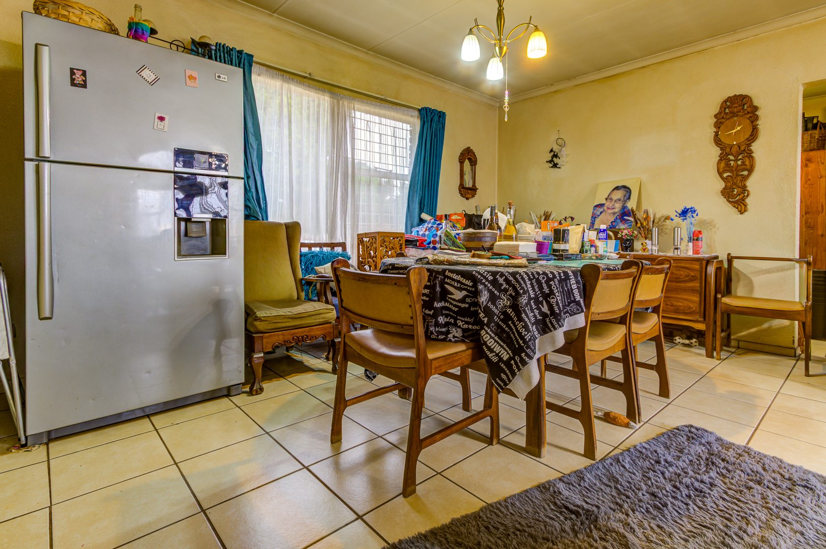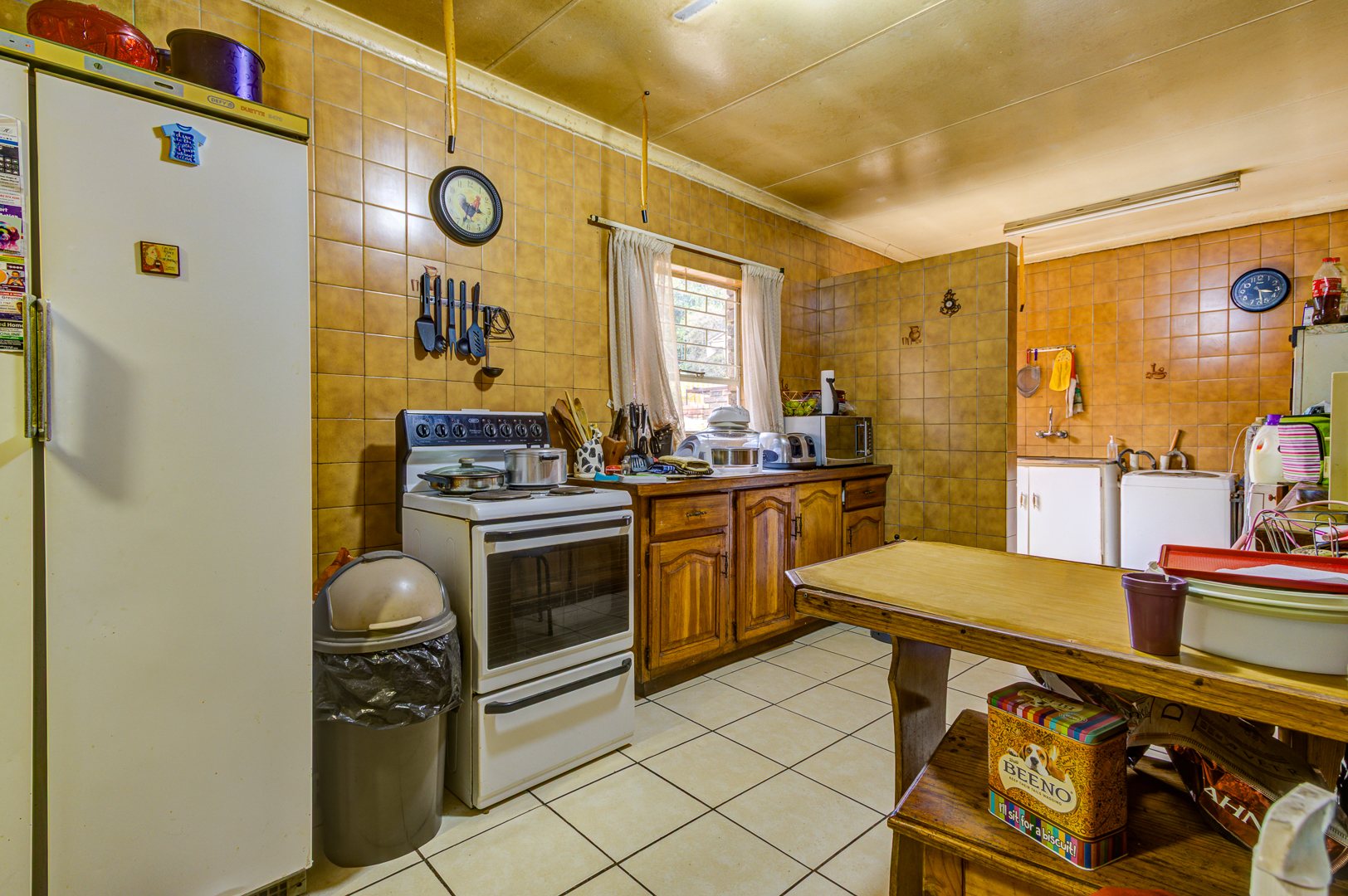 Step inside and you’ll find a welcoming lounge area, complete with tiled flooring and a ceiling fan to keep things cool. Large windows let in lots of natural light, creating a bright and airy feel. The kitchen is super functional, boasting ample wooden cabinetry, tiled walls, and plenty of counter space for all your culinary adventures. It even has a dedicated pantry and space for your washing machine, making daily chores a breeze. The dining area is conveniently located, perfect for family meals.
