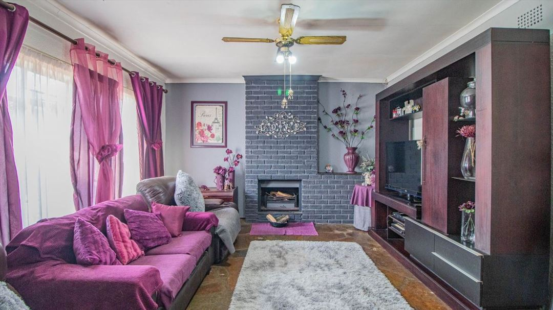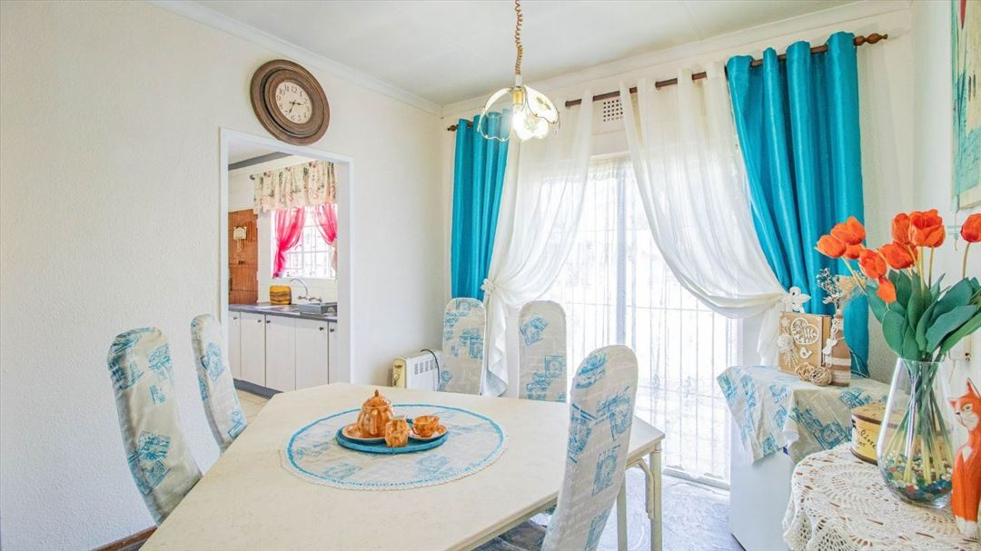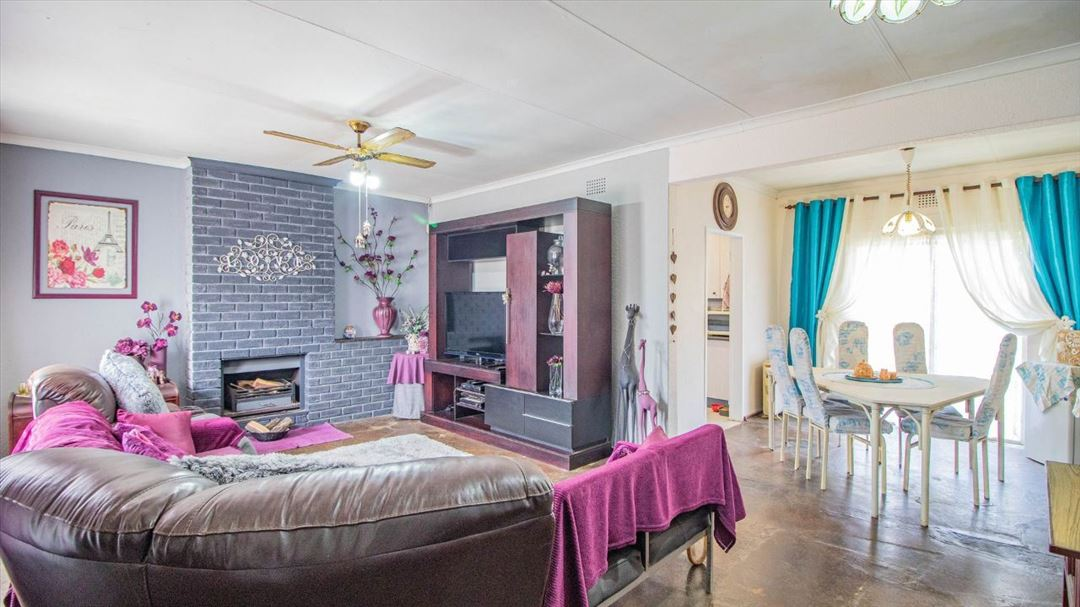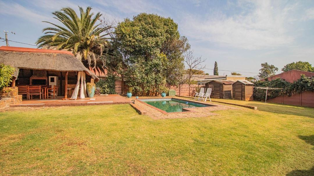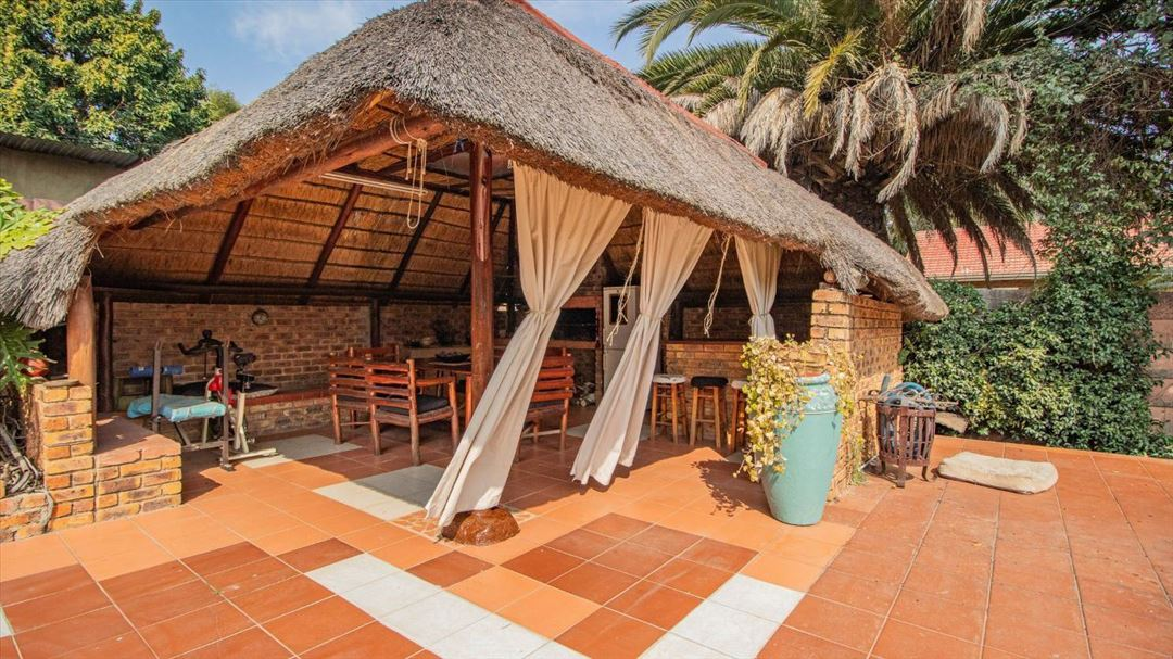 This lovely four-bedroom home has a welcoming feel throughout. It offers two well-sized bathrooms, a practical kitchen, a comfortable lounge, and a separate dining room ideal for family meals. The entrance hall creates a warm first impression, leading to a spacious family room that serves as the heart of the home. Outside, there is a well-designed braai area and a thatched lapa, perfect for relaxed gatherings and outdoor entertaining. With four garages providing plenty of parking and storage space, this home offers a classic, comfortable lifestyle suited for family living and everyday convenience.