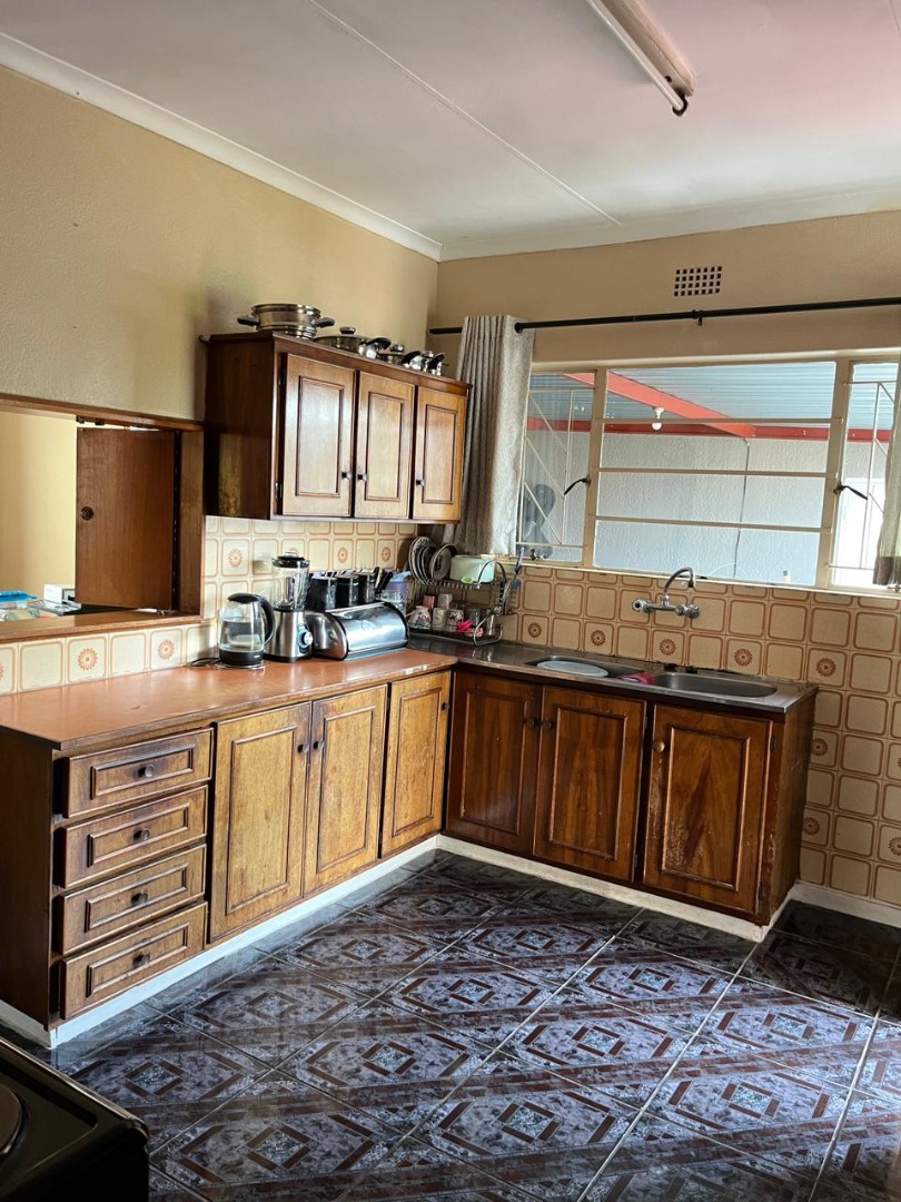 Inside, the property features a spacious living area with laminate flooring and a ceiling fan, brightened by natural light from a large sliding door. A dedicated dining area boasts hardwood flooring and a large window with modern curtains. The functional kitchen, while dated, offers ample storage with wooden cabinetry, durable tiled floors, and a backsplash, illuminated by a generous window.