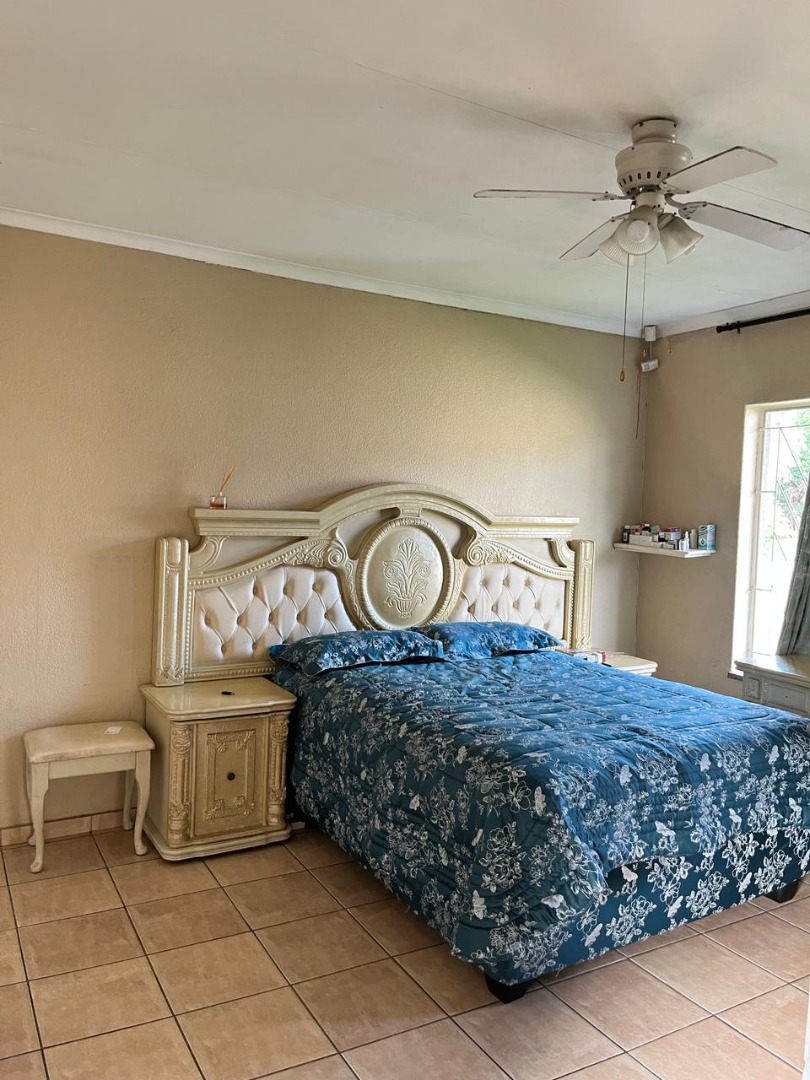 This inviting single-story detached home in Birchleigh North, Kempton Park, South Africa, presents a welcoming facade. A large, decorative paved driveway leads to a double garage, complementing the well-maintained front lawn and enhancing kerb appeal. It's in a boomed area.