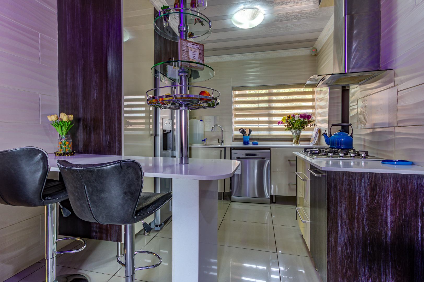 The modern kitchen is beautifully finished with granite countertops, a gas hob, and ample cupboard space, making it ideal for both everyday family meals and entertaining.