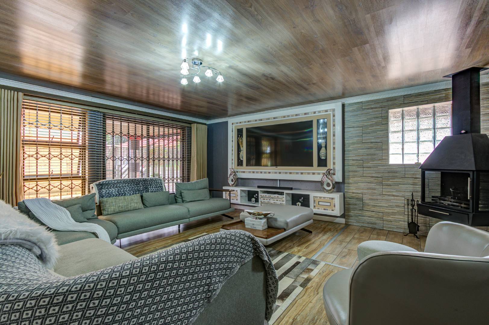Include four garages, ample secure parking for visitors, a well-maintained garden with a lapa ideal for entertaining, aluminum window frames throughout, and excellent energy efficiency with a 5kVA inverter, batteries, and six solar panels.
