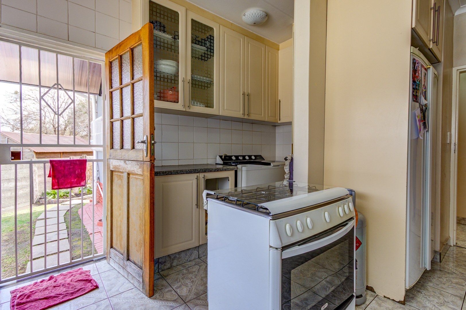 Kitchen: Modern, fully tiled to the ceiling, fitted with built-in cupboards, scullery combo, electric stove with four hob plates, extractor fan, and under-counter oven.