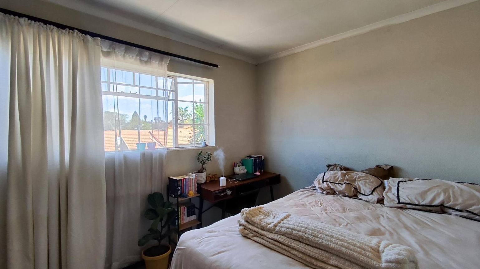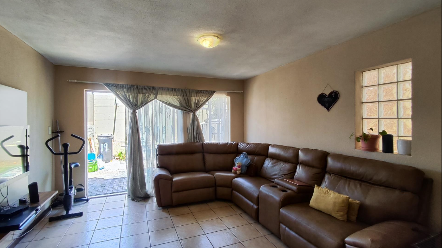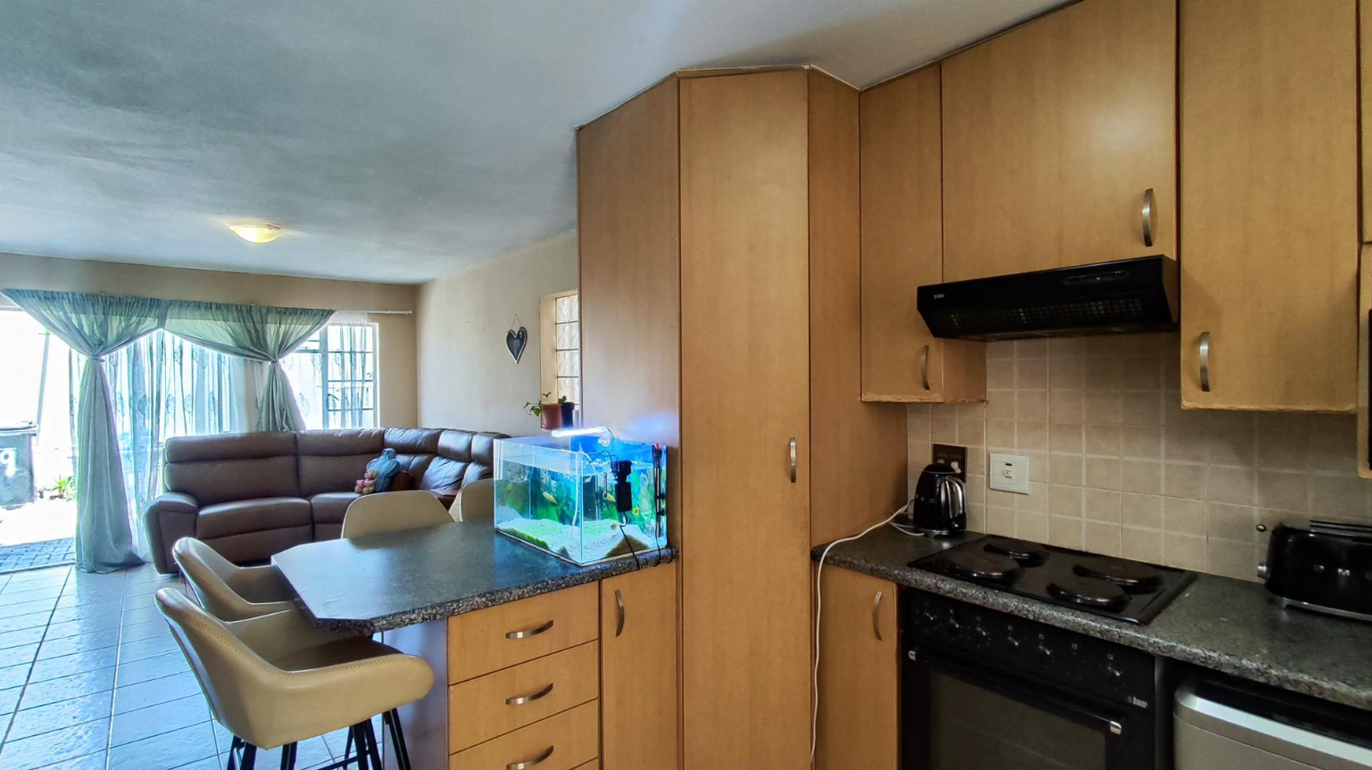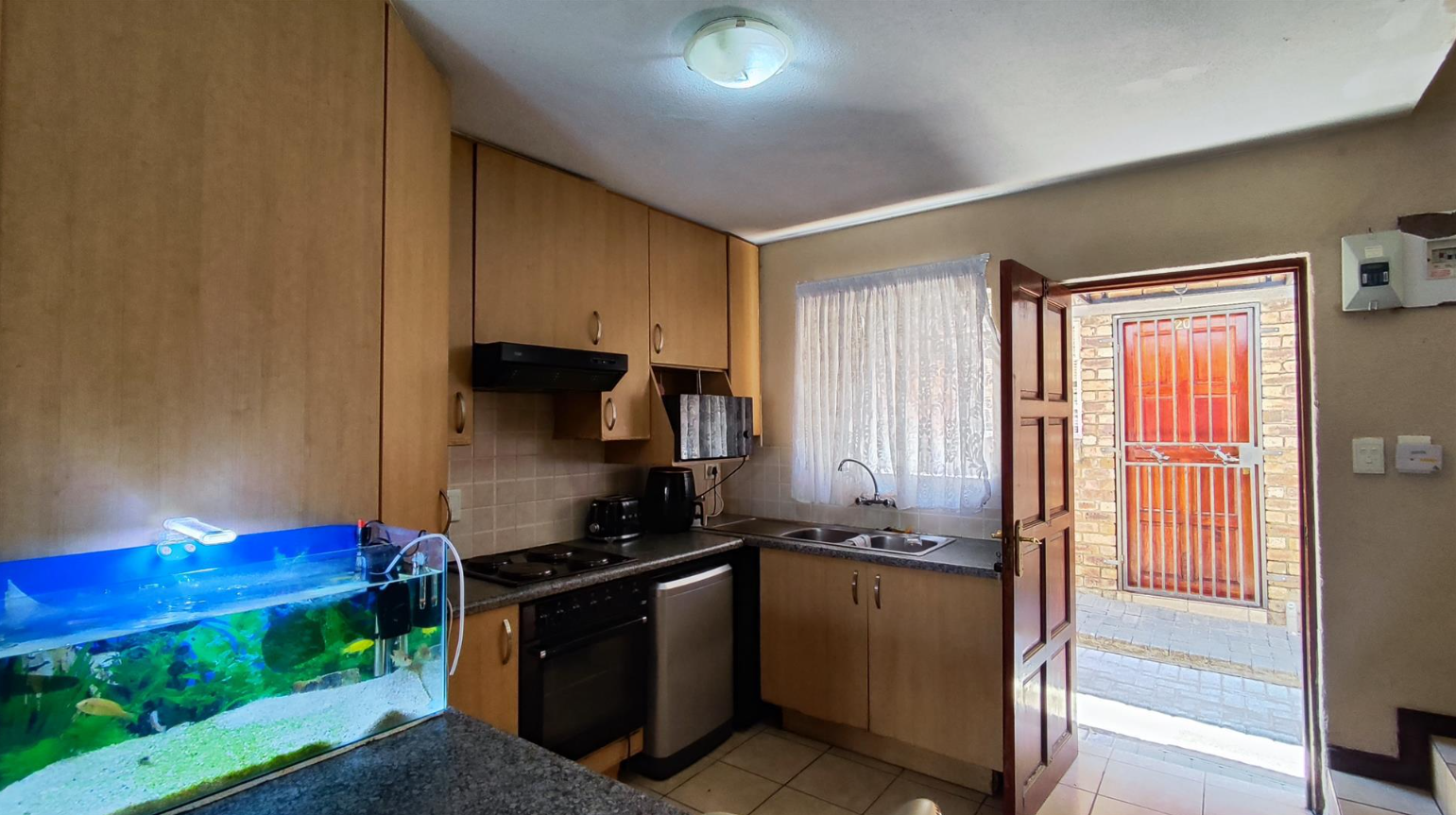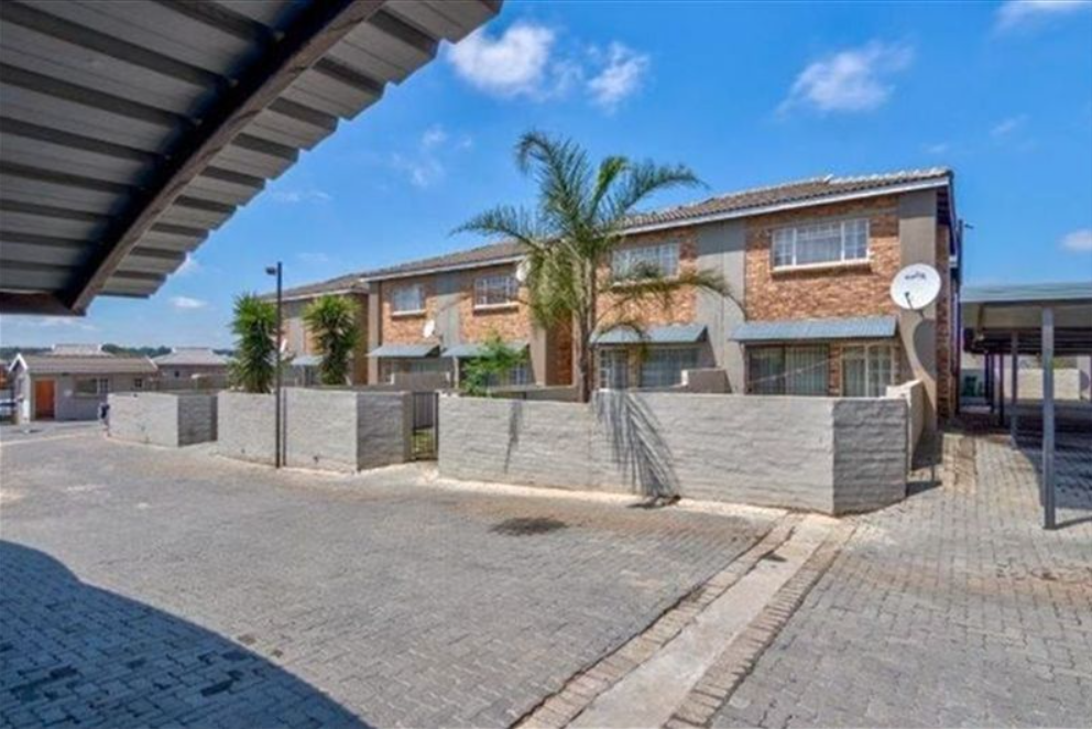 This inviting two-bedroom townhouse, located in a secure complex, offers a comfortable and practical living space. The complex ensures peace of mind with a secure entrance featuring a large metal gate, electric fencing, and a dedicated guardhouse, complemented by centralized mailboxes and fully paved common areas. The two-story attached units present a neat kerb appeal with brick and painted concrete exteriors, each boasting a private entrance or courtyard. Step inside to discover an efficiently designed 66 sqm floor plan. The ground floor features an open-plan lounge and kitchen area, creating a cohesive living environment. Tiled flooring throughout ensures easy maintenance, while natural light streams in from large windows and a sliding glass door leading to the outdoor space. The kitchen is equipped with light wood-look cabinetry, a built-in hob and oven, a double sink, and a convenient breakfast bar, ideal for casual dining. An exterior door from the kitchen is fitted with a security gate for added safety. Upstairs, the residence offers two comfortable bedrooms, both featuring neutral walls and built-in wardrobes for ample storage. The main bathroom provides a functional space with a bathtub and shower combination, complete with a glass screen, tiled walls, and a window for natural ventilation. Outside, residents can enjoy a private paved patio and a small garden area, perfect for relaxation or outdoor activities. Awnings over the ground floor windows provide shade and protection. The property includes one dedicated parking space, adding to the convenience of this well-maintained complex. Birchleigh, situated in Kempton Park, is a well-established suburb known for its accessibility and community amenities. This location offers convenient access to local facilities and transport routes. Key Features: * Secure complex with electric fencing and guardhouse * Two-bedroom, one-bathroom townhouse * Open-plan lounge and kitchen * Private paved patio and small garden * Built-in wardrobes in bedrooms * Tiled flooring throughout * One dedicated parking space * 66 sqm floor size