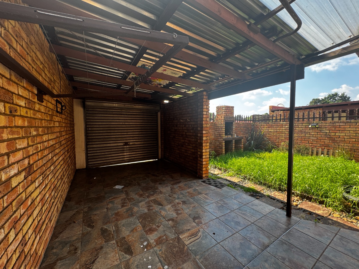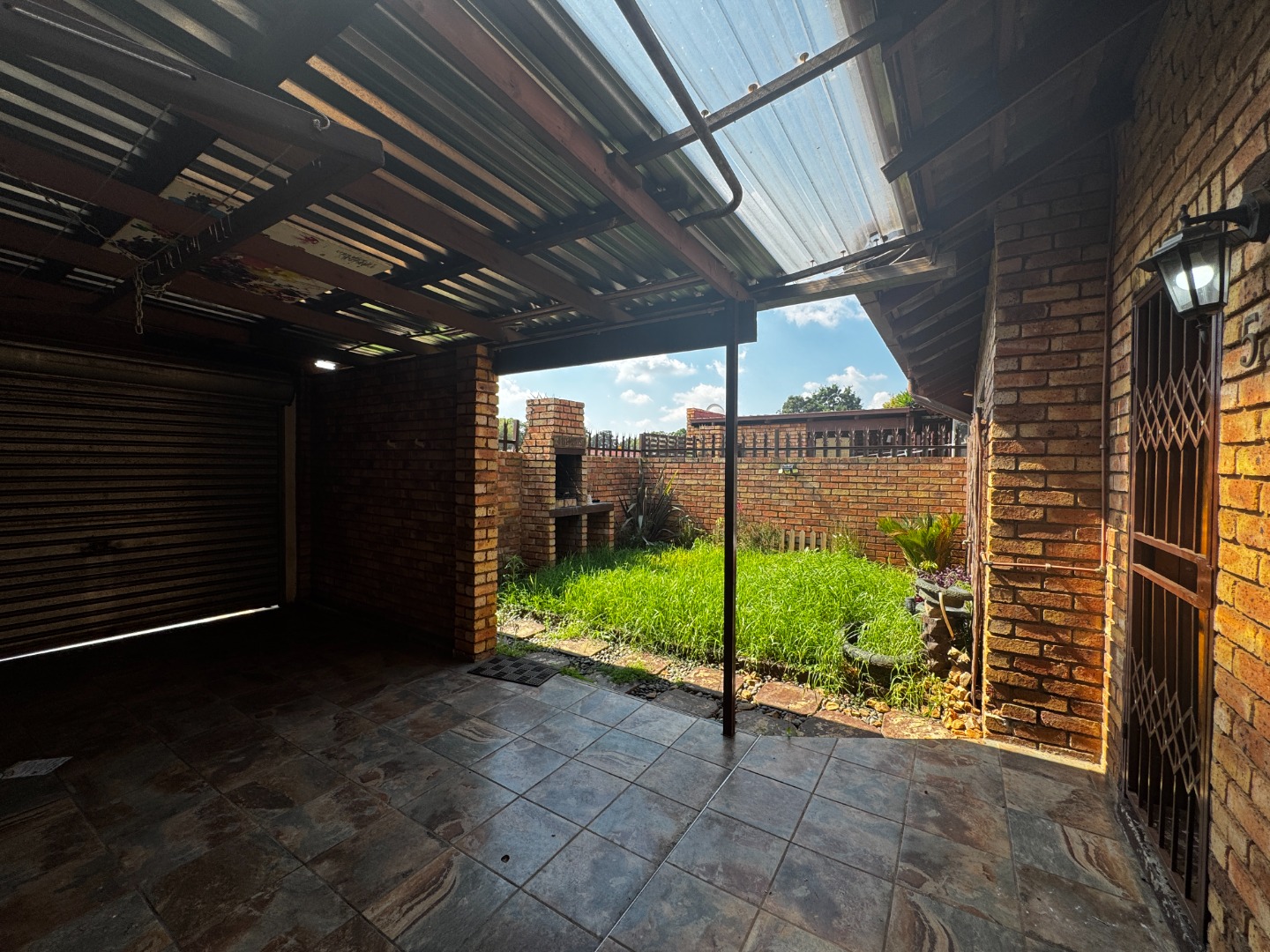 Outdoor living is a highlight, with a private garden that includes a built-in braai, perfect for weekend gatherings and relaxation. A small courtyard at the back adds extra utility, whether for laundry or storage. The property also offers a single Hollywood garage and additional open parking, ensuring secure and convenient vehicle accommodation.