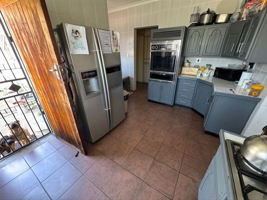 The home features a large tiled lounge and a separate dining room, providing versatile living and entertaining areas. The kitchen is generous in size, boasting tiled floors and walls, wooden cabinetry, a breakfast counter, and a gas stove, perfect for family meals.