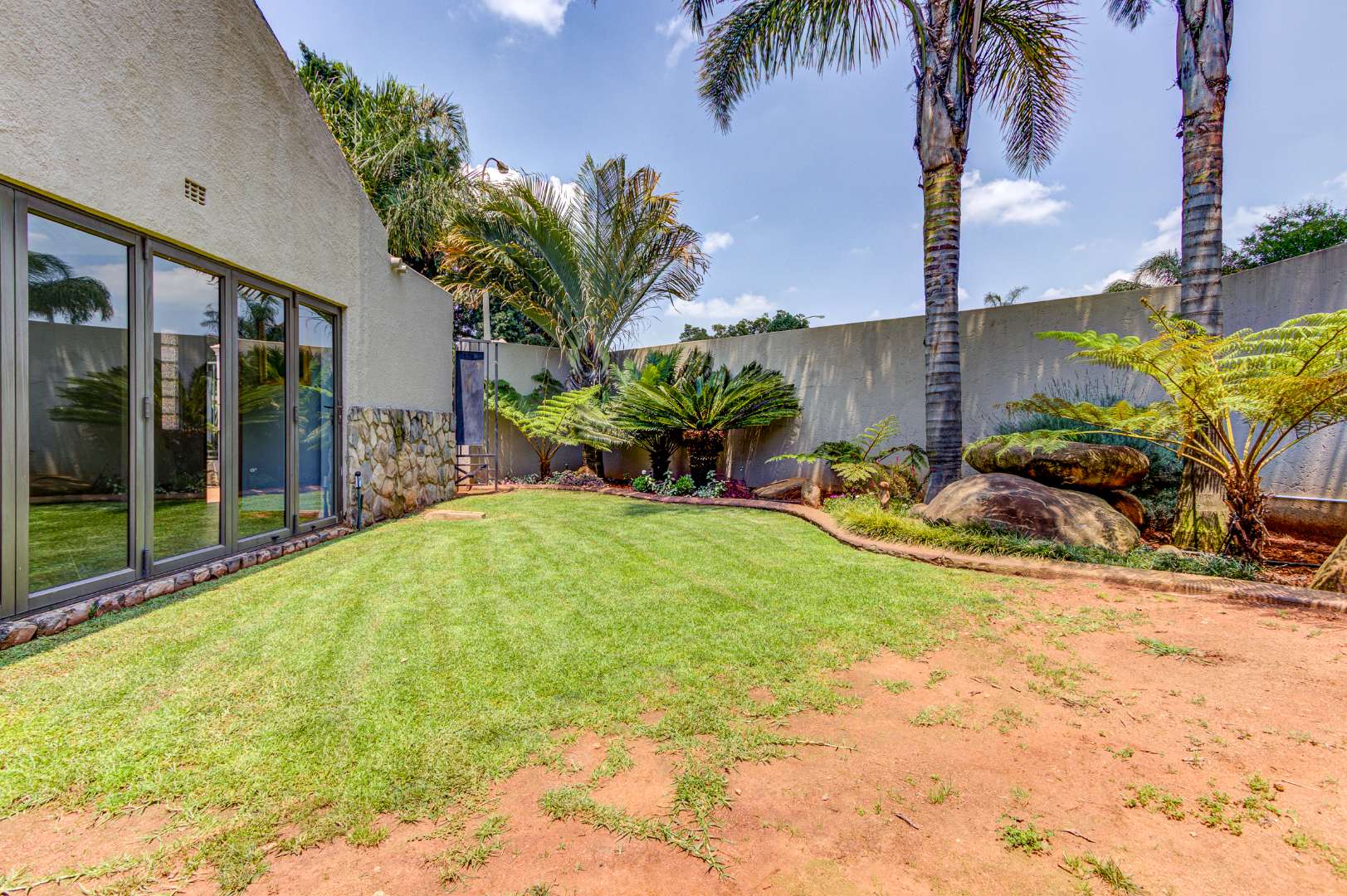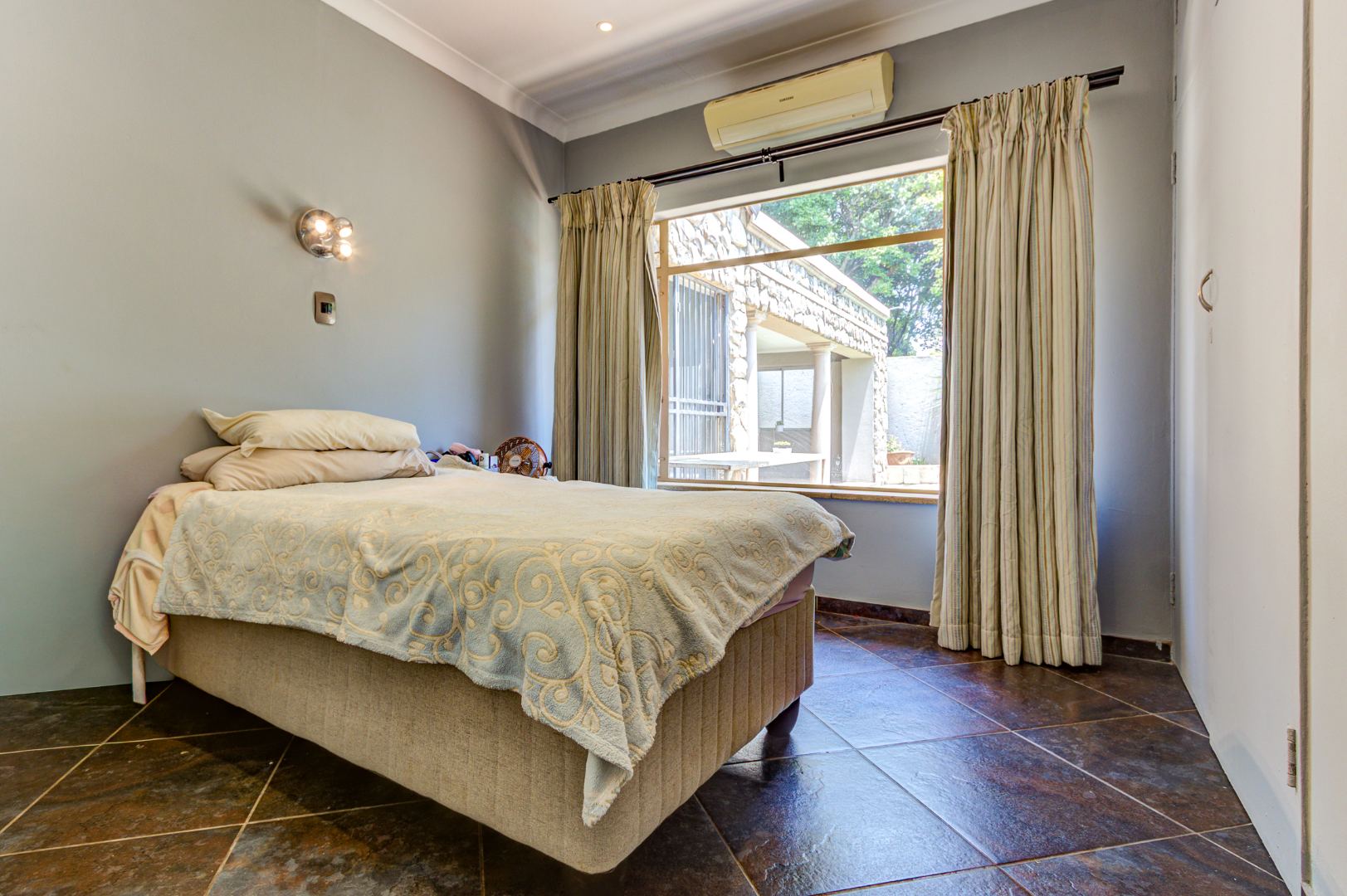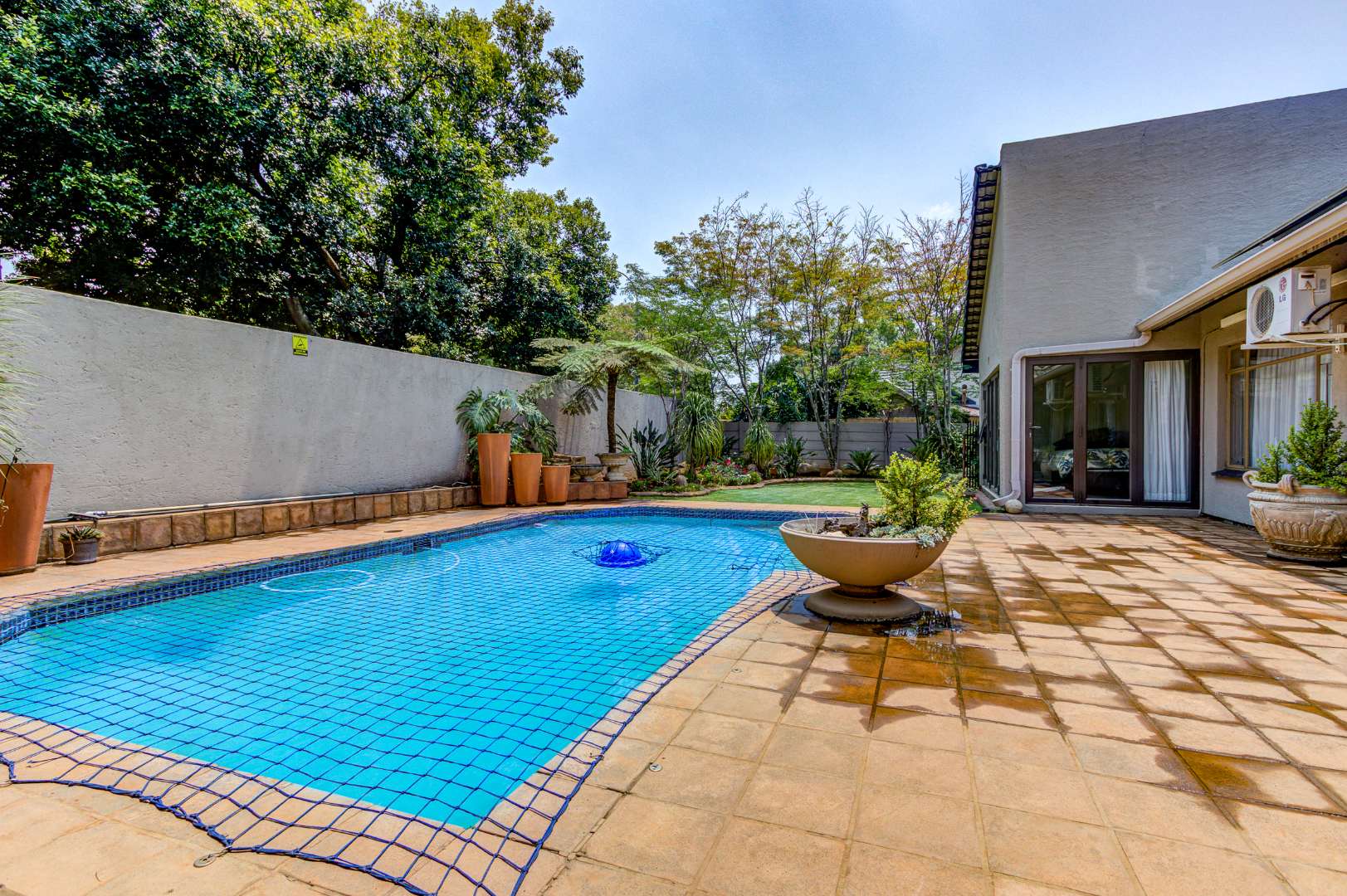 This home offers 4 tiled bedrooms and 3 bathrooms, with air conditioning in 3 bedrooms. The generous main bedroom features air conditioning, a dressing room with mirrored cupboards, stacker doors opening to the garden and a large modern en-suite bathroom with his and hers basin, corner bath and shower.