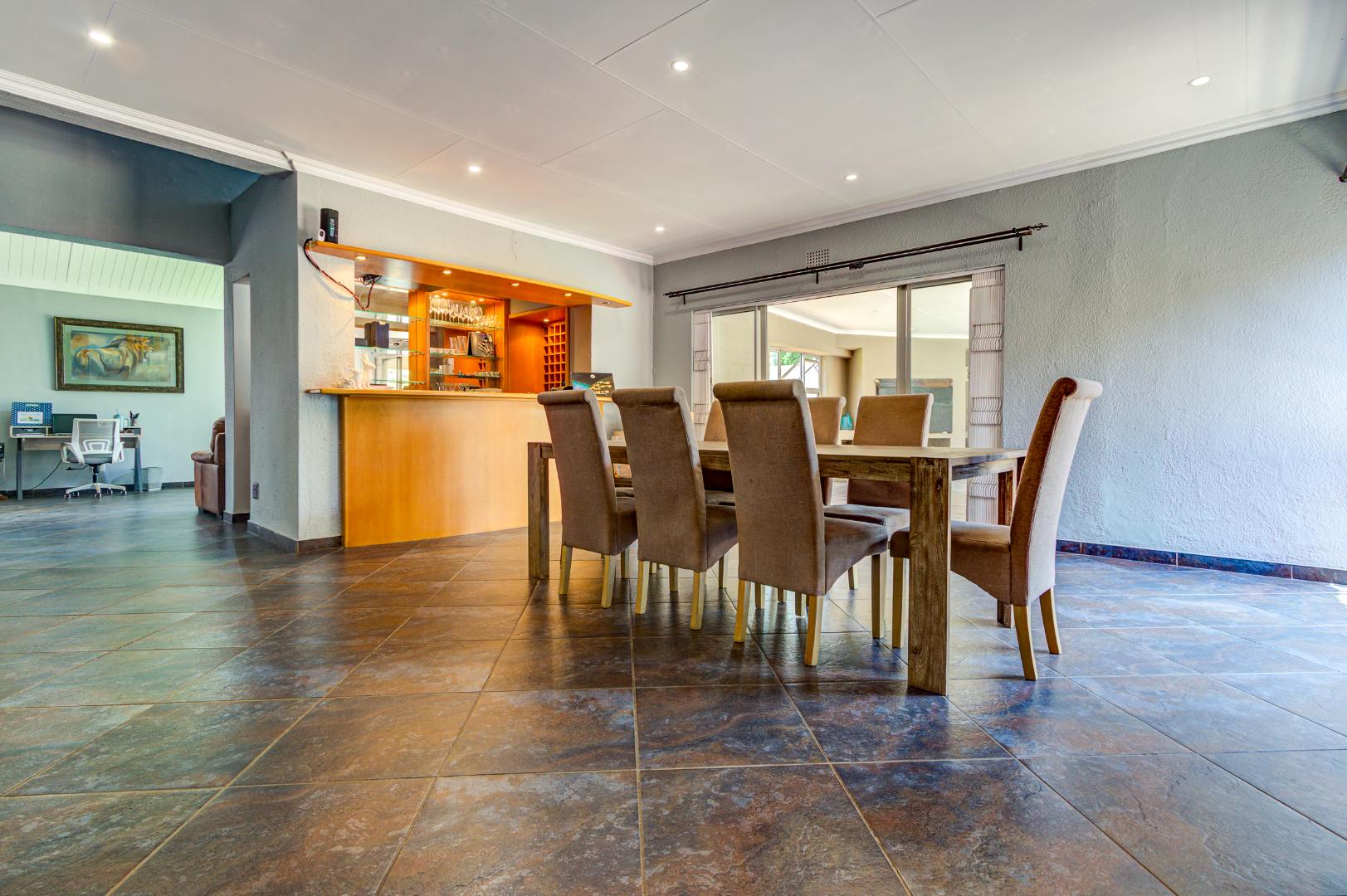 The home welcomes you with a tiled entrance leading into a large open-plan, double-volume lounge and dining area, filled with natural light and opening onto the garden. A spacious tiled family room with built-in bar counter and shelving flows seamlessly through sliding doors to the entertainment area with built-in braai, overlooking the pool area – perfect for family gatherings and entertaining.