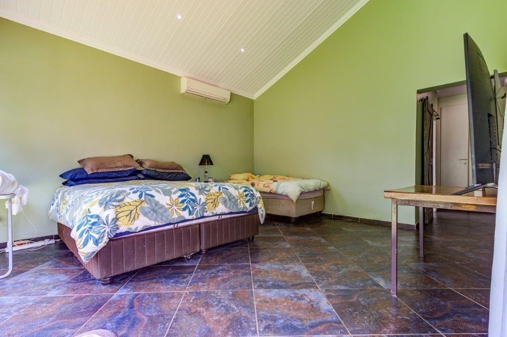 This home offers 4 tiled bedrooms and 3 bathrooms, with air conditioning in 3 bedrooms. The generous main bedroom features air conditioning, a dressing room with mirrored cupboards, stacker doors opening to the garden and a large modern en-suite bathroom with his and hers basin, corner bath and shower.