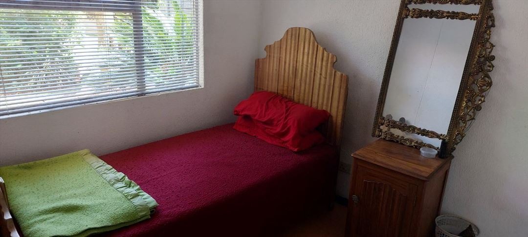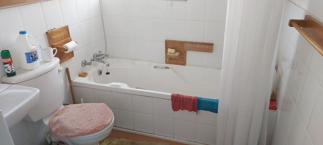 There are two bedrooms, including a large main bedroom, serviced by a neat full bathroom with a bath, shower-over-bath, toilet, and half-tiled finish.