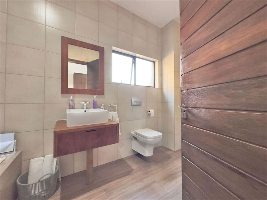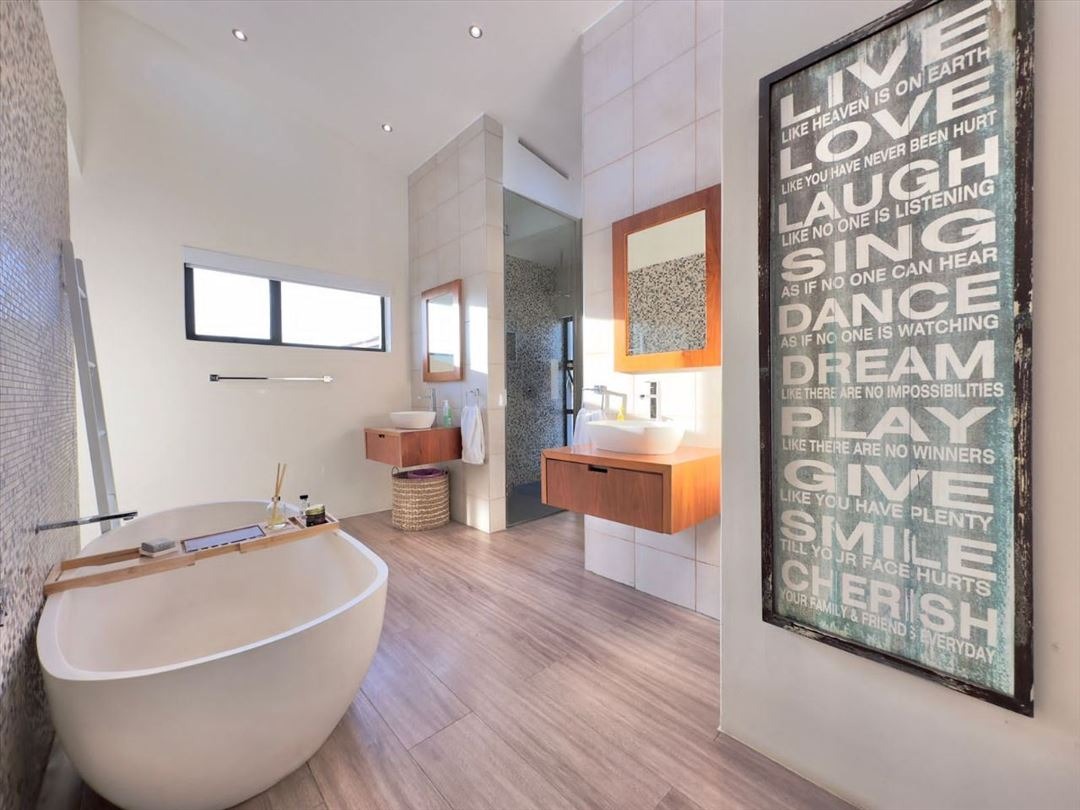 There are 4 stylish bathrooms, each tiled to the ceiling and offering a double basin, shower, vanity unit and toilet. A separate guest bathroom, also tiled to the ceiling, adds convenience.