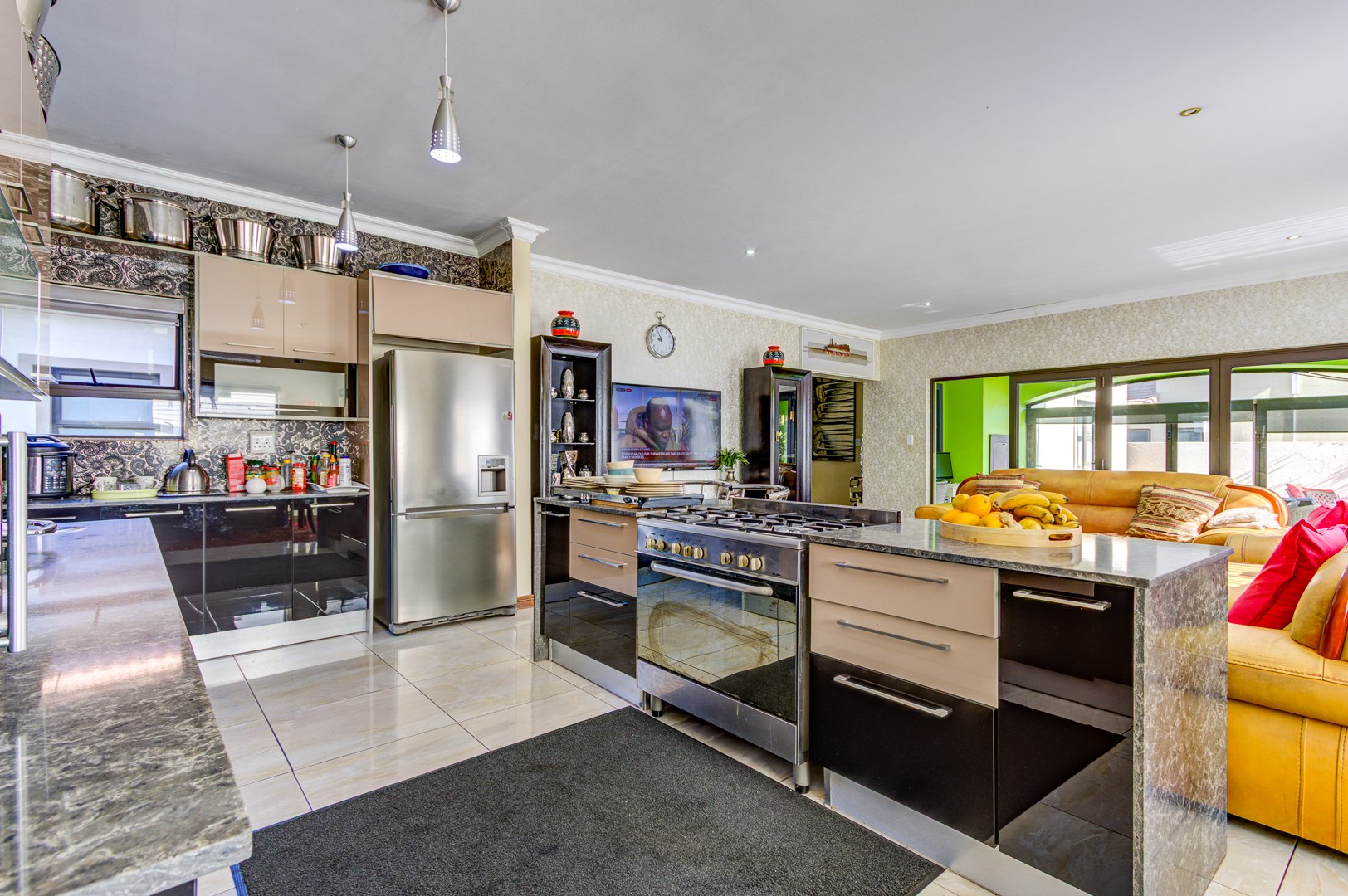 The open expensive lounge open plan, complete with a cozy fireplace, and the elegant dining room both feature large glass sliding doors that open out onto an expansive undercover patio. Equipped with a built-in braai, this outdoor area overlooks breathtaking views of the beautifully manicured garden