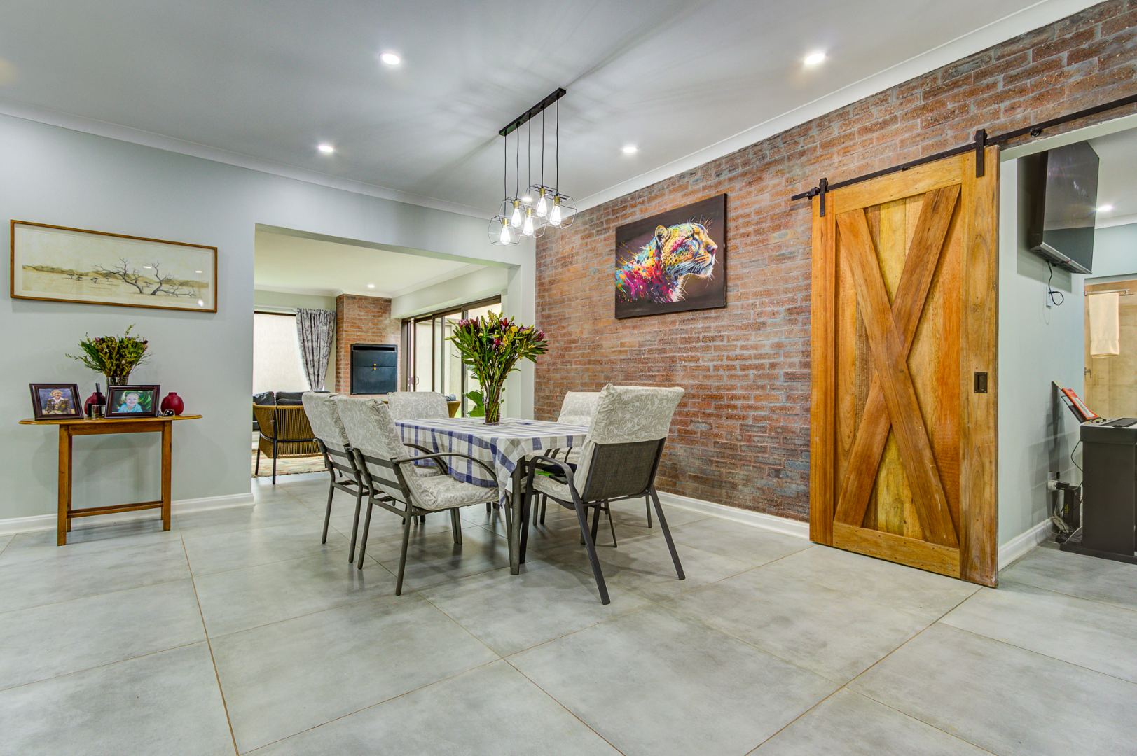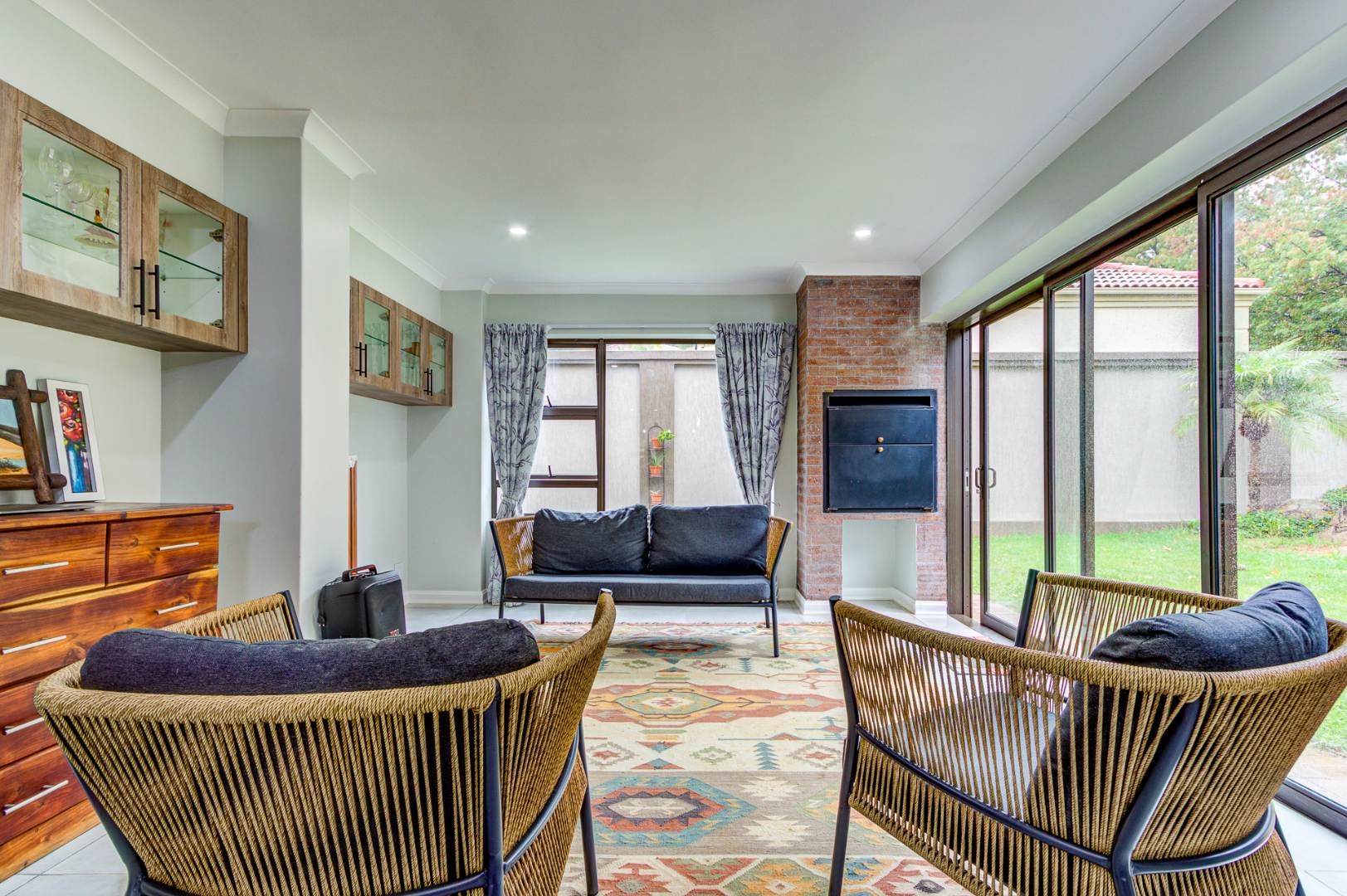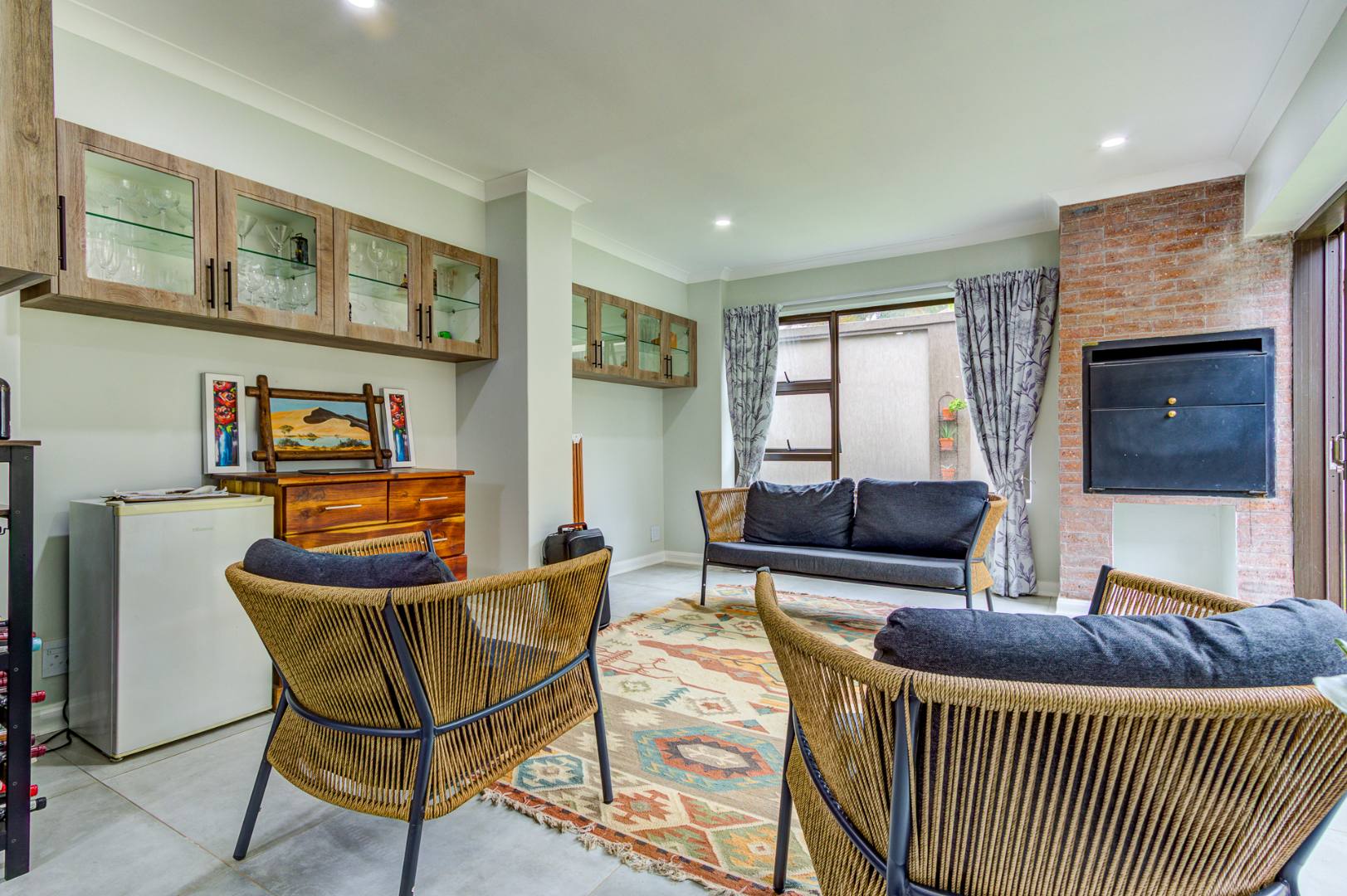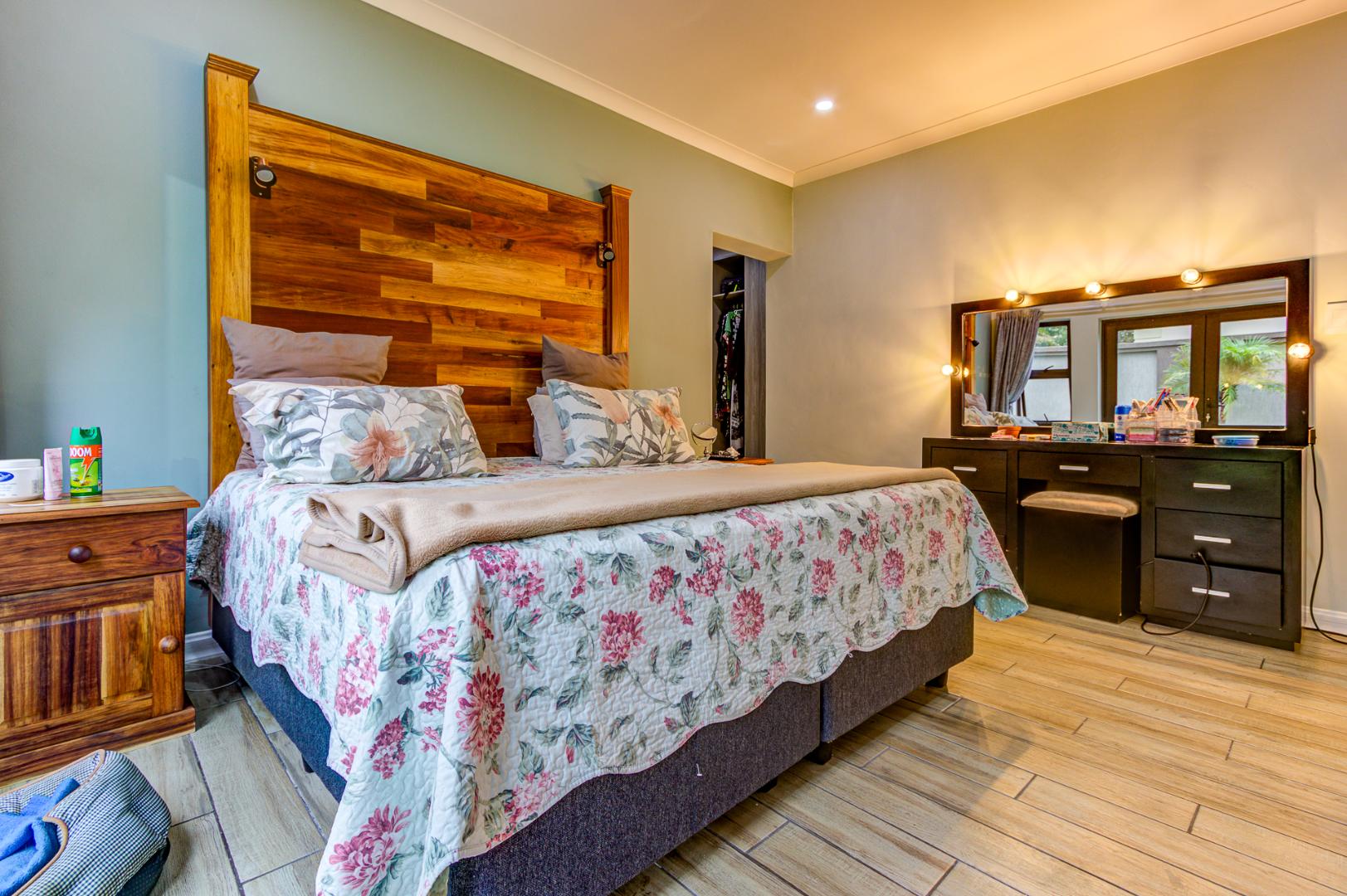 The main bedroom opens directly onto a lush, green garden and a sparkling pool, creating a tranquil retreat. The indoor entertainment area, complete with a built-in braai and sliding doors, also connects seamlessly to the outdoor space, ideal for entertaining year-round. The pool is perfectly sized, complemented by a cozy boma area where you can enjoy warm evenings around the fire.