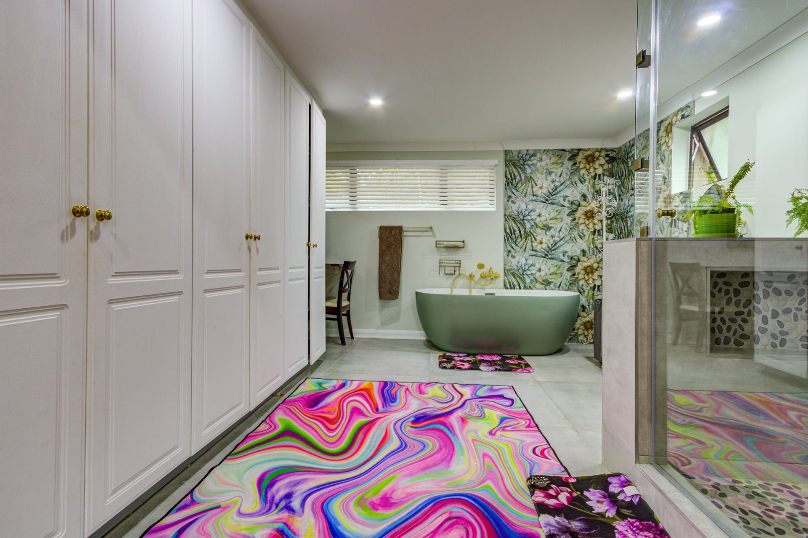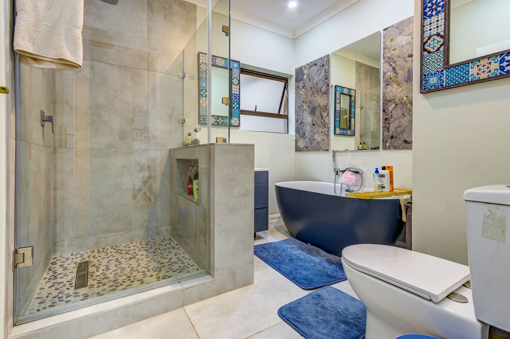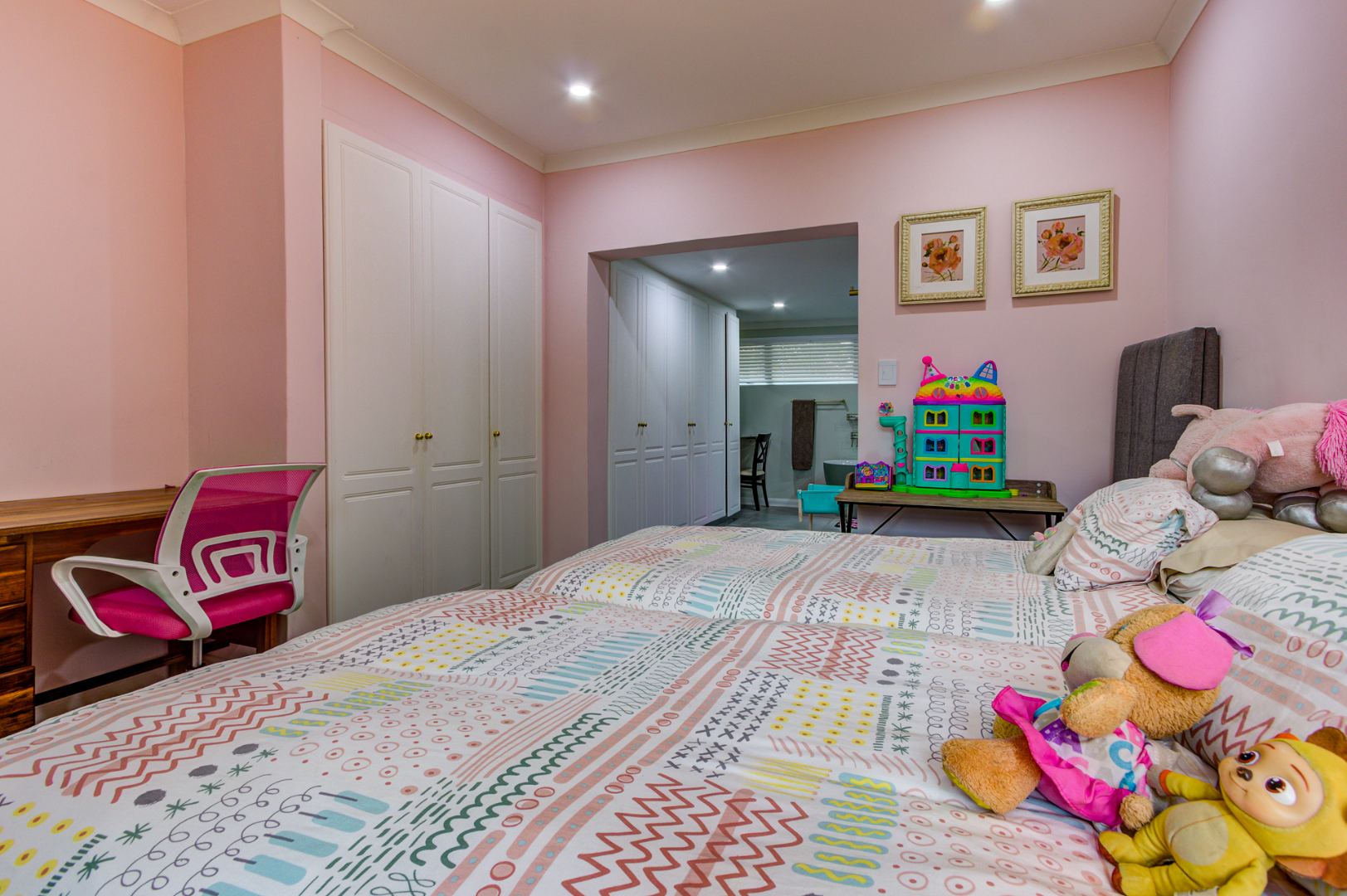 Inside, you’ll find three exceptionally spacious bedrooms and three stylish, modern bathrooms. Two of the 3 bedrooms are en-suite. The main en-suite is a true showstopper, boasting a luxurious design, generous space, and elegant dual basins. Ample built-in cupboards ensure practical and organized living.