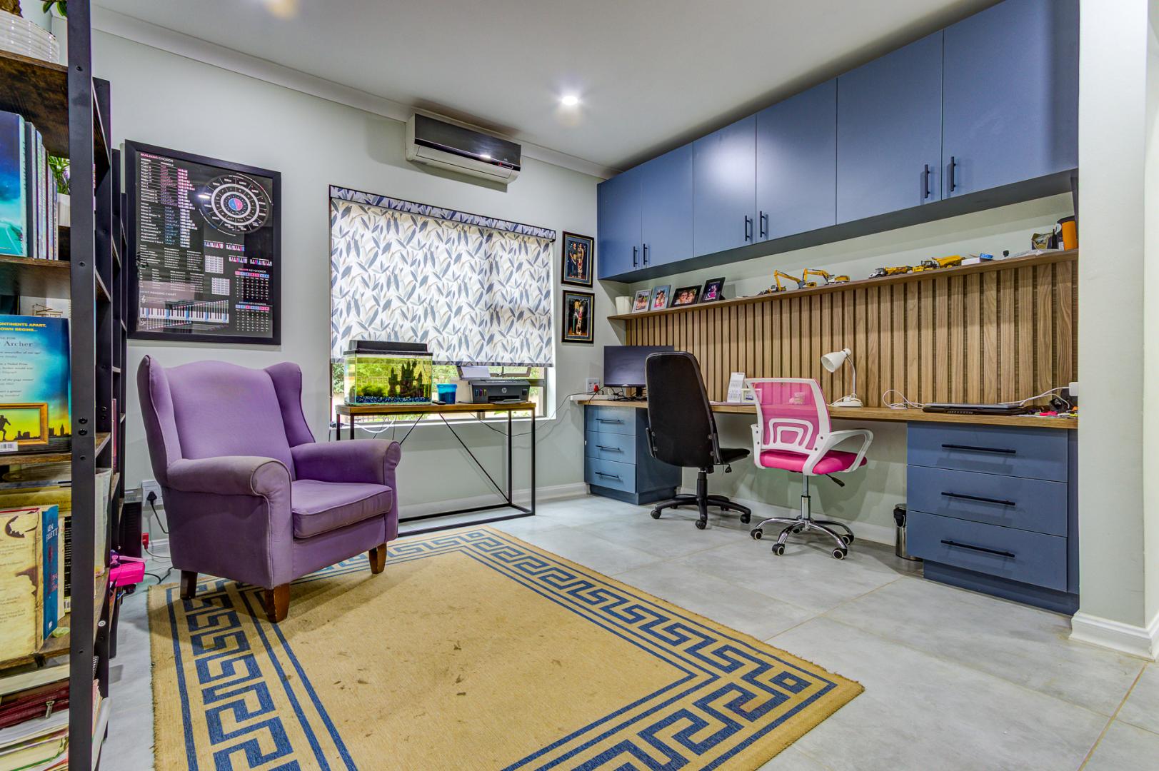 The home offers two comfortable lounges, one currently used as a study, perfect for relaxed family living or separate entertainment spaces, along with a spacious dining area that flows openly into a well-appointed kitchen. The kitchen has a separate scullery for added convenience.