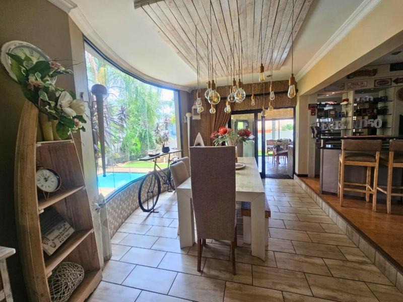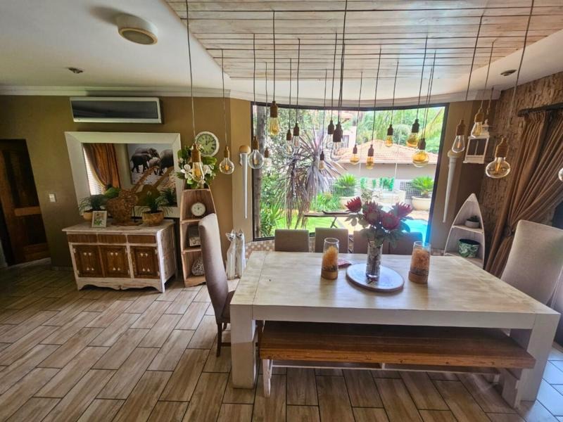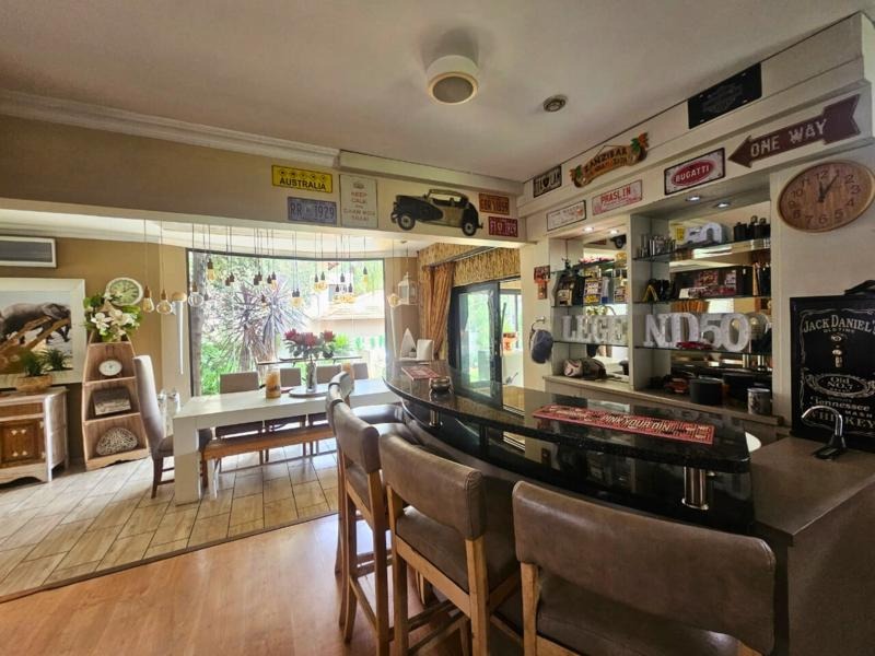 Upon arrival, an elegant entrance with a striking statement light and double glass doors sets the tone for the rest of the home. Inside, generous living spaces unfold effortlessly. Two tastefully designed lounges feature eye-catching light fittings and create inviting areas for relaxation or entertaining. The open-plan dining room, complete with a built-in bar, connects seamlessly to an enclosed patio, making it ideal for both intimate dinners and larger social gatherings.