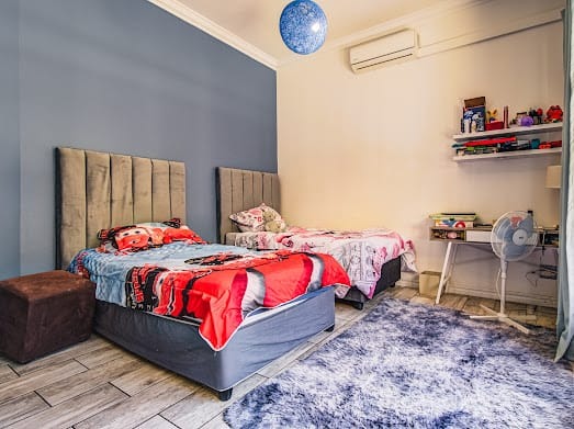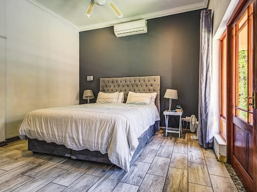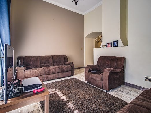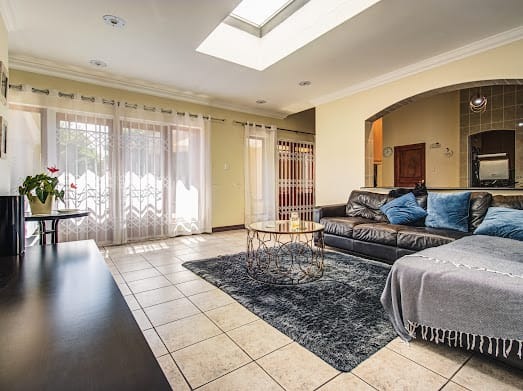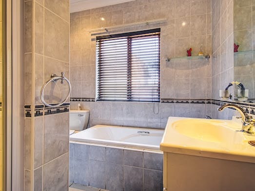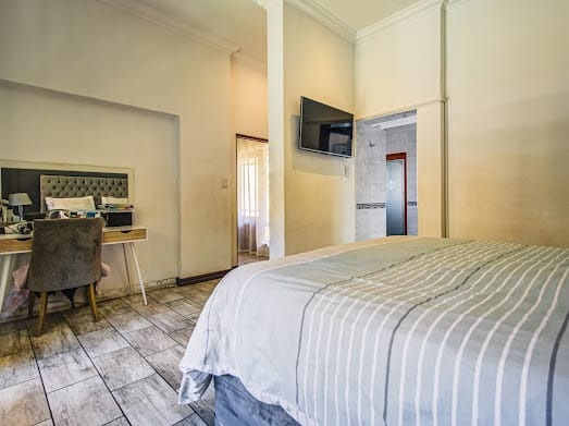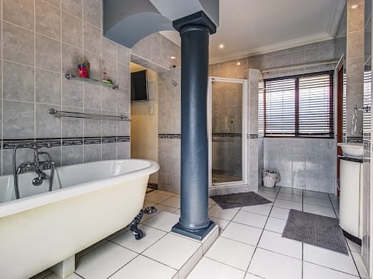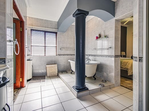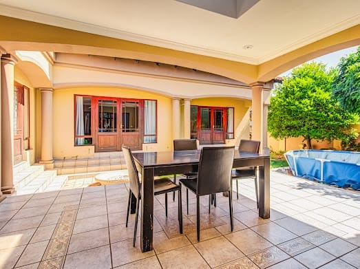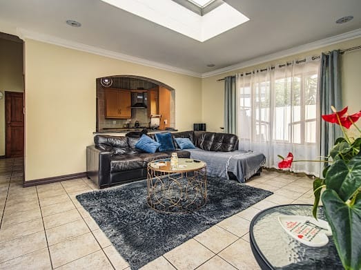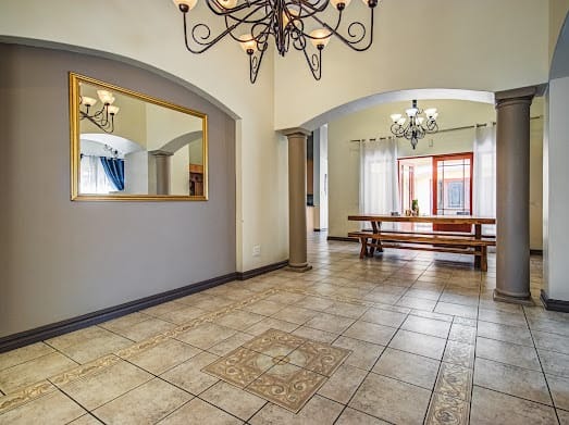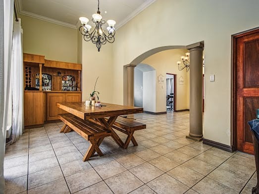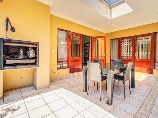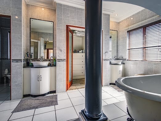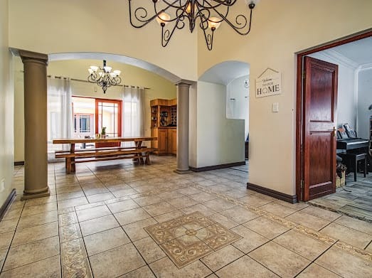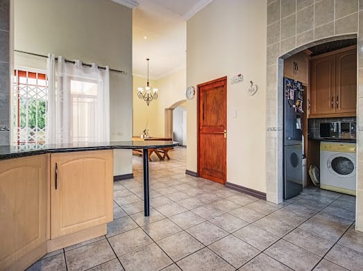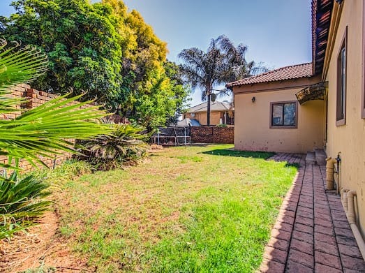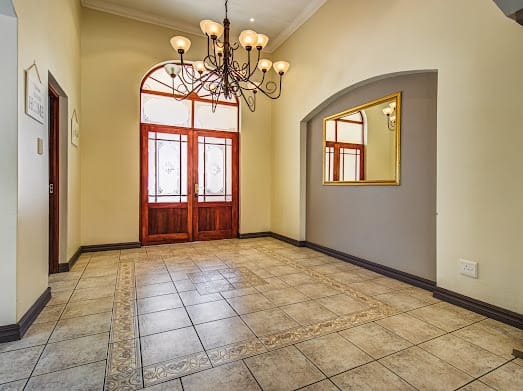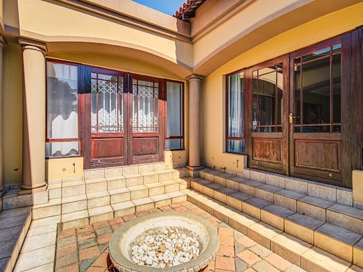 Nestled within the prestigious Glen Erasmia Estate in Kempton Park, this exquisite residence offers an unparalleled blend of classic elegance and contemporary comfort, presenting a truly aspirational lifestyle in a secure, sought-after South African locale. From the moment of arrival, the property exudes a welcoming grandeur, featuring a meticulously maintained exterior with a light-coloured stucco finish, complemented by lush green lawns and mature trees, including a stately palm. A spacious paved driveway leads to a double garage with elegant wooden doors, providing ample secure parking and storage, while a covered entrance with architectural columns sets a sophisticated tone for what lies within.