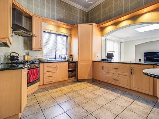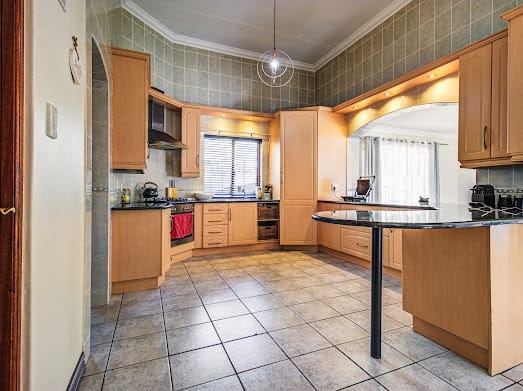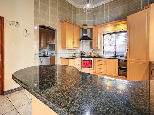 The culinary heart of this home is a spacious, U-shaped kitchen designed for both functionality and aesthetic appeal. It boasts an abundance of light wood cabinetry, offering extensive storage, beautifully contrasted by dark granite countertops. Integrated appliances, including an oven and extractor fan, ensure a seamless cooking experience. A prominent island/peninsula serves as a versatile breakfast bar or additional prep space, while a sink positioned under a window invites natural light. The kitchen's durable tiled flooring and tiled backsplash ensure easy maintenance, and an archway leads to an adjacent utility area, providing practical space for a dishwasher and other essentials. This thoughtful layout ensures that the kitchen remains a central, yet highly efficient, hub for daily living and entertaining.