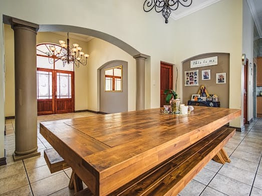 Step through the magnificent double doors, adorned with decorative glass, into a grand entryway that immediately captivates with its soaring high ceilings and an ornate chandelier casting a warm, inviting glow. The decorative tiled flooring underfoot adds a touch of timeless character, leading the eye through elegant arched elements and towards a large, statement mirror. This expansive entrance hall seamlessly transitions into the heart of the home, where an open-plan design fosters a sense of fluidity and connection. The spacious dining area, graced by high ceilings and further ornate chandeliers, is perfectly appointed for lavish entertaining, featuring a rustic solid wooden dining set and a functional built-in wooden bar, ideal for hosting intimate gatherings or grand celebrations. Decorative pillars and archways define the various living zones, enhancing the architectural interest and creating a harmonious flow throughout.