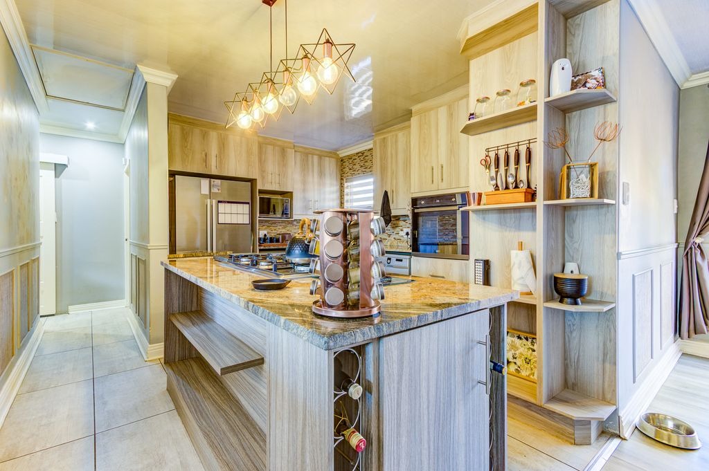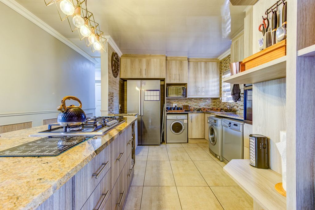 * Modern kitchen with a gas stove, electric oven, and ample cupboard space, granite tops, and space for all electric appliances.