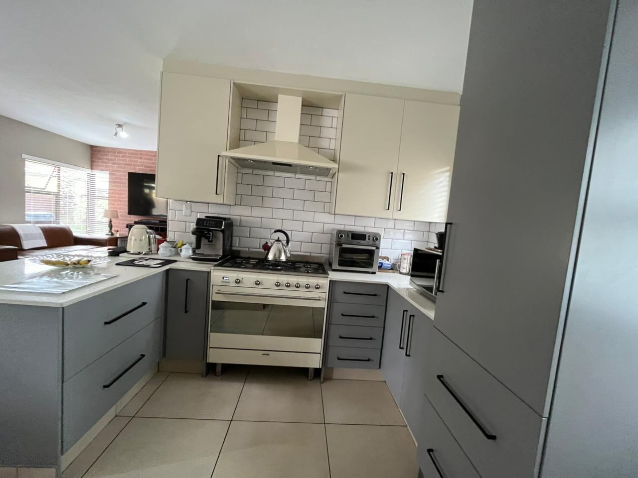 The newly renovated open-plan kitchen boasts granite countertops, a breakfast counter, sleek cabinetry, tiled walls and floors, and a gas stove with extractor. A practical scullery area adds extra convenience and storage.
