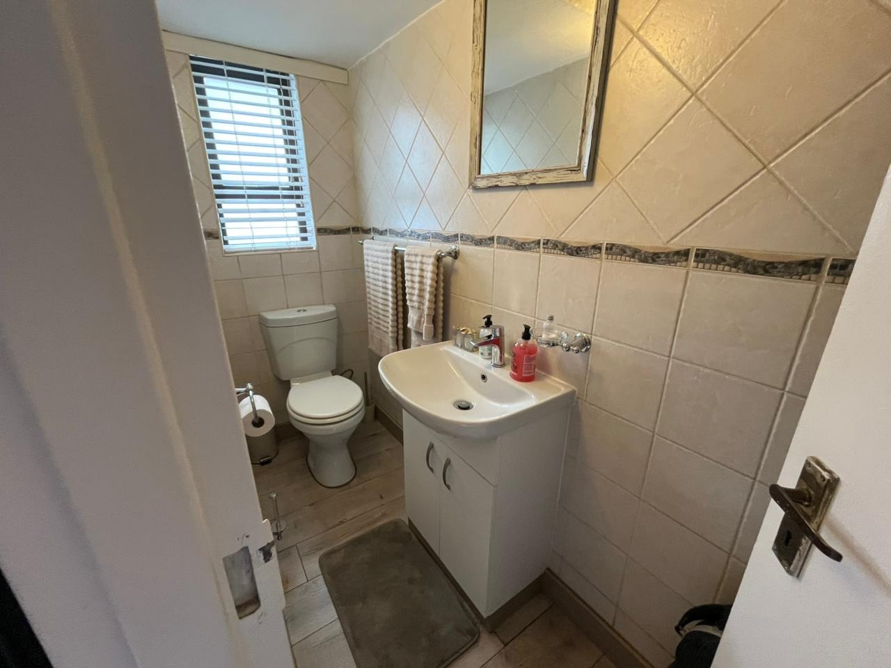 A welcoming tiled entrance hall leads into the expansive open-plan lounge and dining area, featuring large proportions, modern tiling, and a cosy fireplace—perfect for family living. The lounge flows seamlessly to the outdoor space, while the guest loo is conveniently positioned and finished with modern tiles to the ceiling.