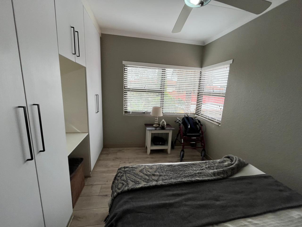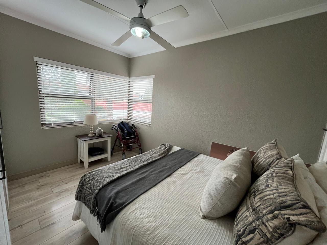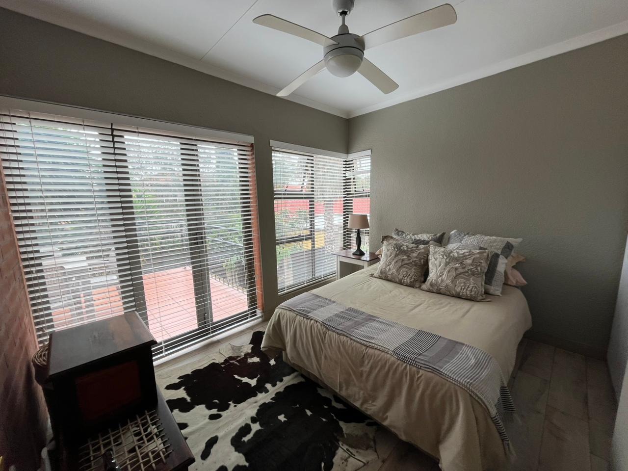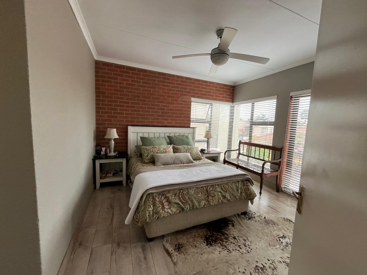 The home offers 3 well-sized bedrooms, all tiled and fitted with blinds, ceiling fans, TV connections, and access to a private balcony.