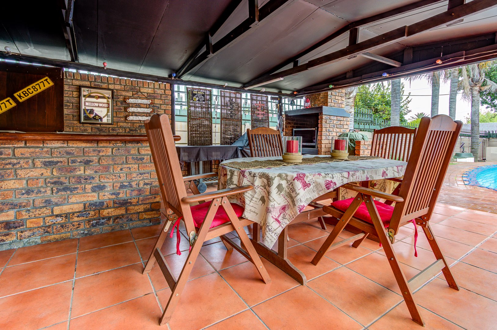 Outside, the home truly comes into its own as an entertainer’s haven. The swimming pool and boma area create the perfect setting for relaxed weekends and memorable evenings with friends and family. A covered patio with a built-in braai and bar extends the entertainment options even further, while an additional open patio area gives you extra outdoor space to enjoy the garden and peaceful surroundings.